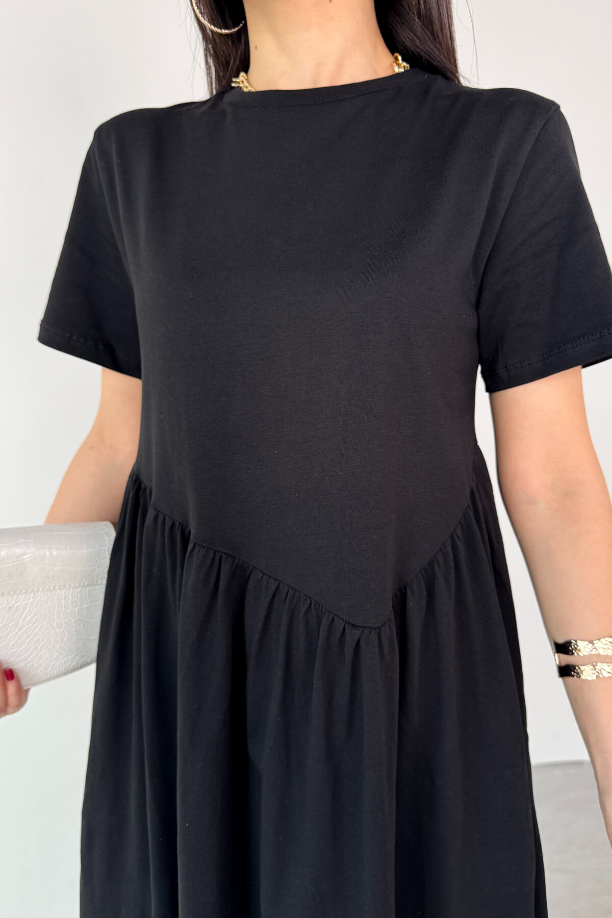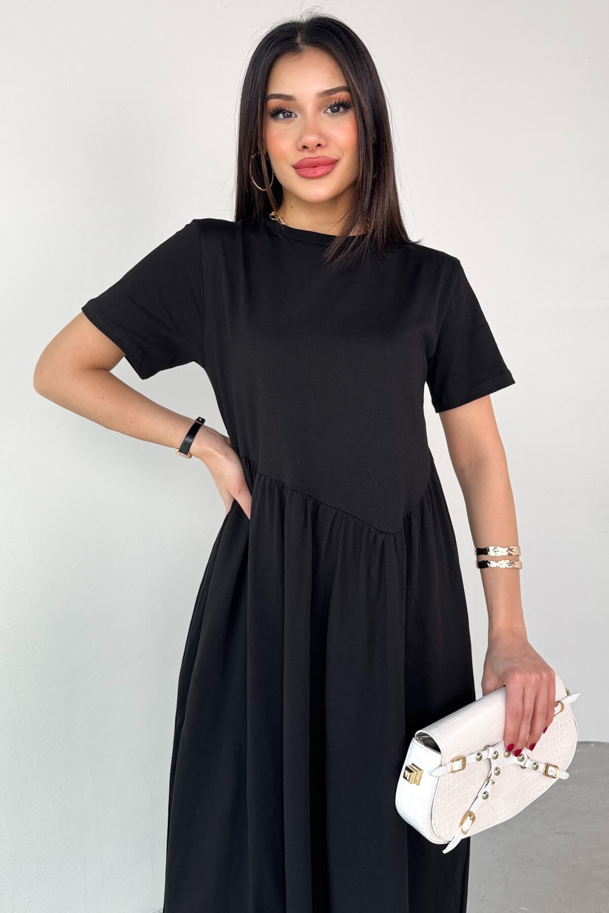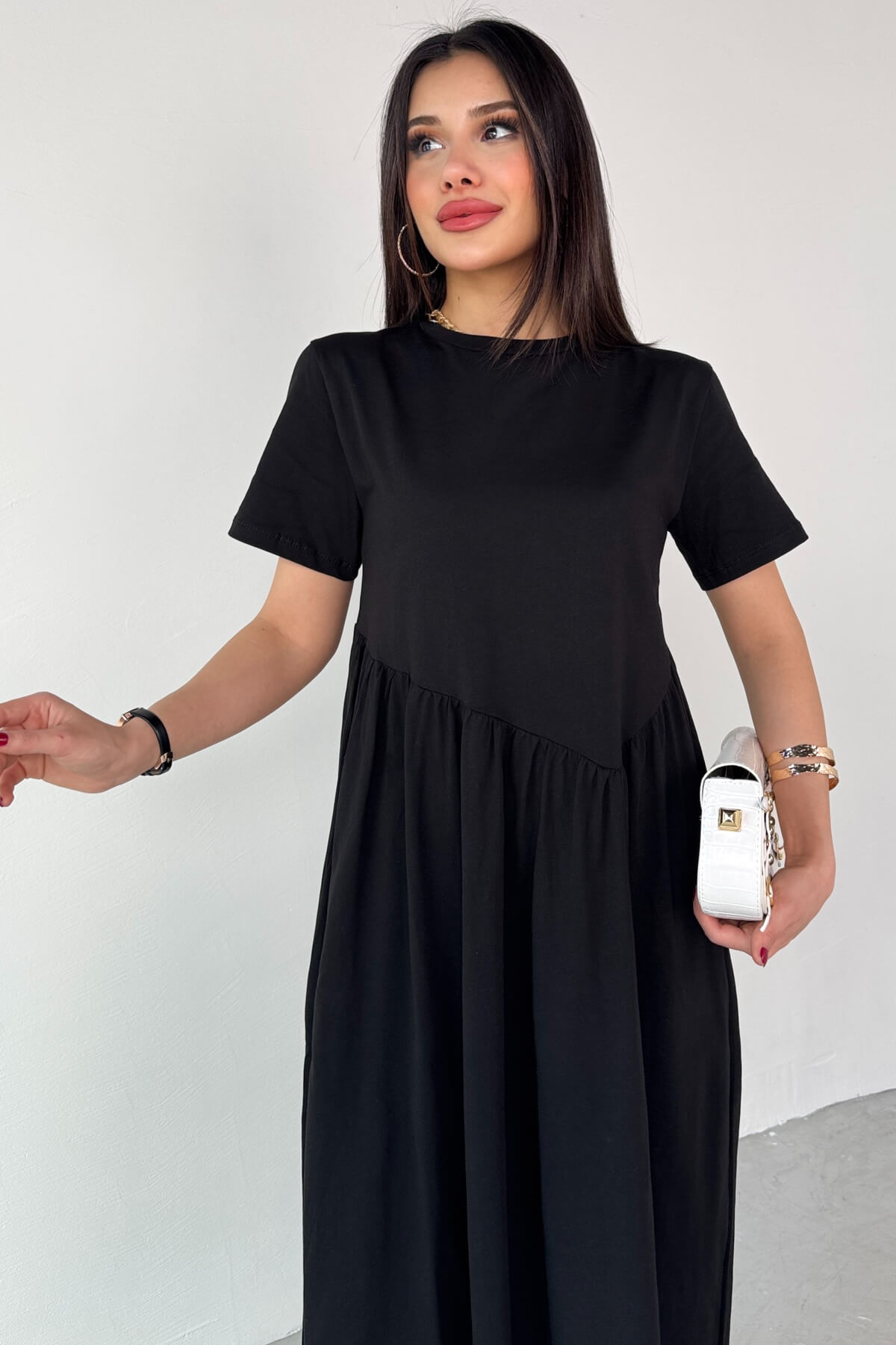 Elbise midi boy, kısa kollu ve bel pile detaylarına sahiptir.