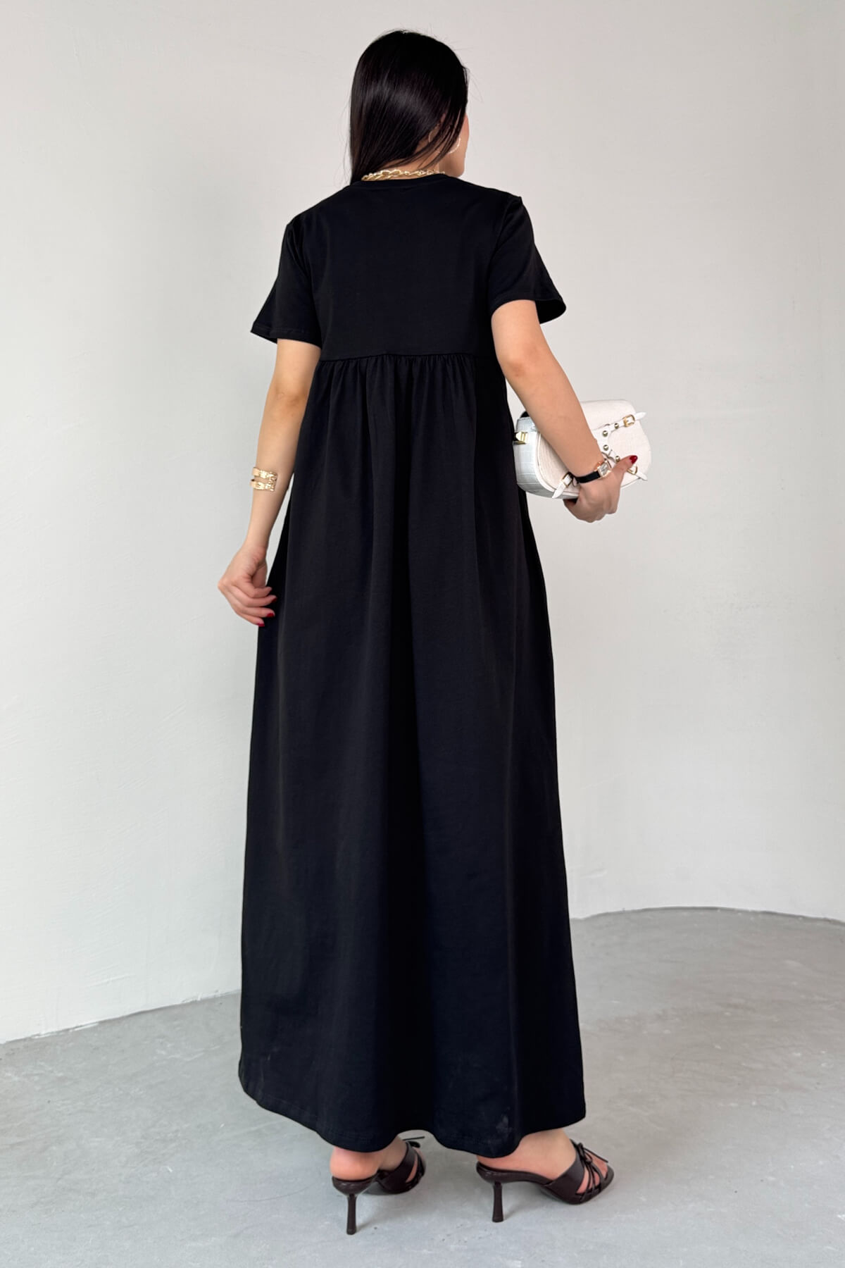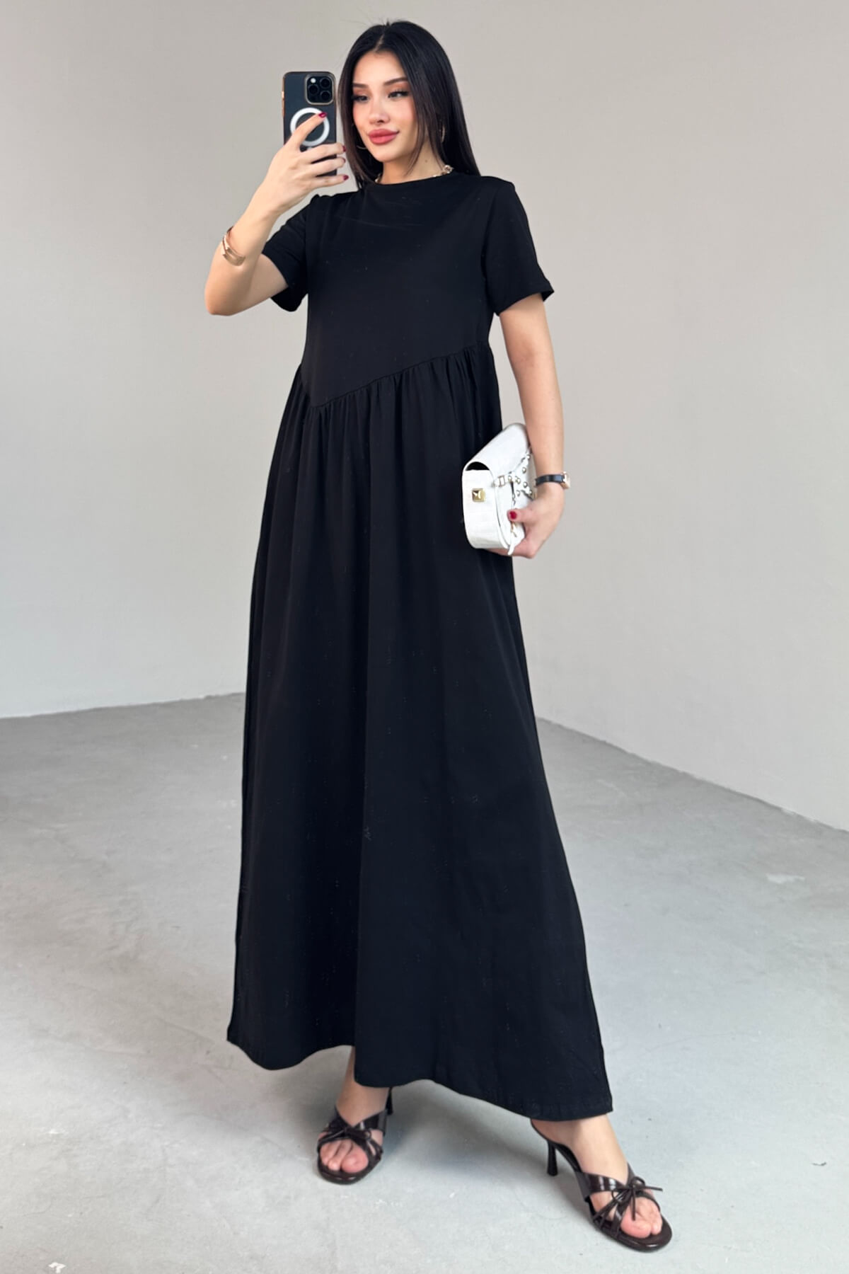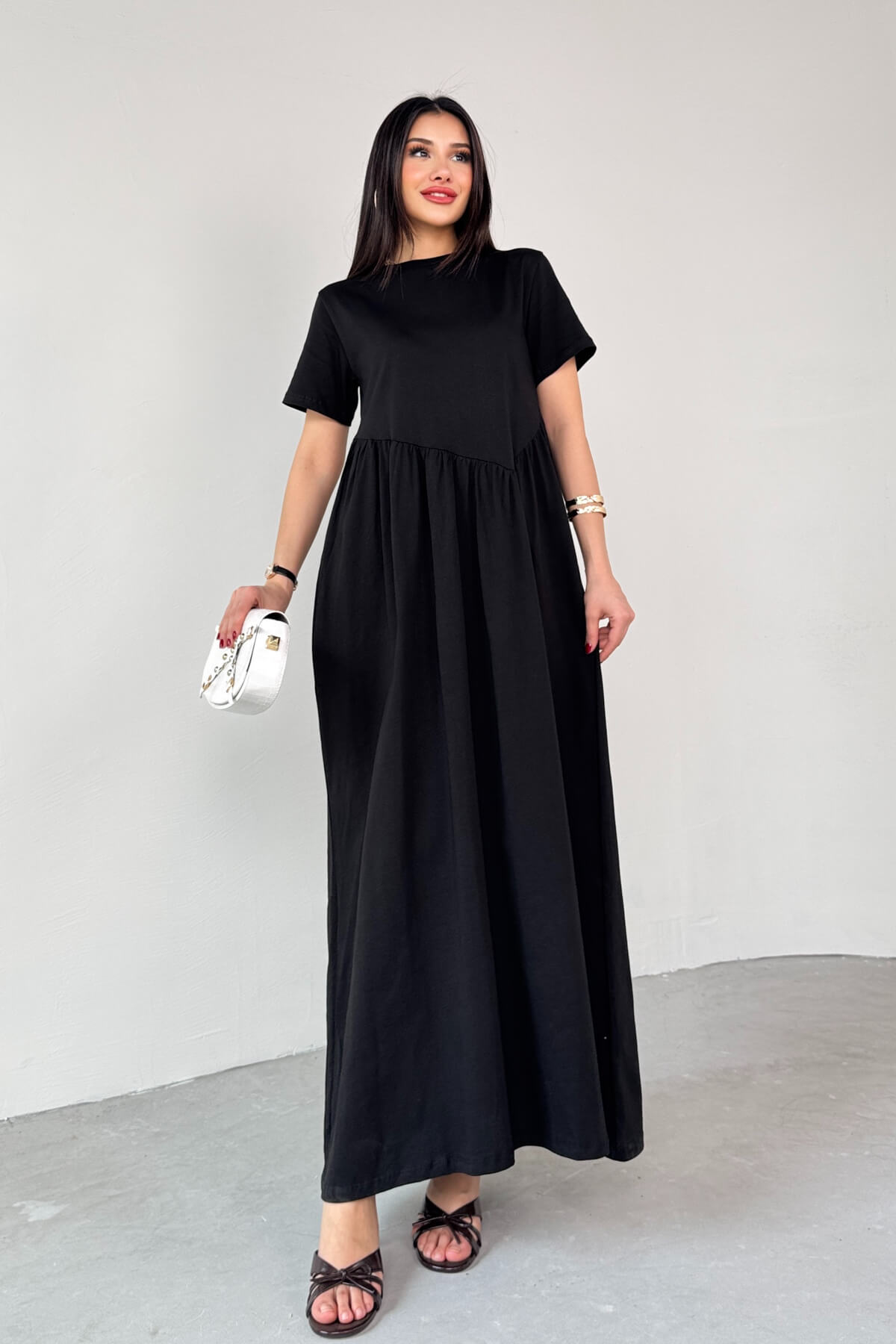 Elbise midi boy, kısa kollu ve bel pile detaylarına sahiptir.