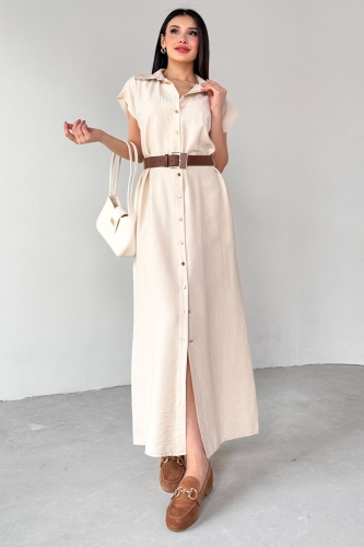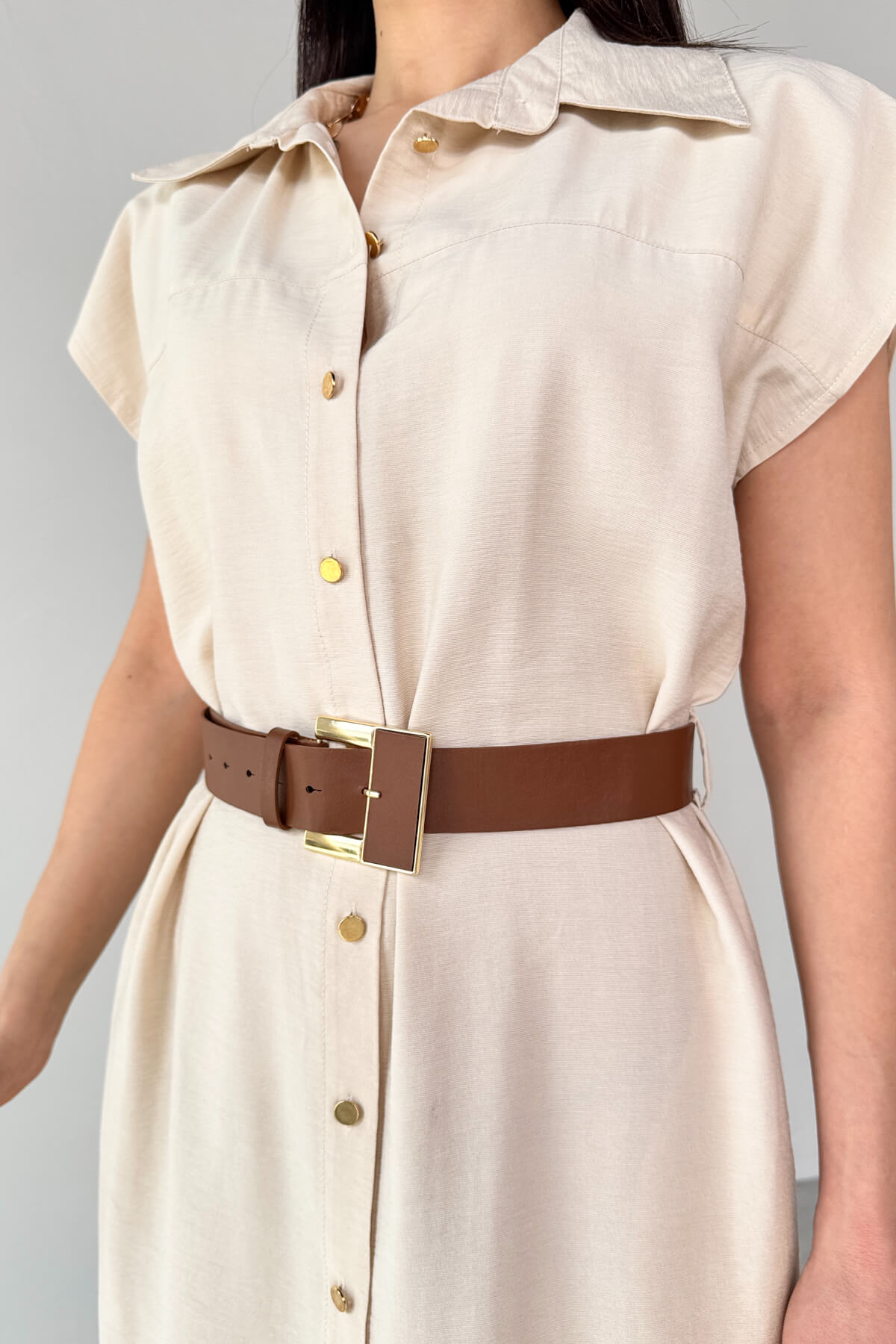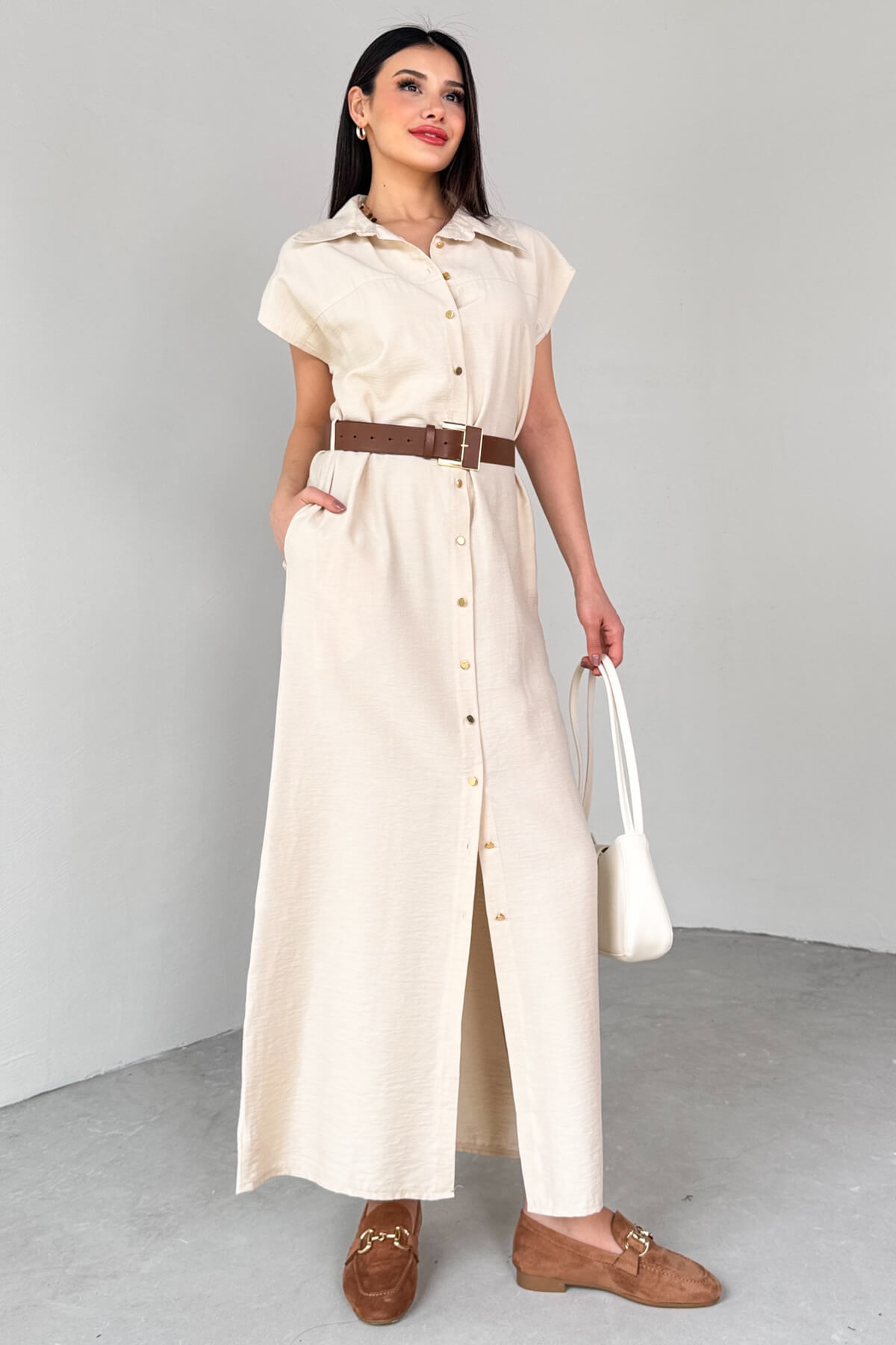 Elbise gold düğme detaylıdır. Kemer elbiseye dahildir. İç göstermez.