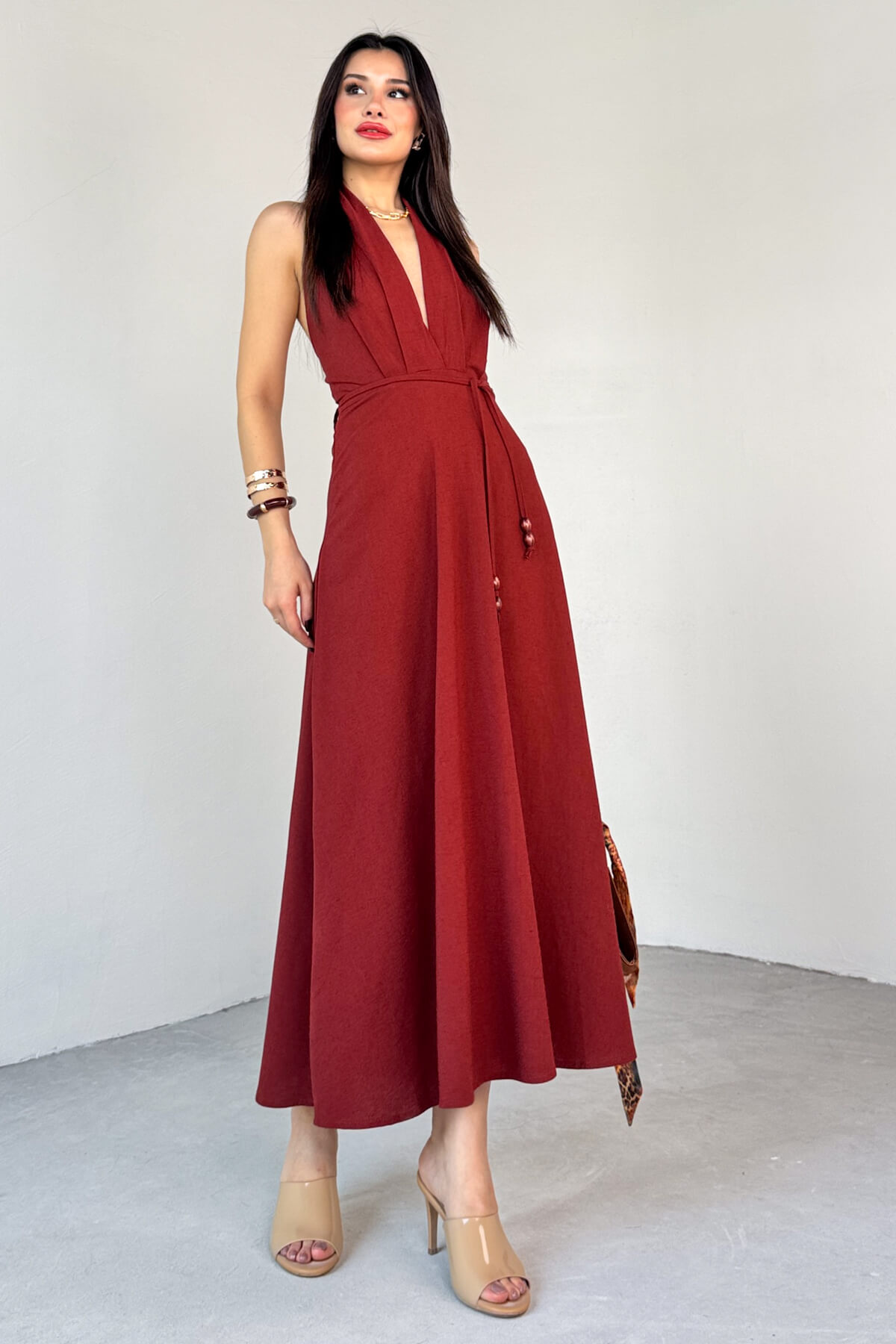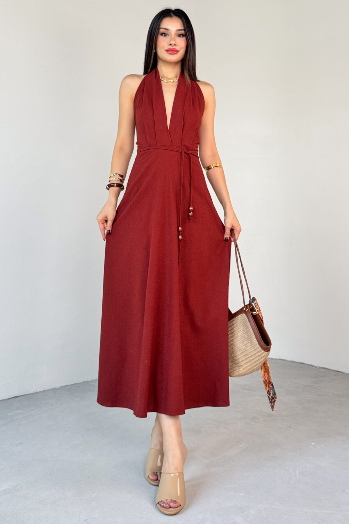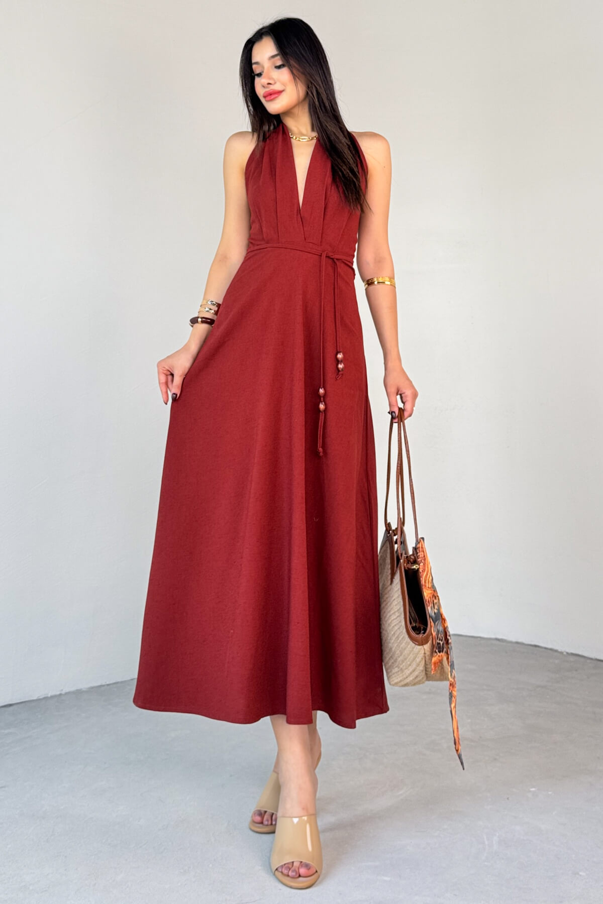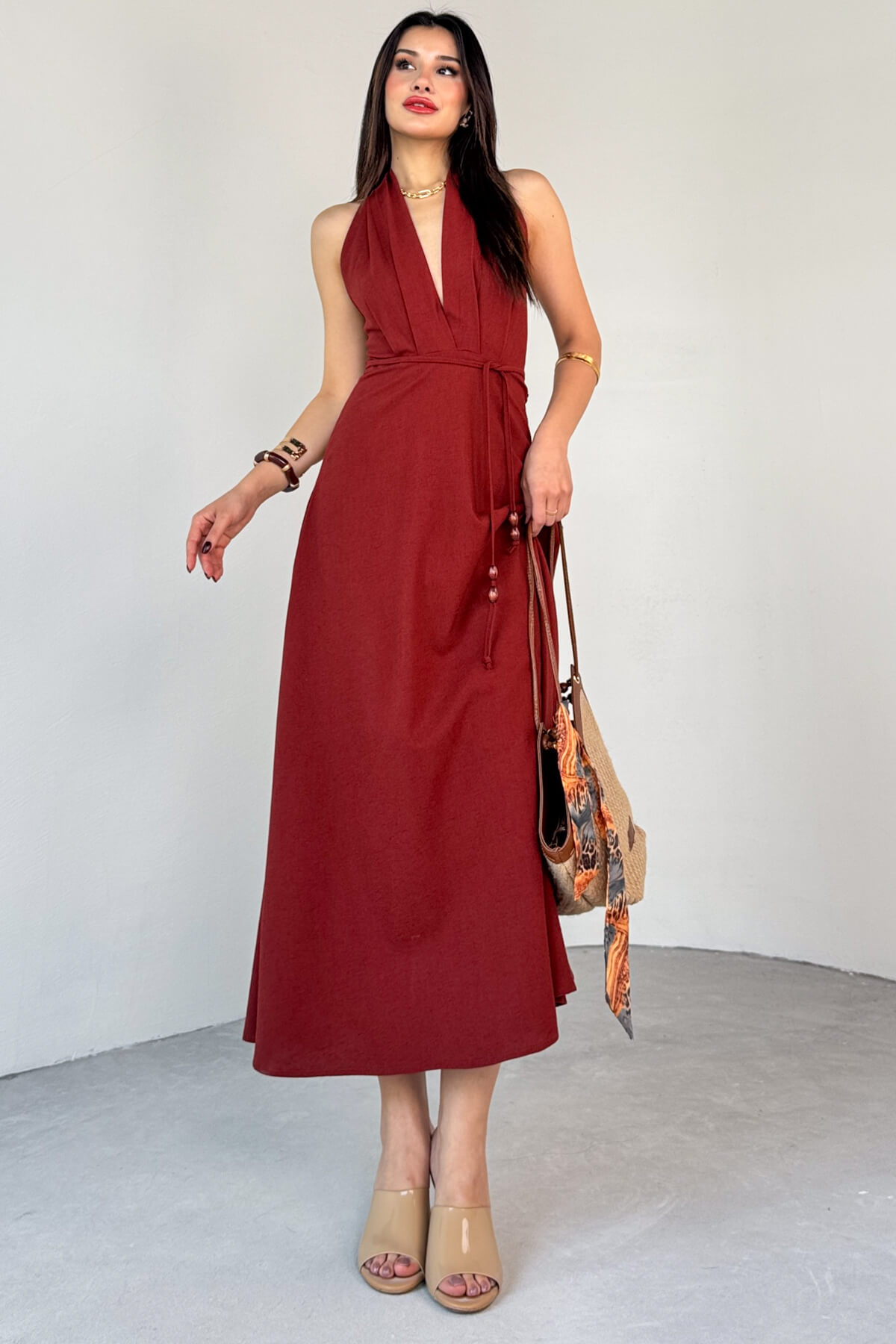 ELB-01787 Kiremit Sırt Dekolteli İnce Kemer Detaylı Keten Yazlık Elbise
