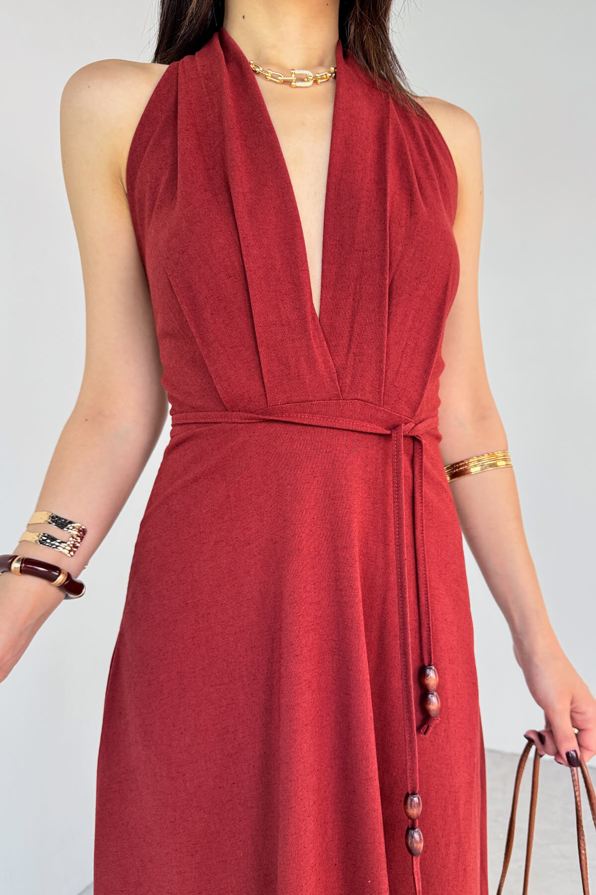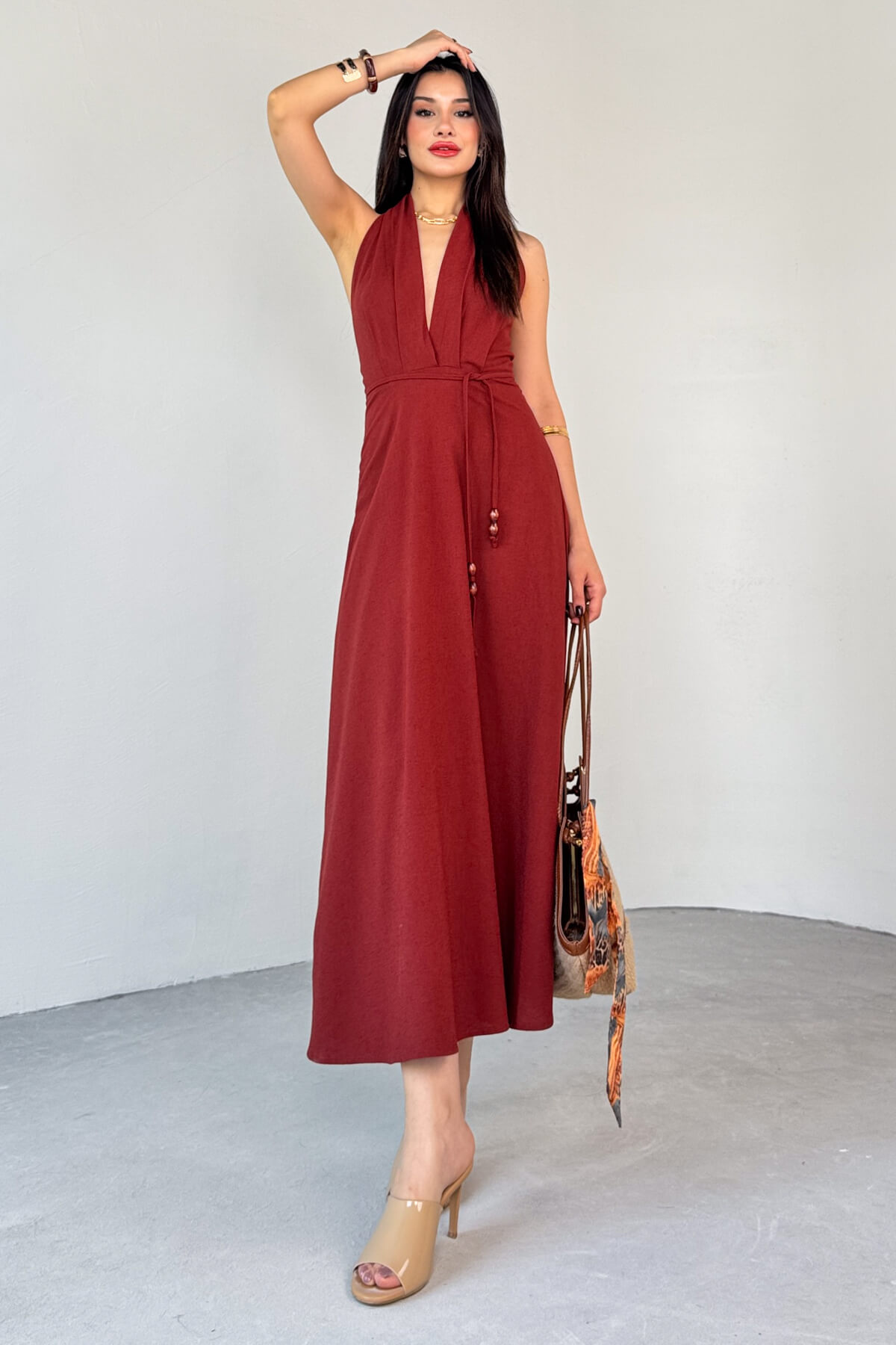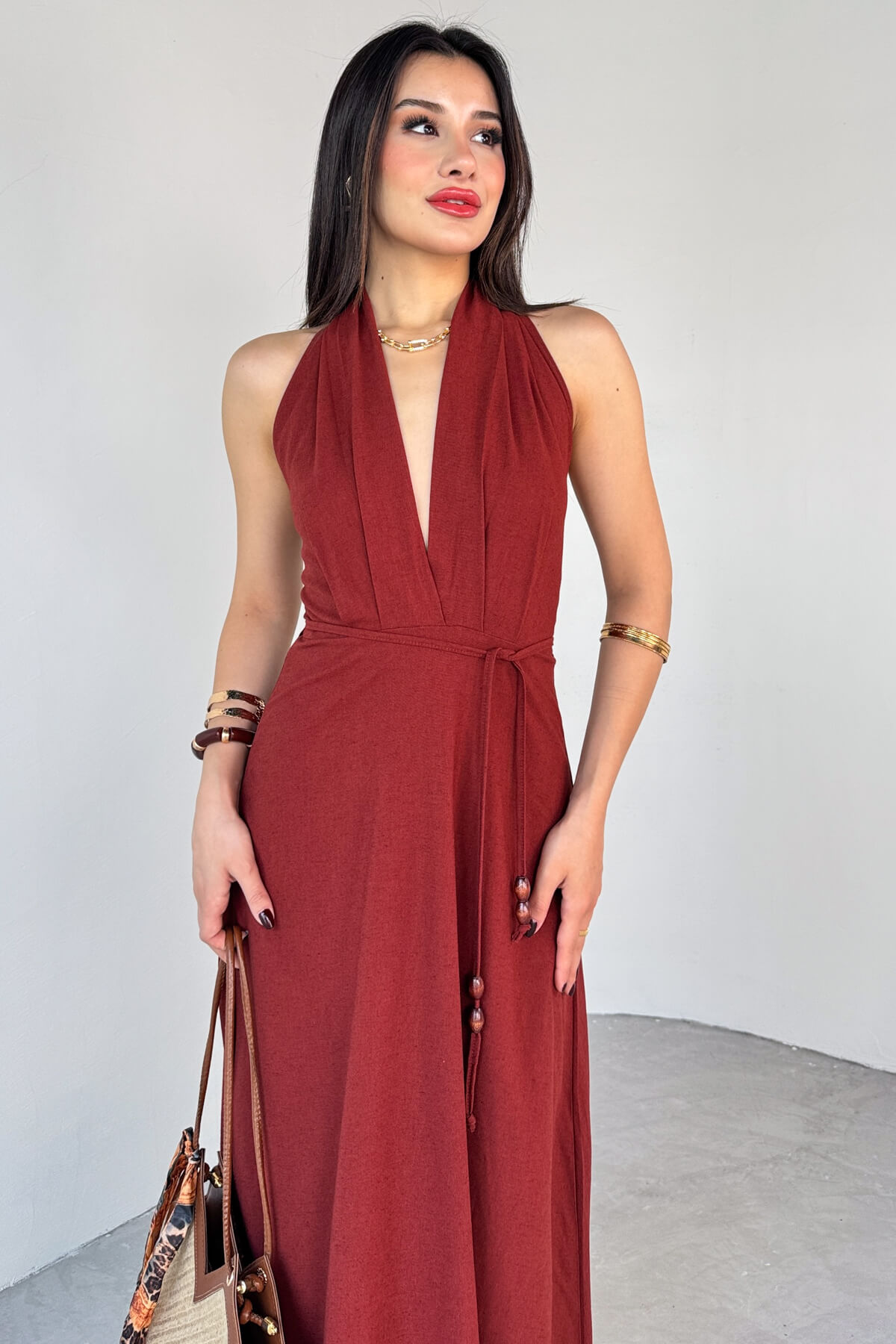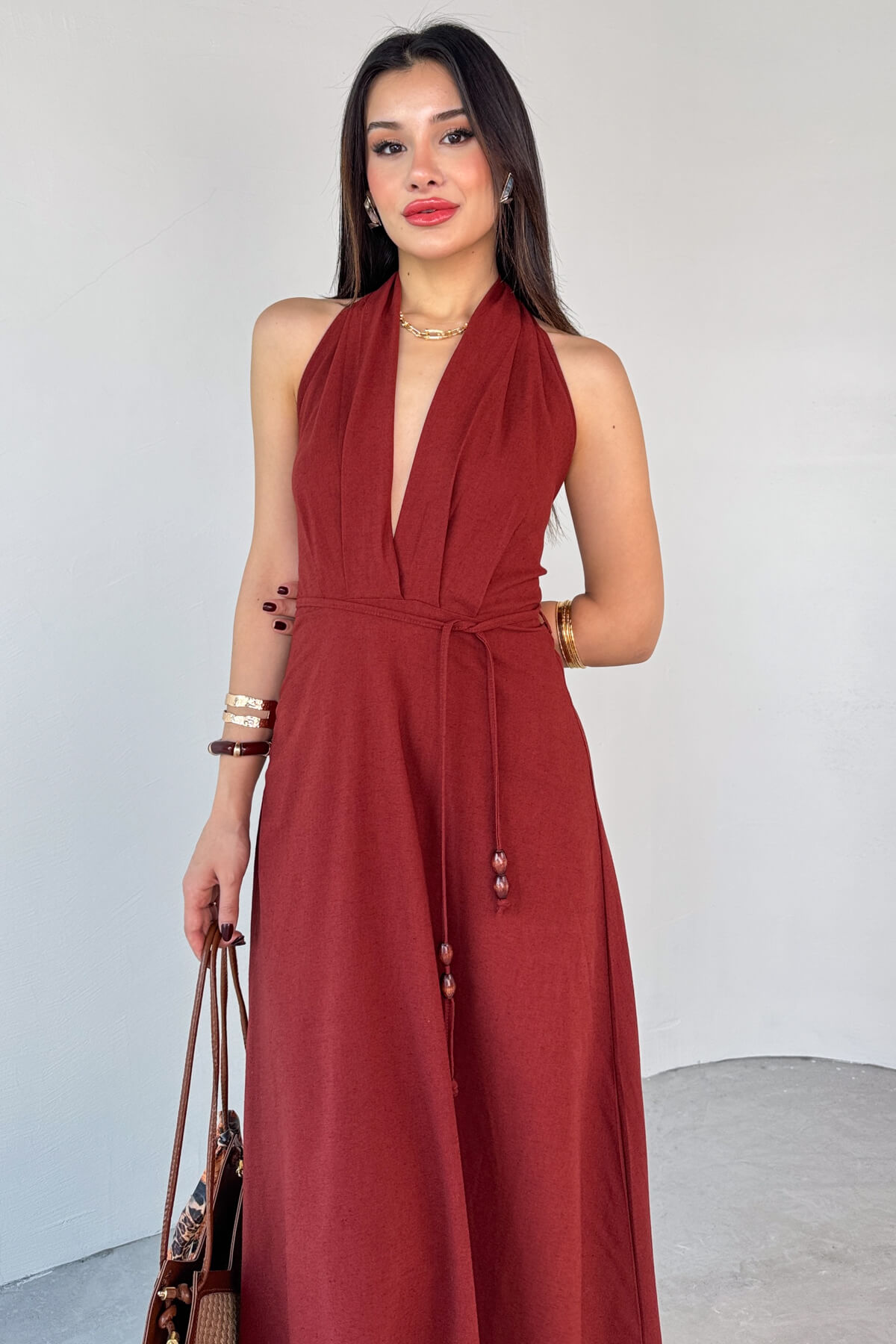 ELB-01787 Kiremit Sırt Dekolteli İnce Kemer Detaylı Keten Yazlık Elbise