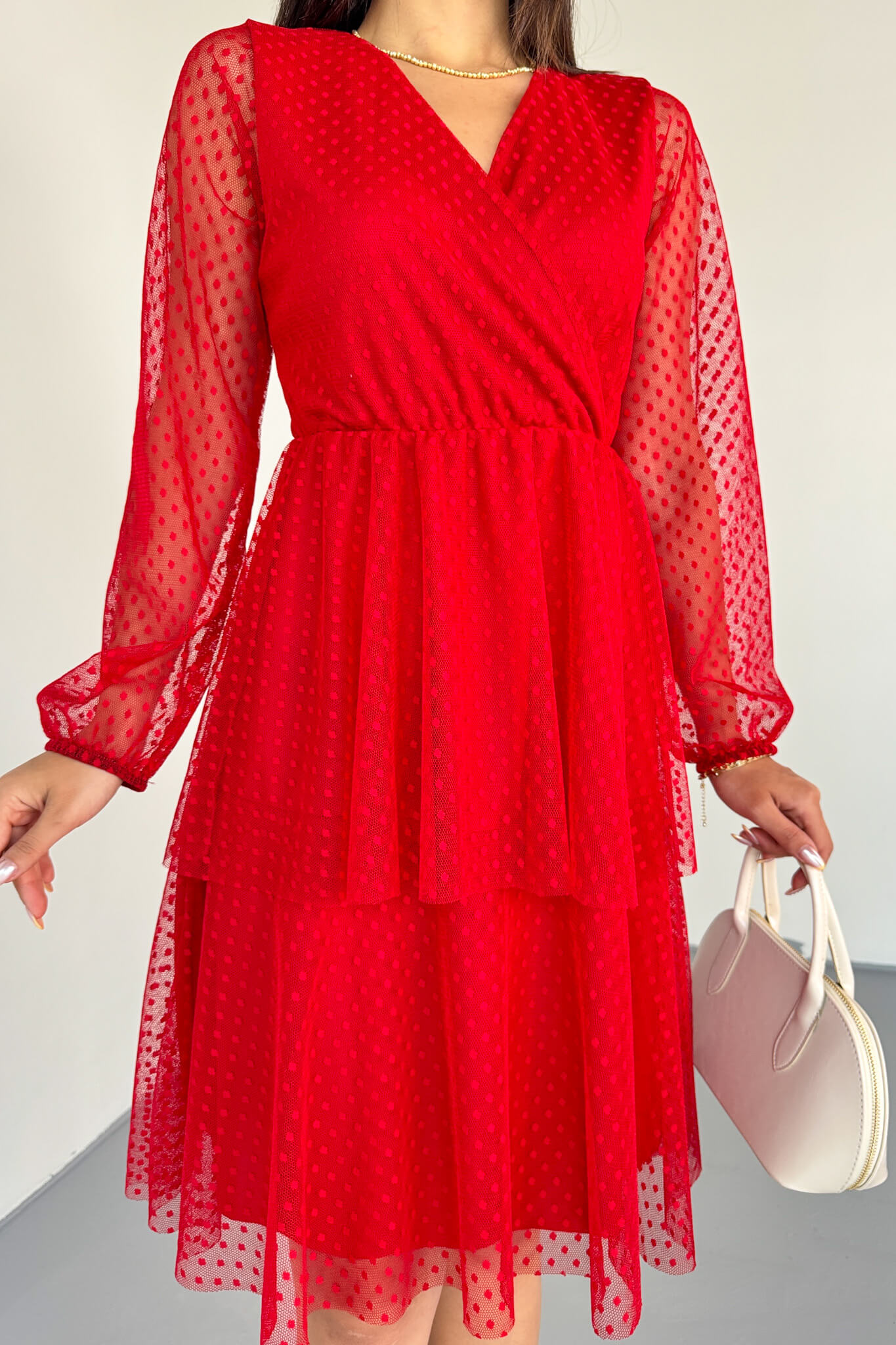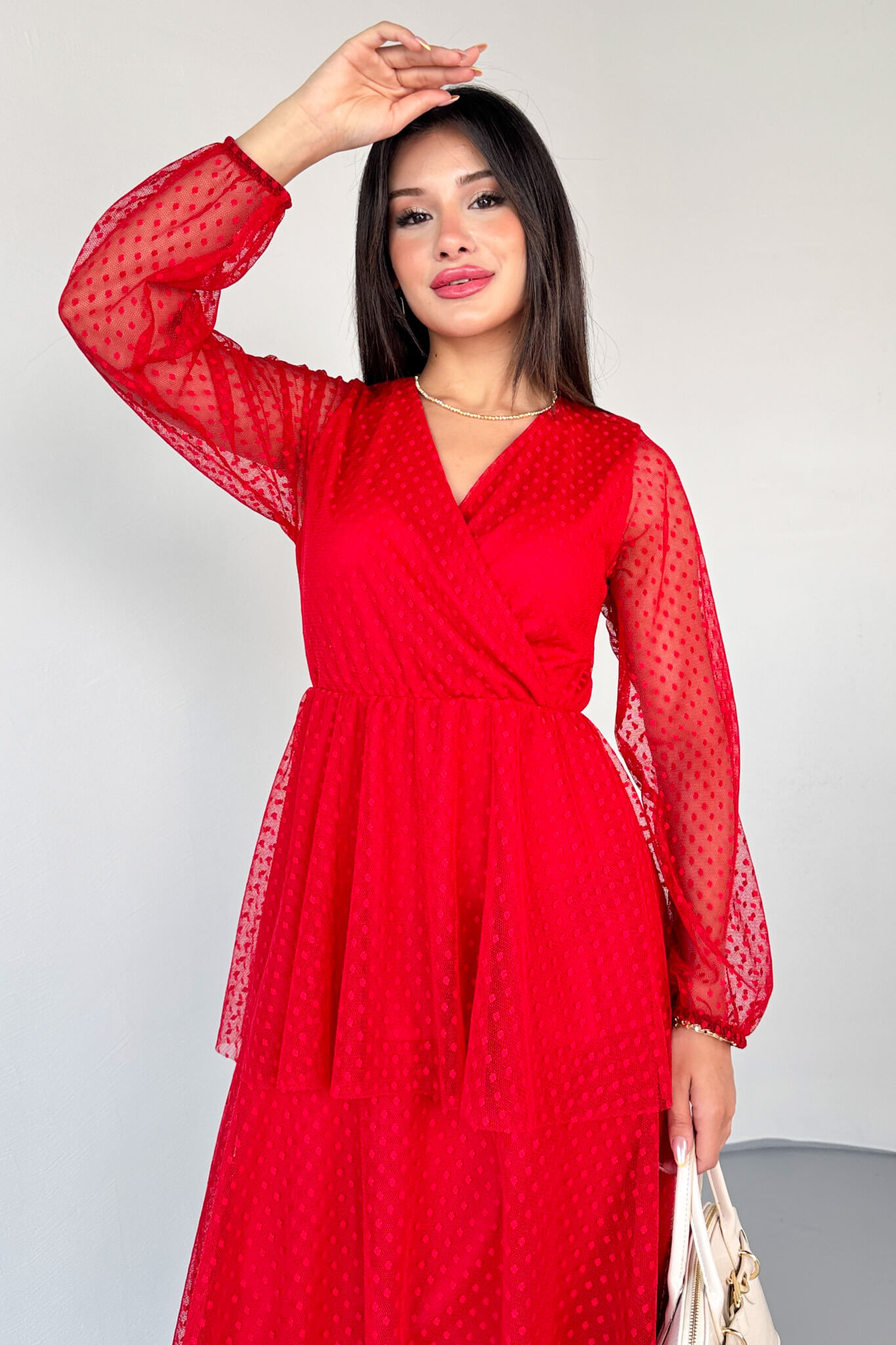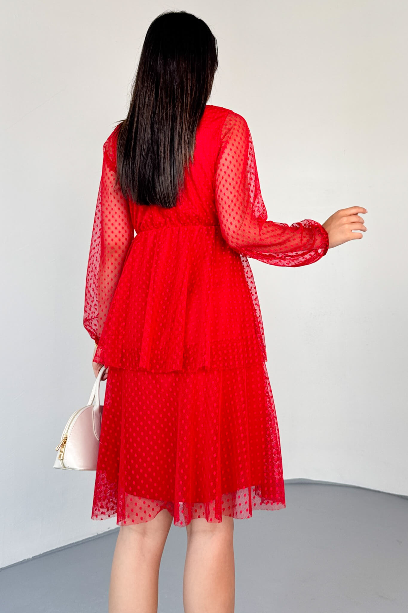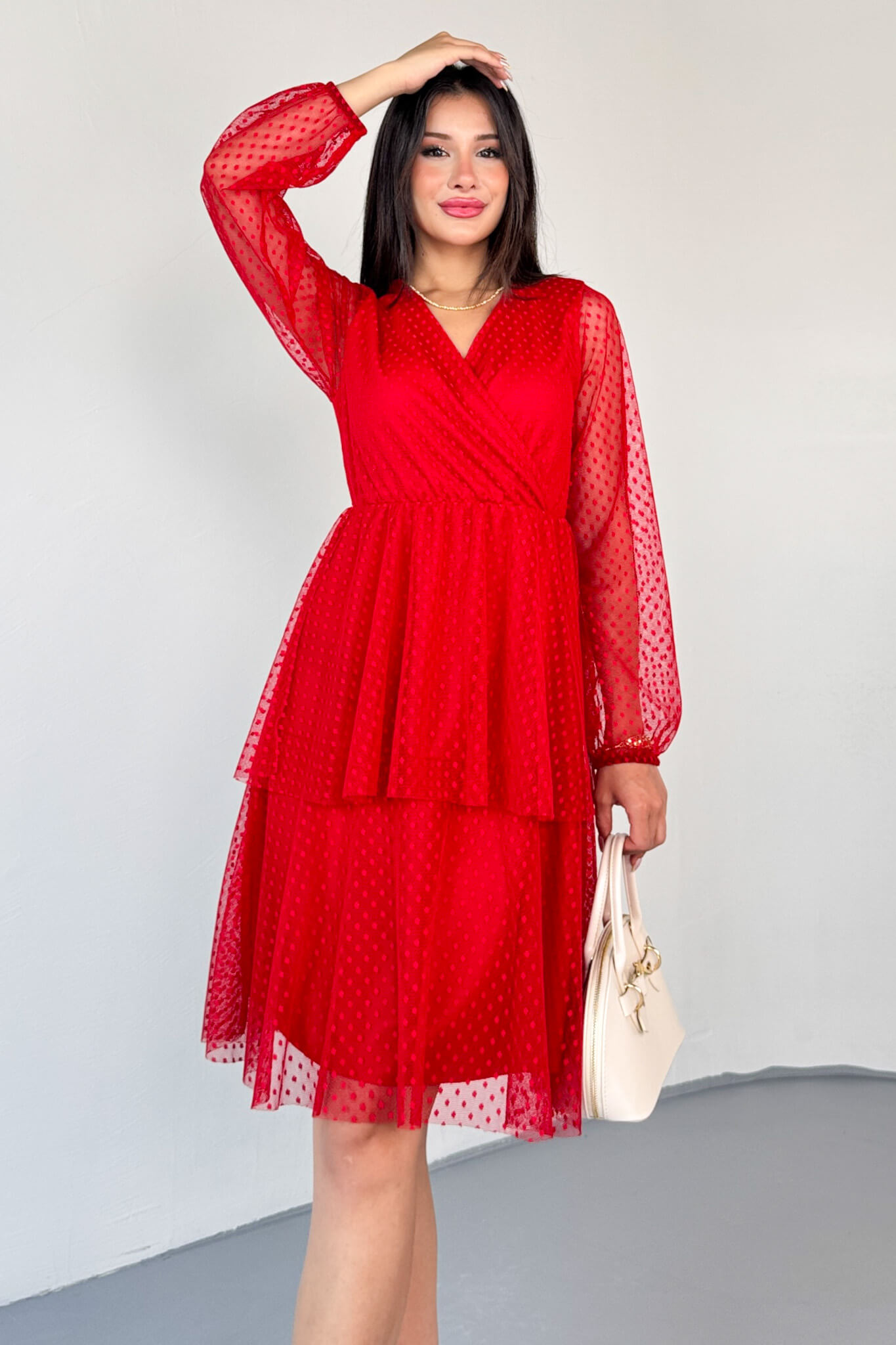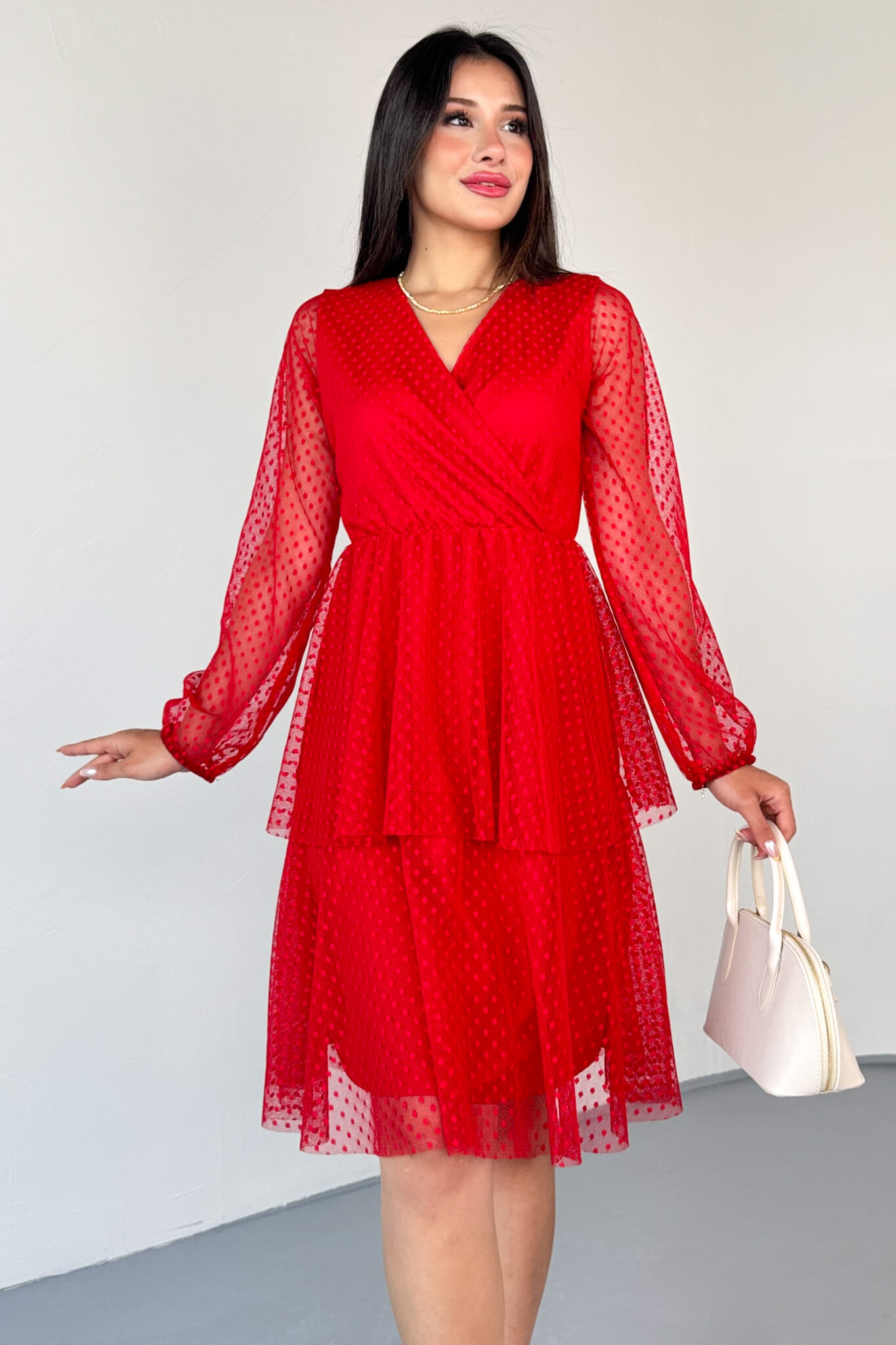 ✔ Dantel detaylı transparan kollar, elbiseye sofistike bir hava katar.