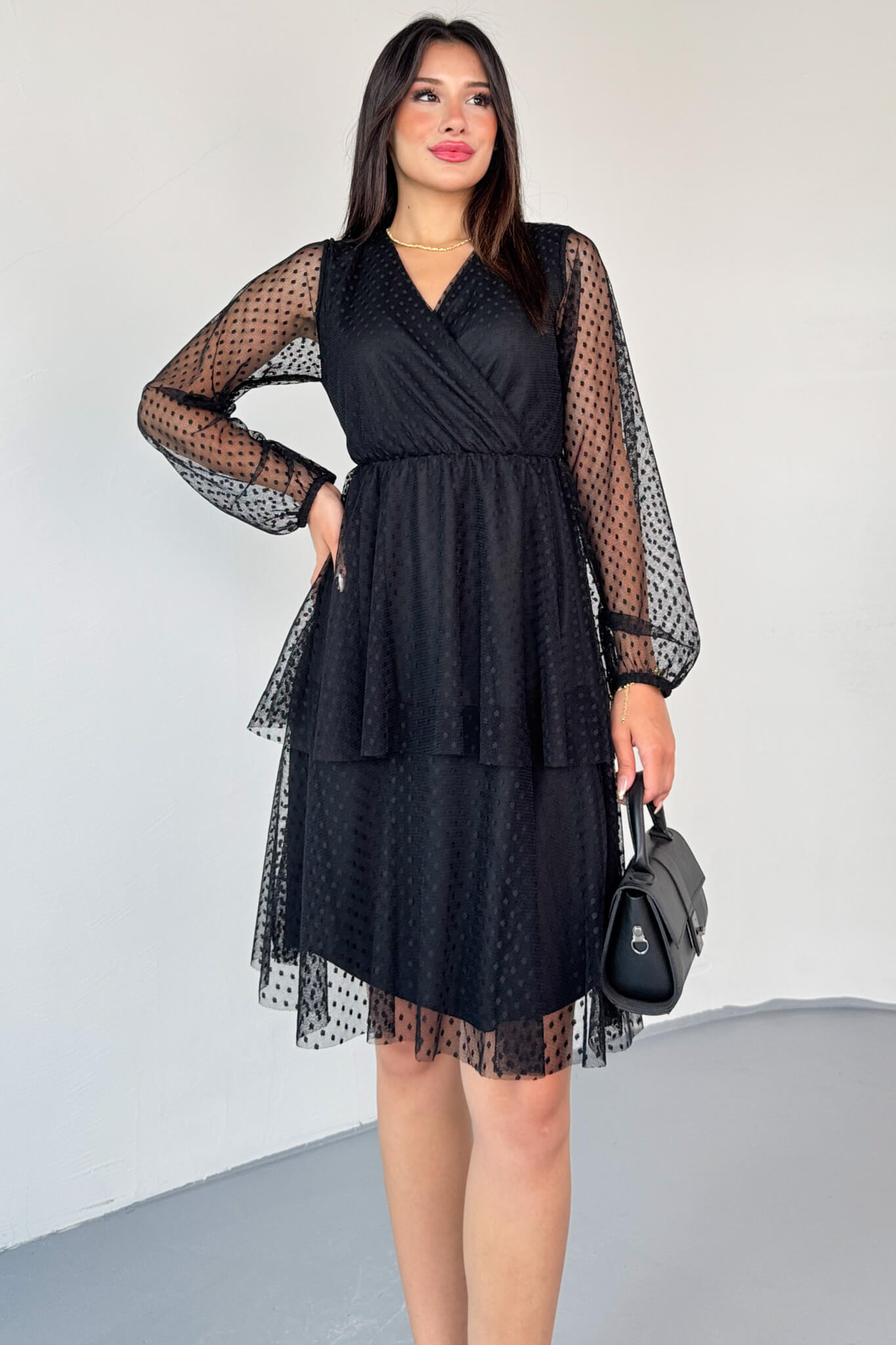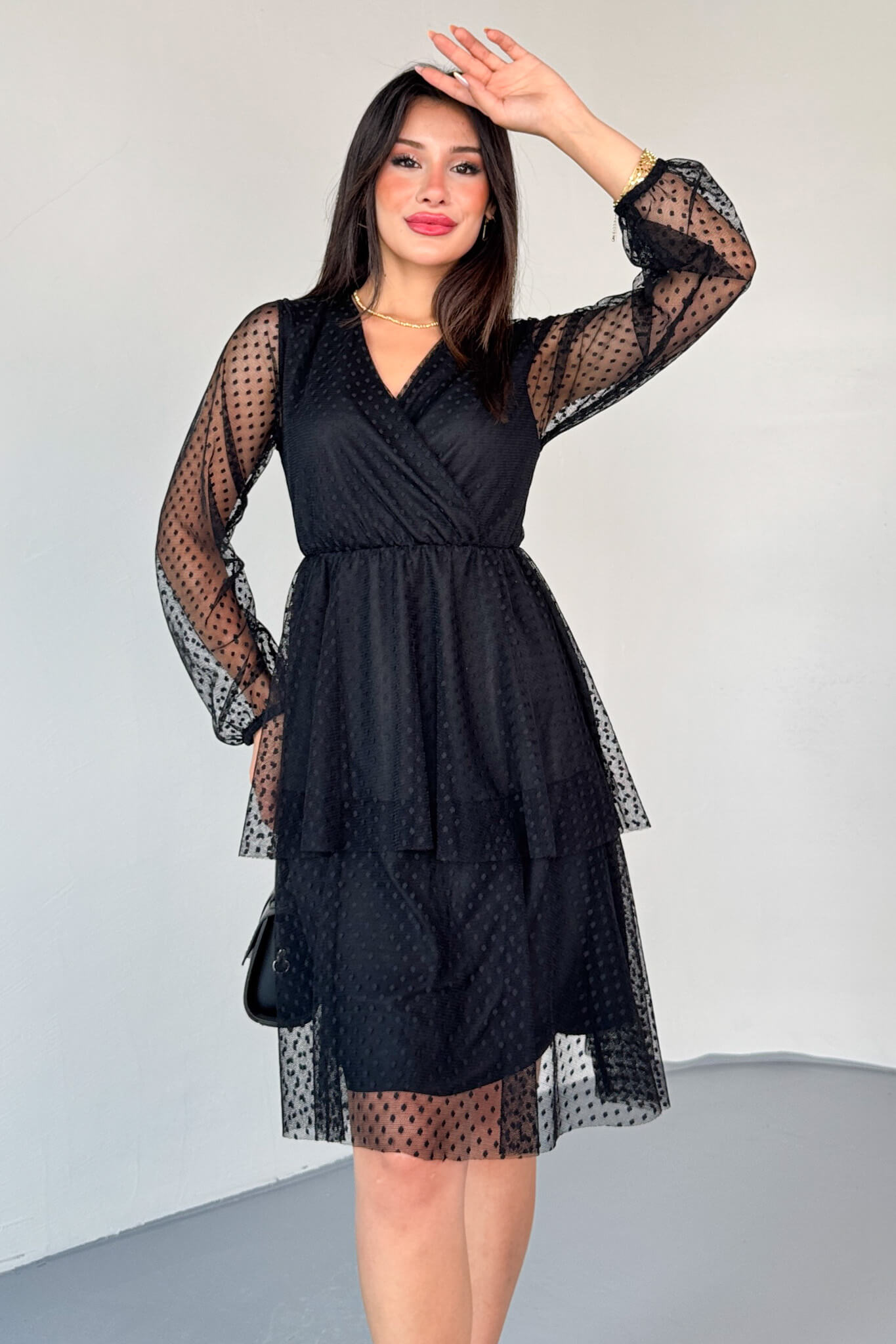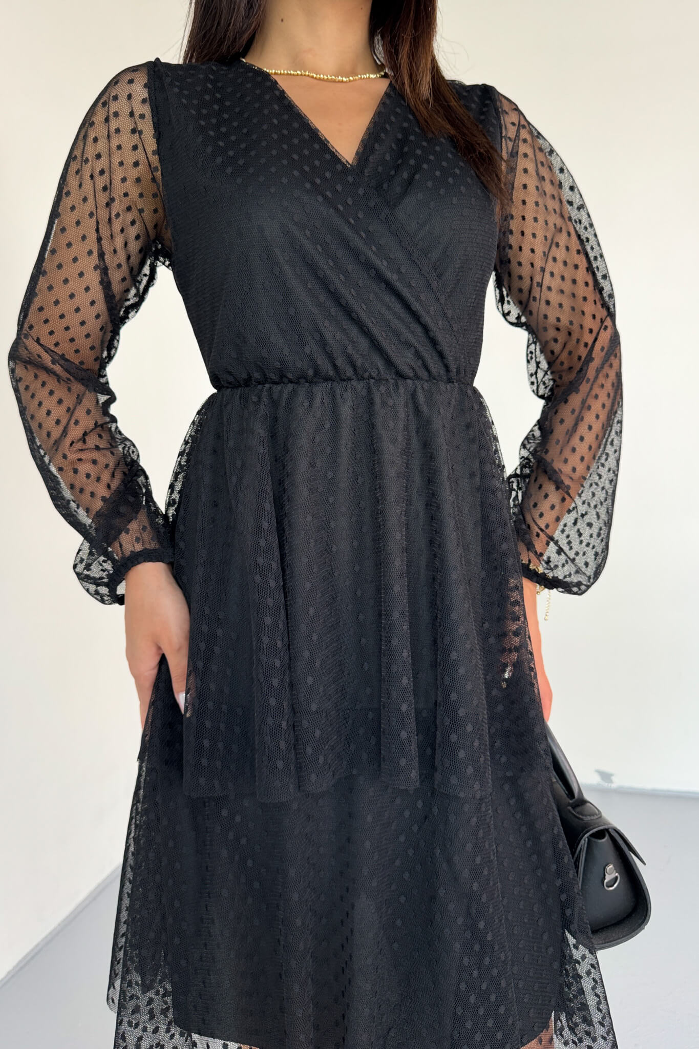 ✔ Dantel detaylı transparan kollar, elbiseye sofistike bir hava katar.