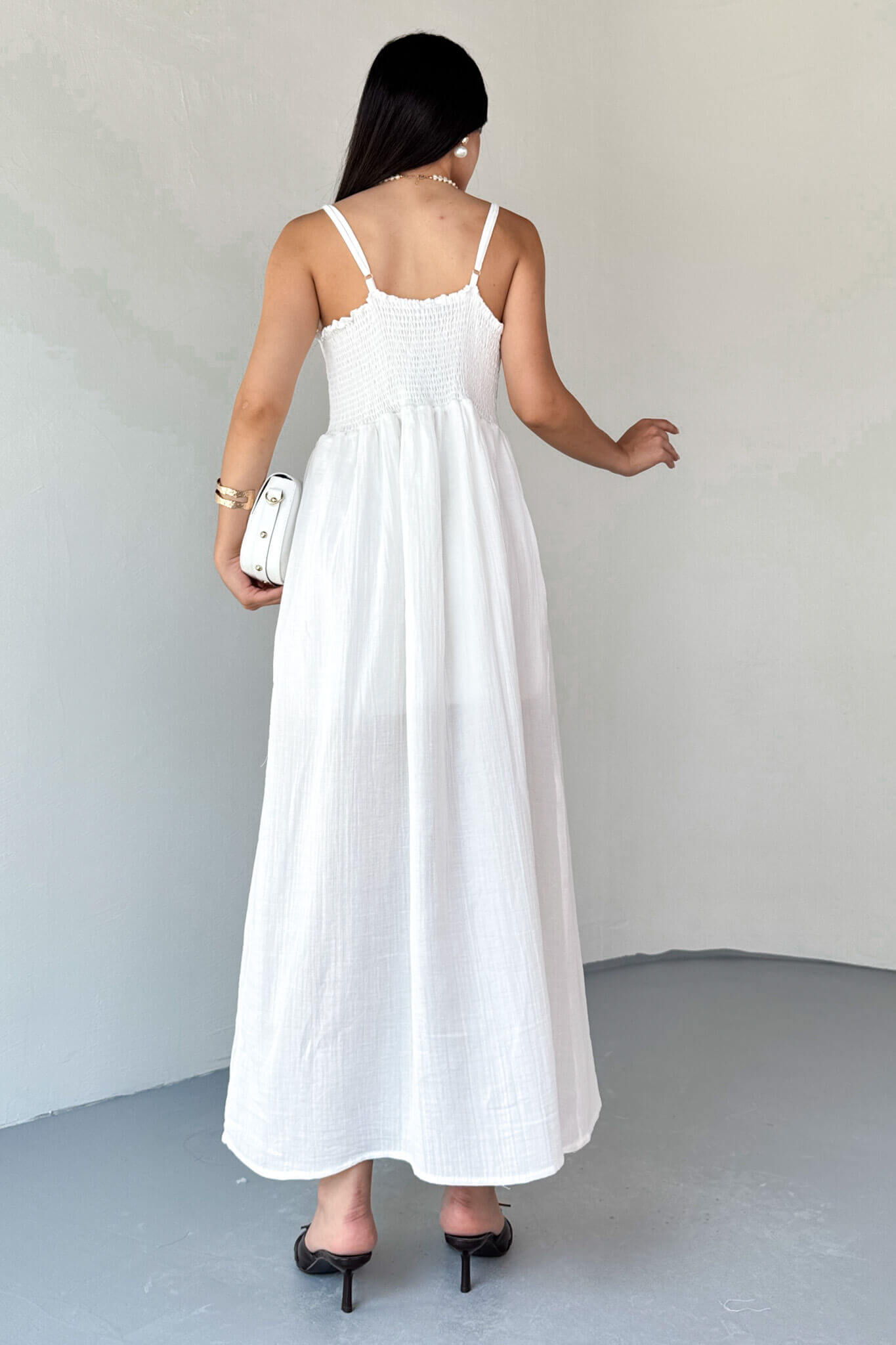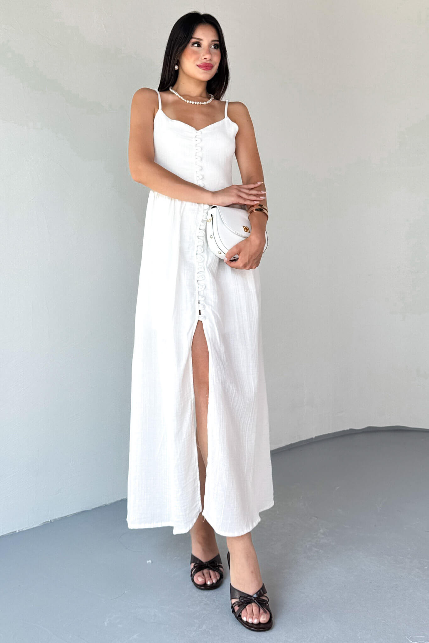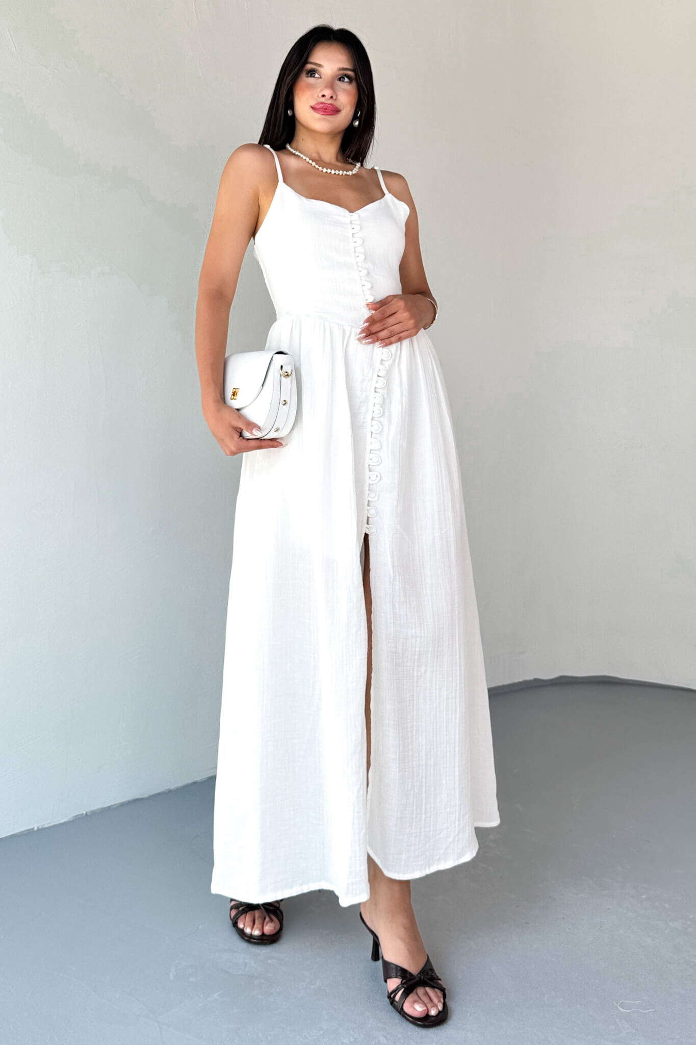 ✔ Ön yüzünde yer alan kaplama düğme detayı, elbiseye zarif bir görünüm katar.