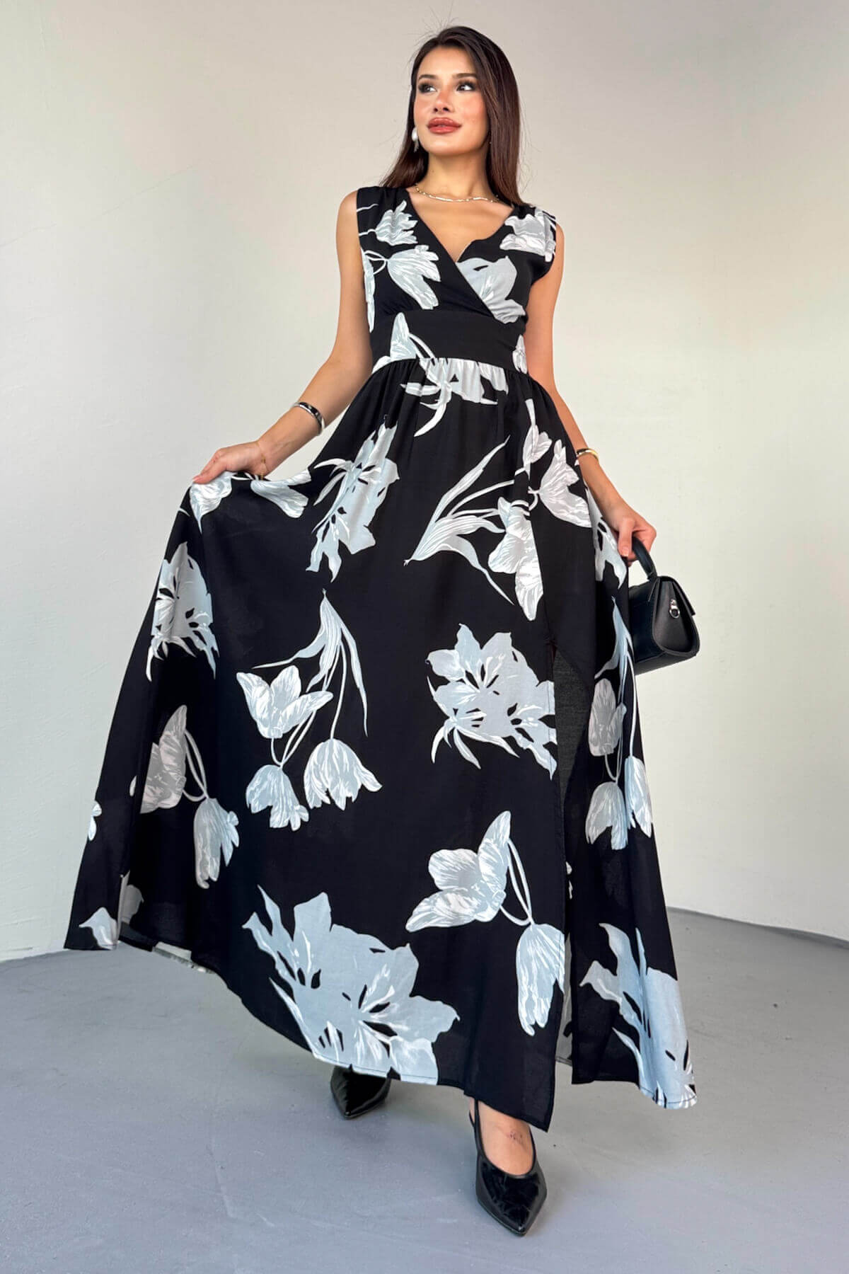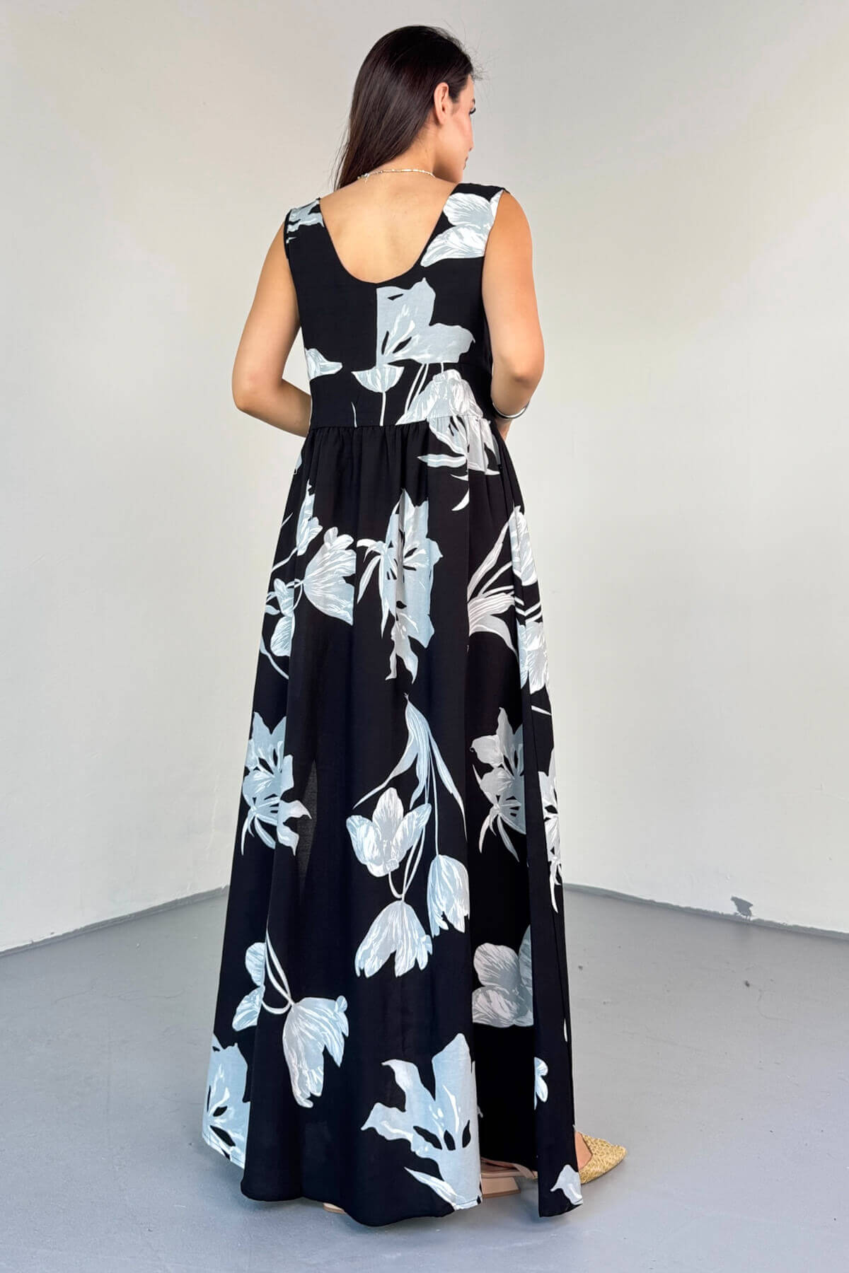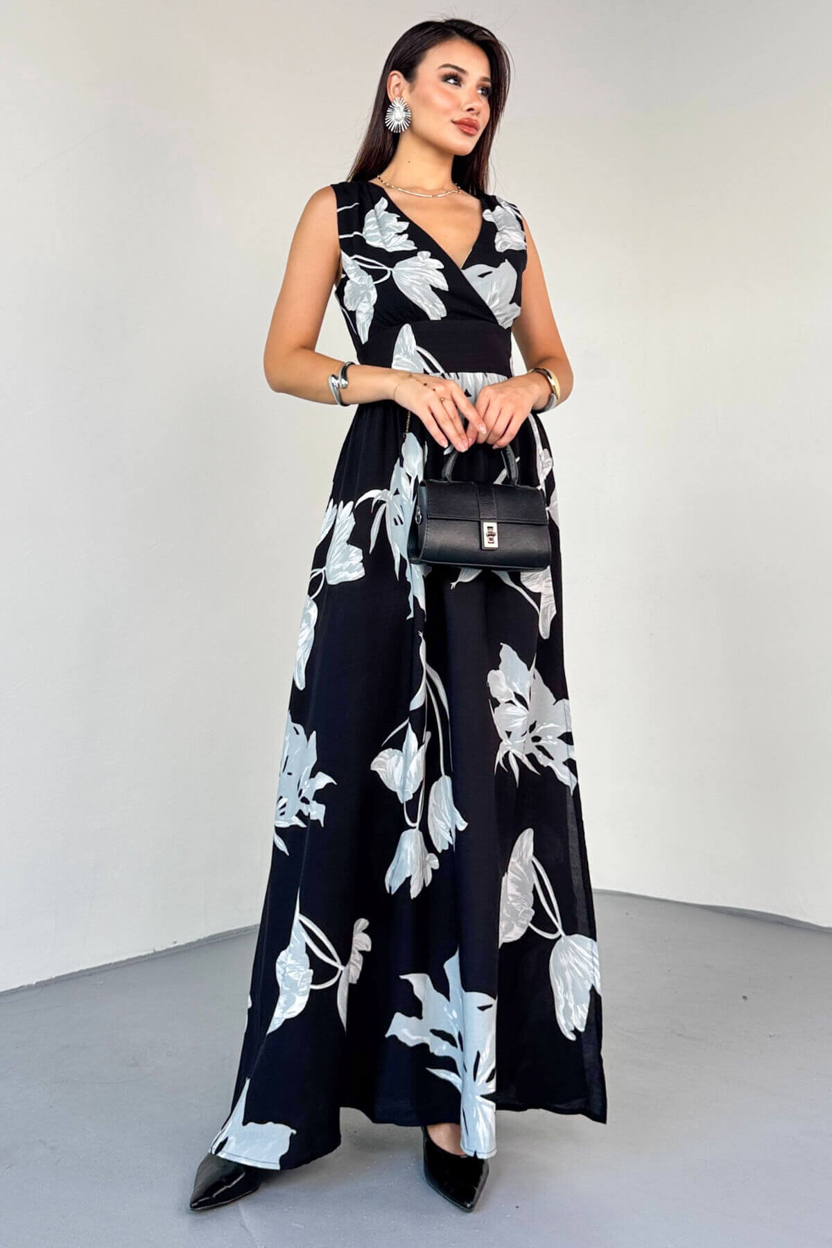 ELB-01817 Siyah Silver Tropikal Yaprak Desenli V Yaka Dokuma Elbise