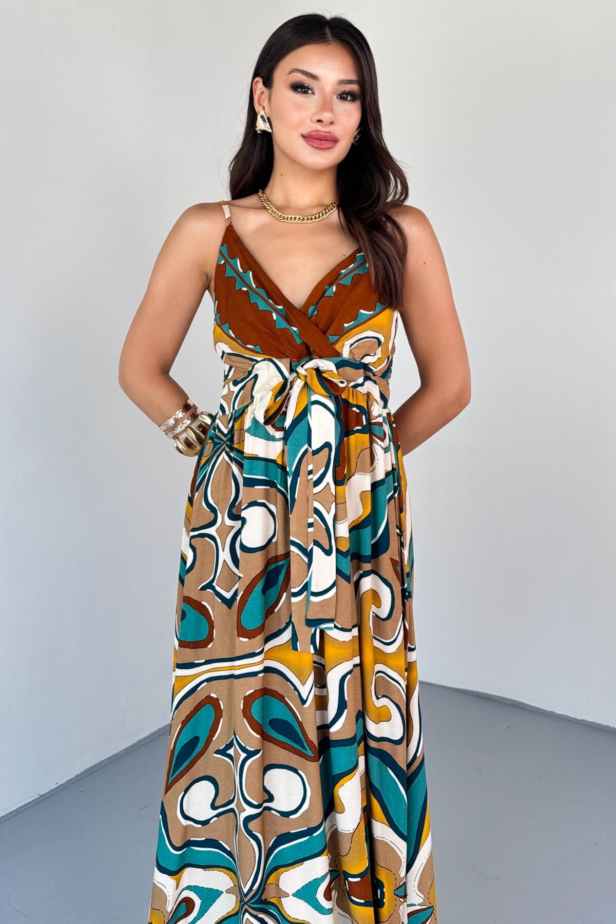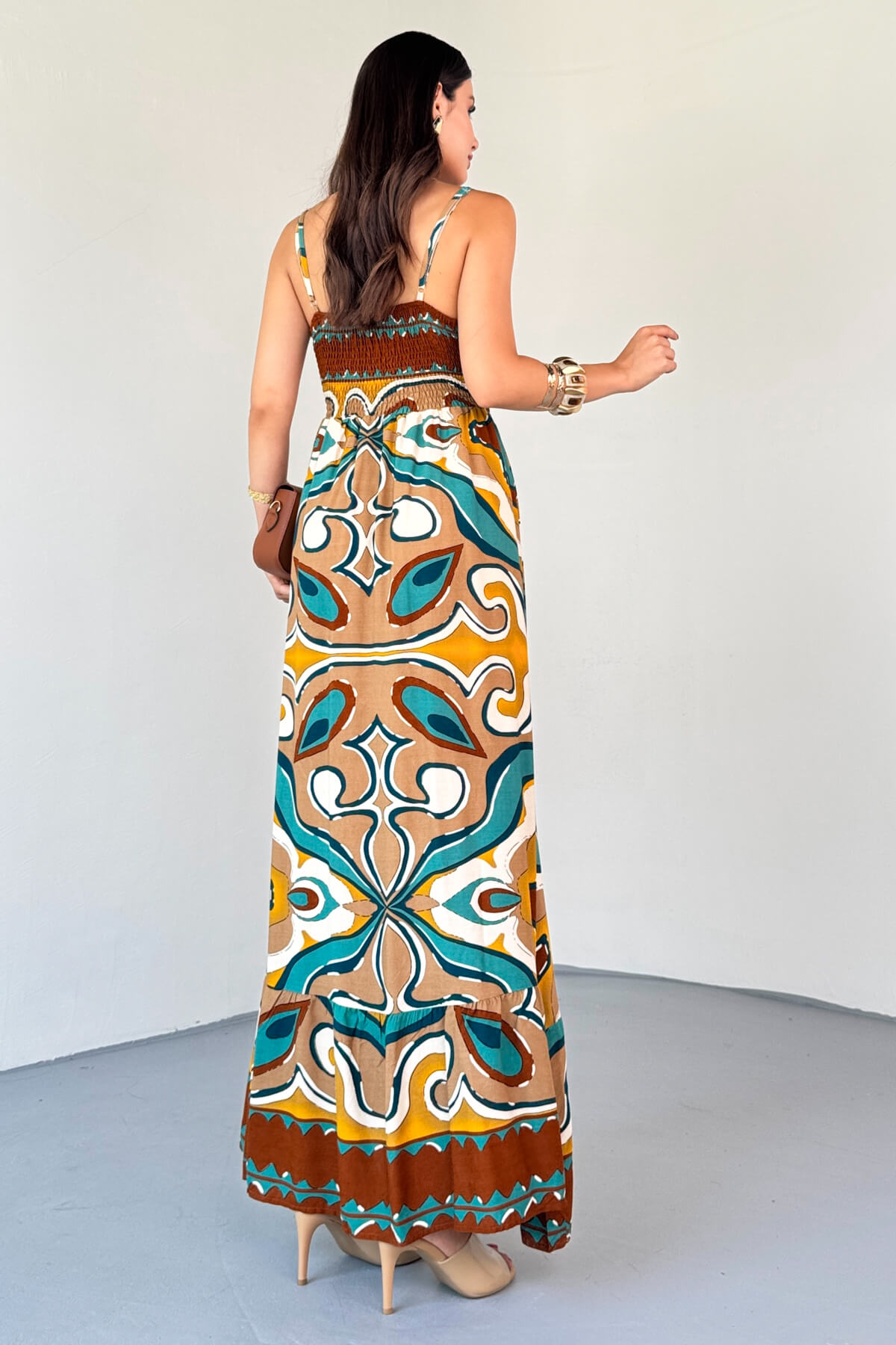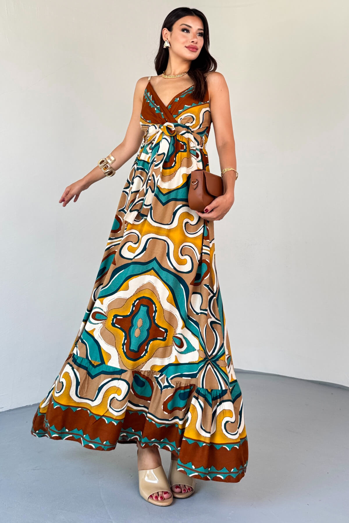 ELB-01818 Sarı Retro Desenli Askılı Dokuma Yazlık Elbise