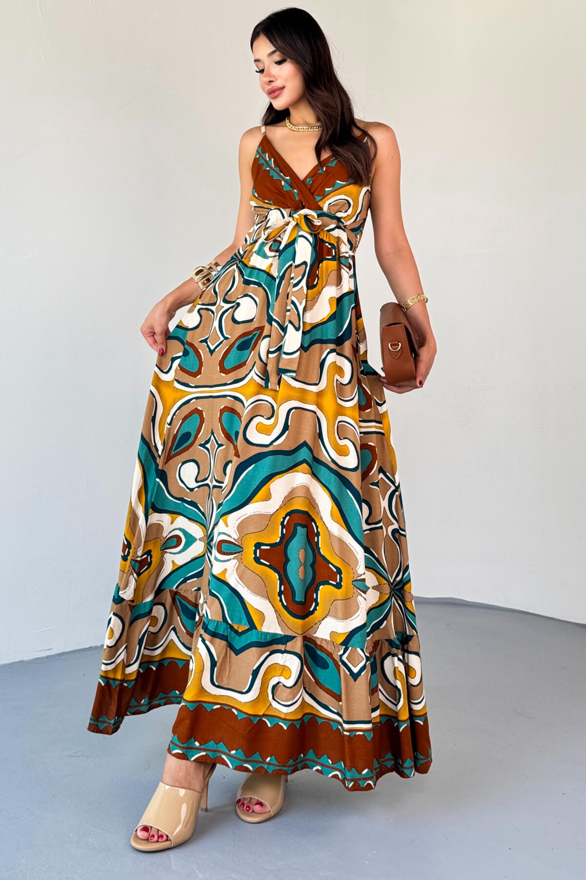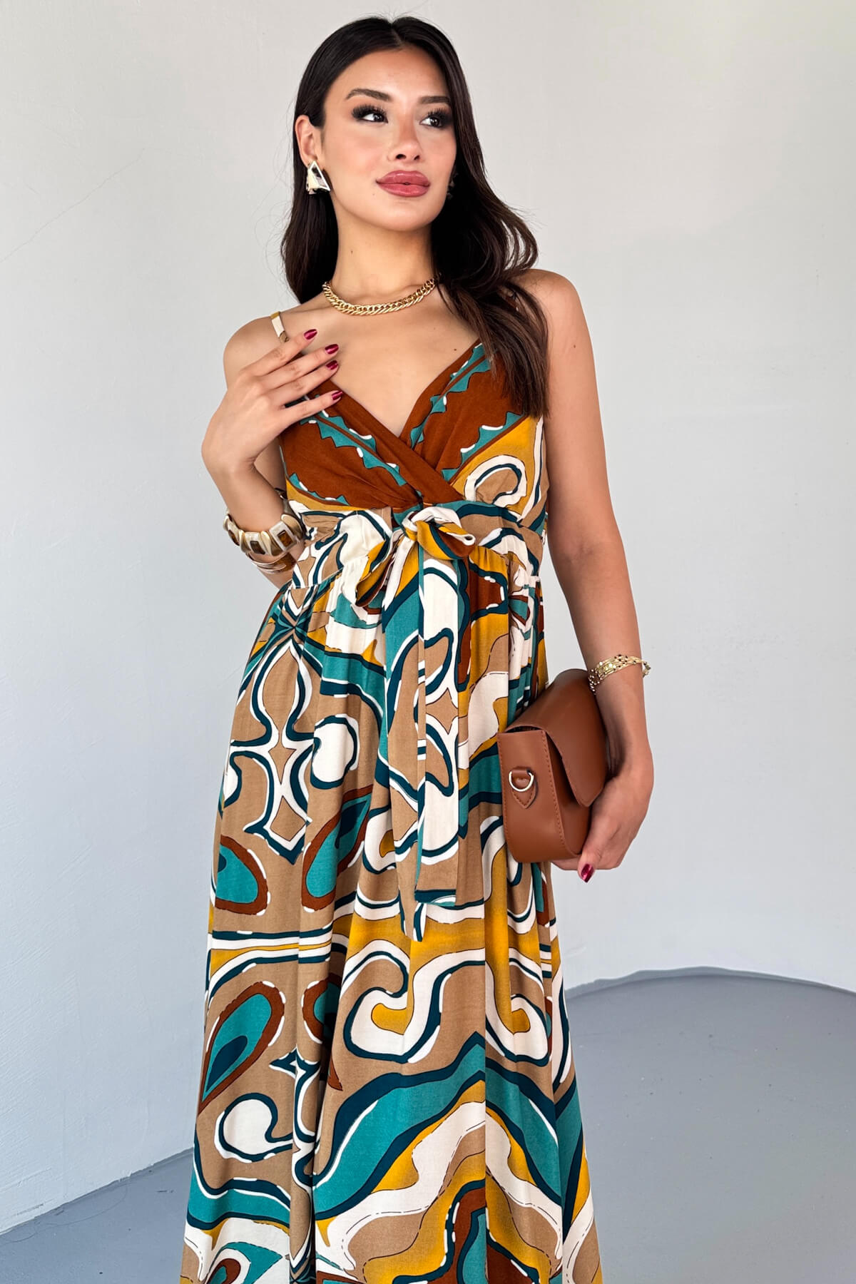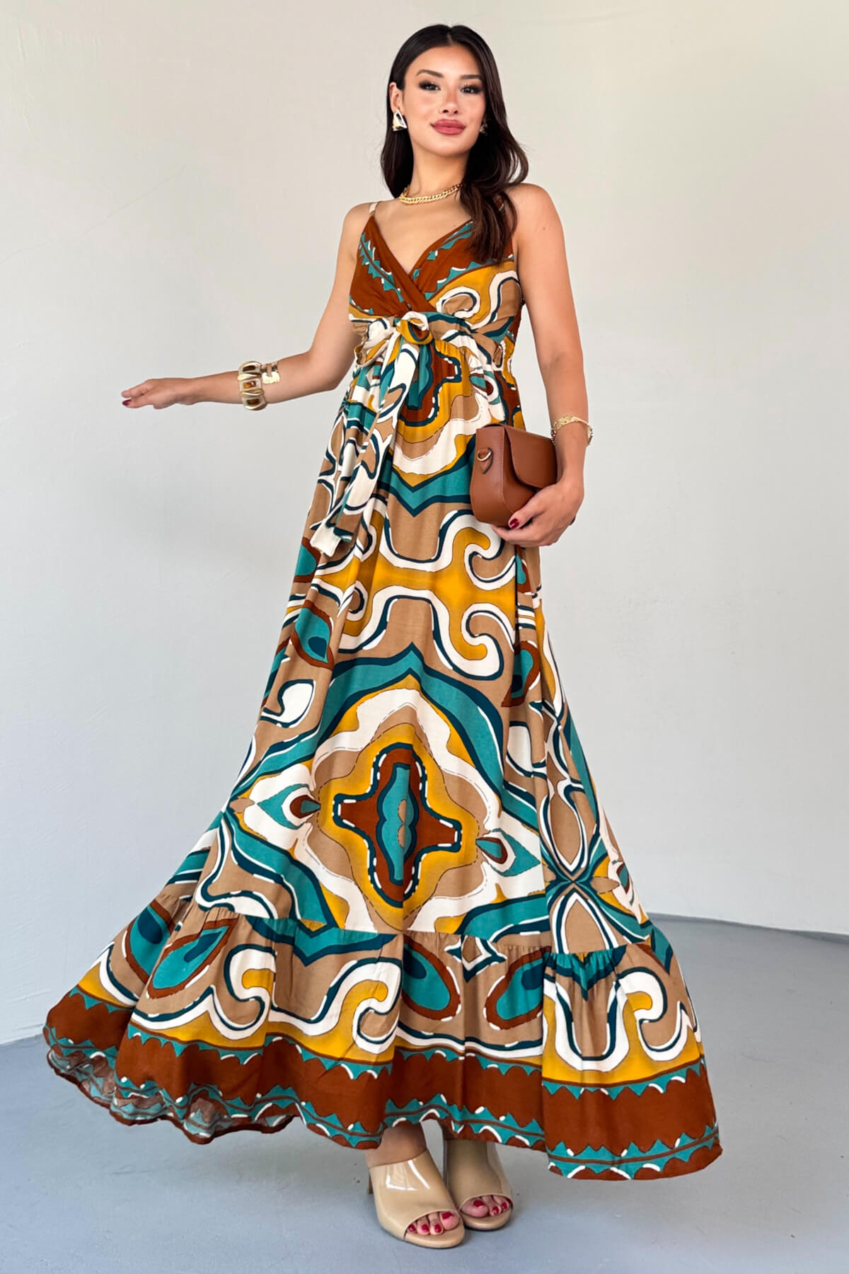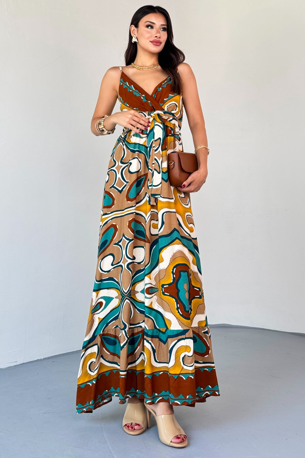 ELB-01818 Sarı Retro Desenli Askılı Dokuma Yazlık Elbise