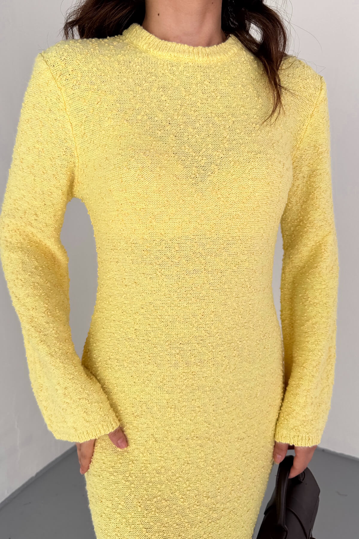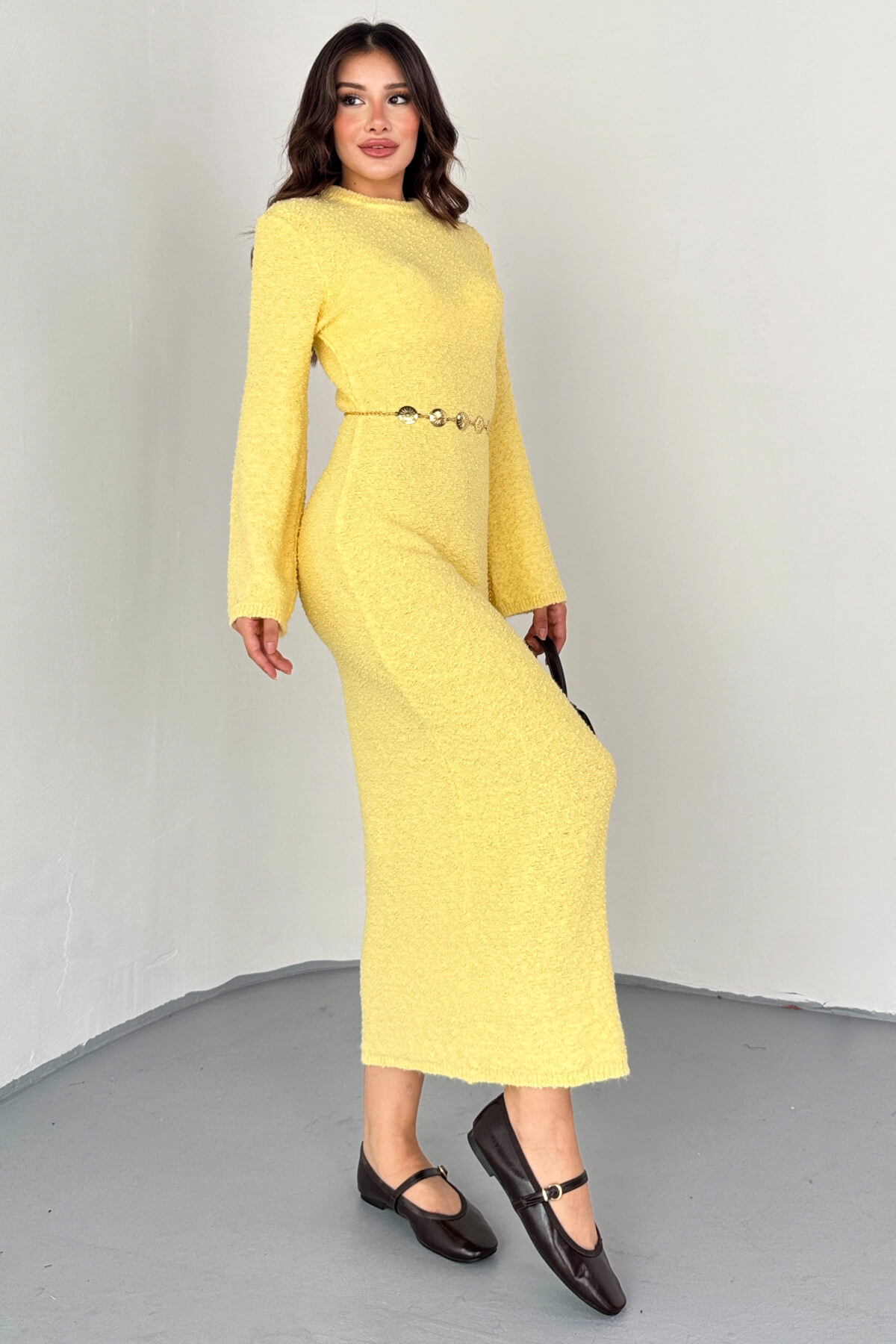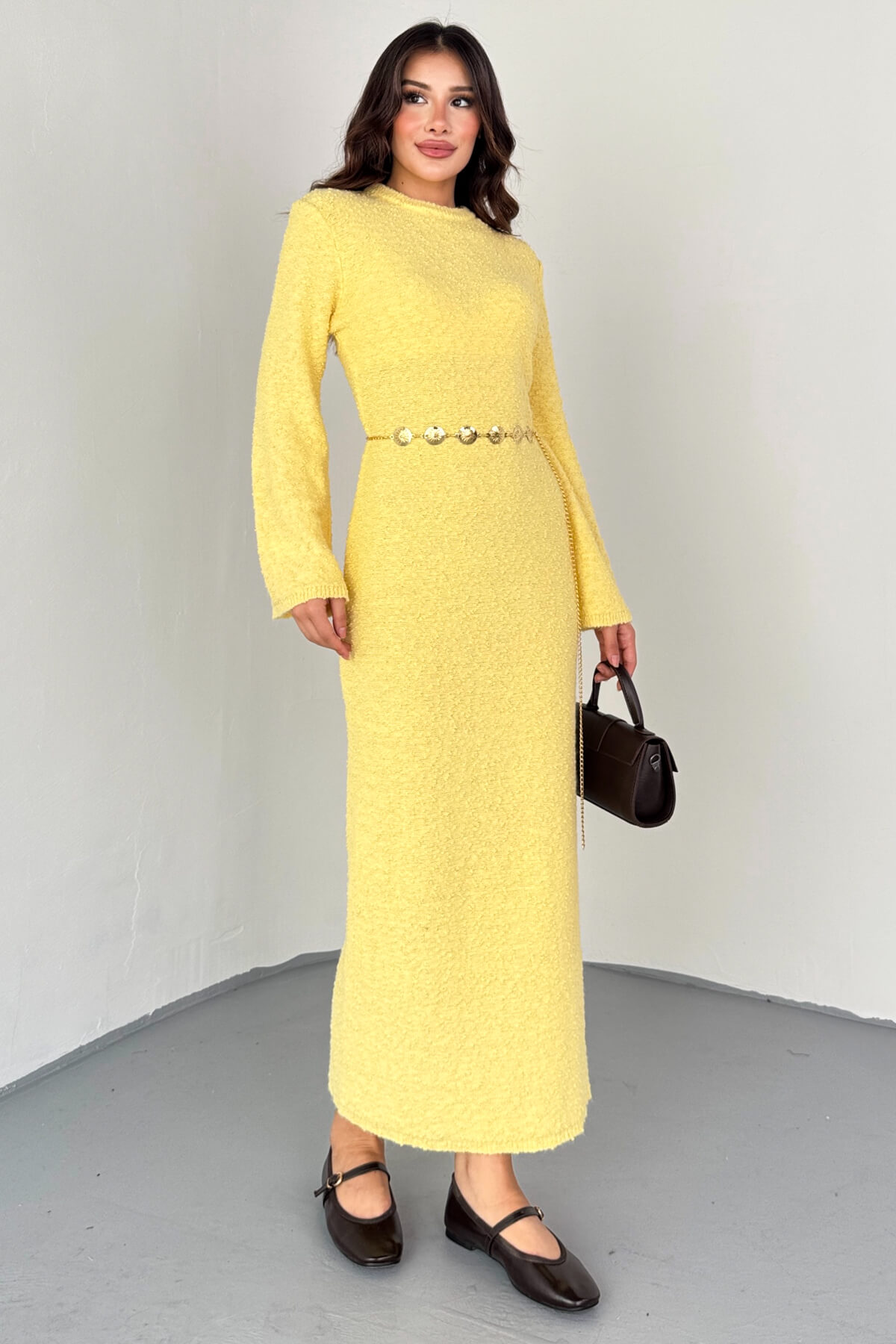 ELB-01832 Sarı Uzun Kollu Dokulu Triko Elbise