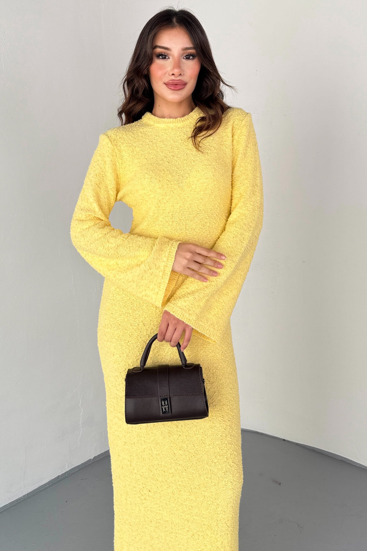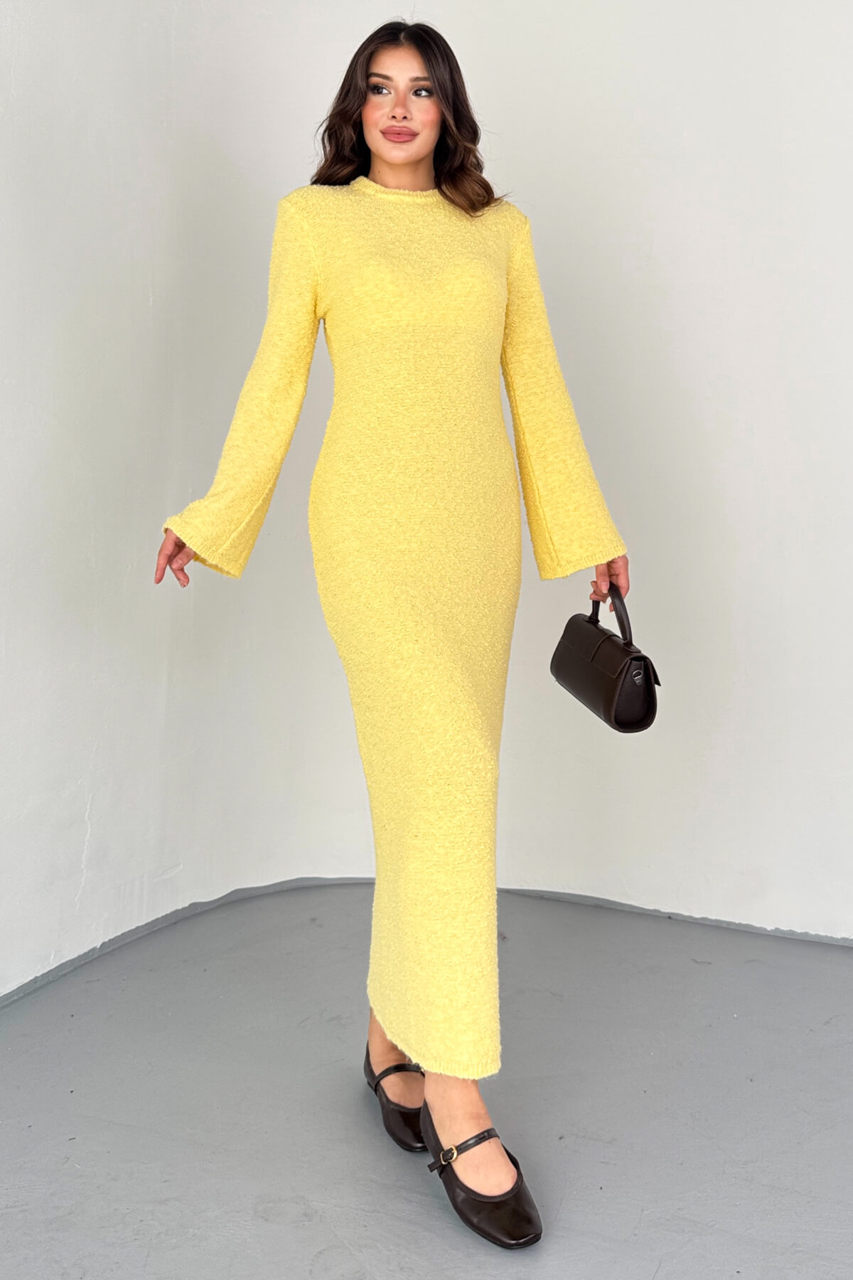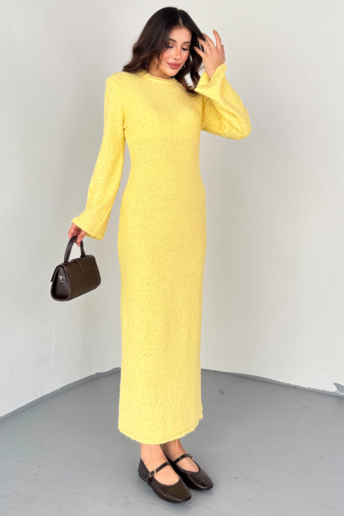 ELB-01832 Sarı Uzun Kollu Dokulu Triko Elbise