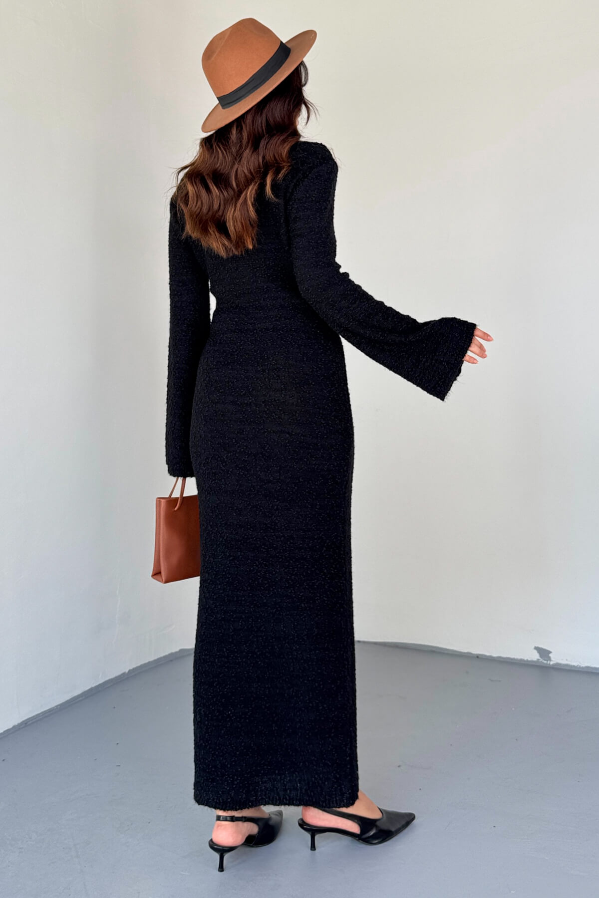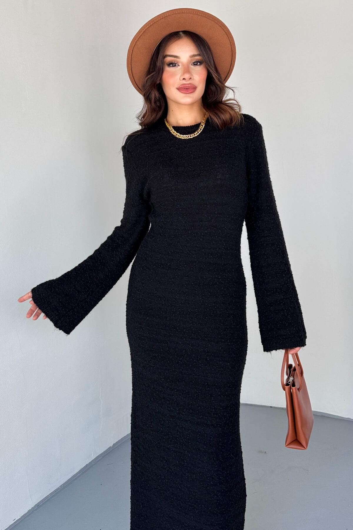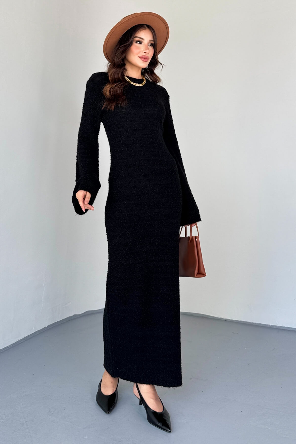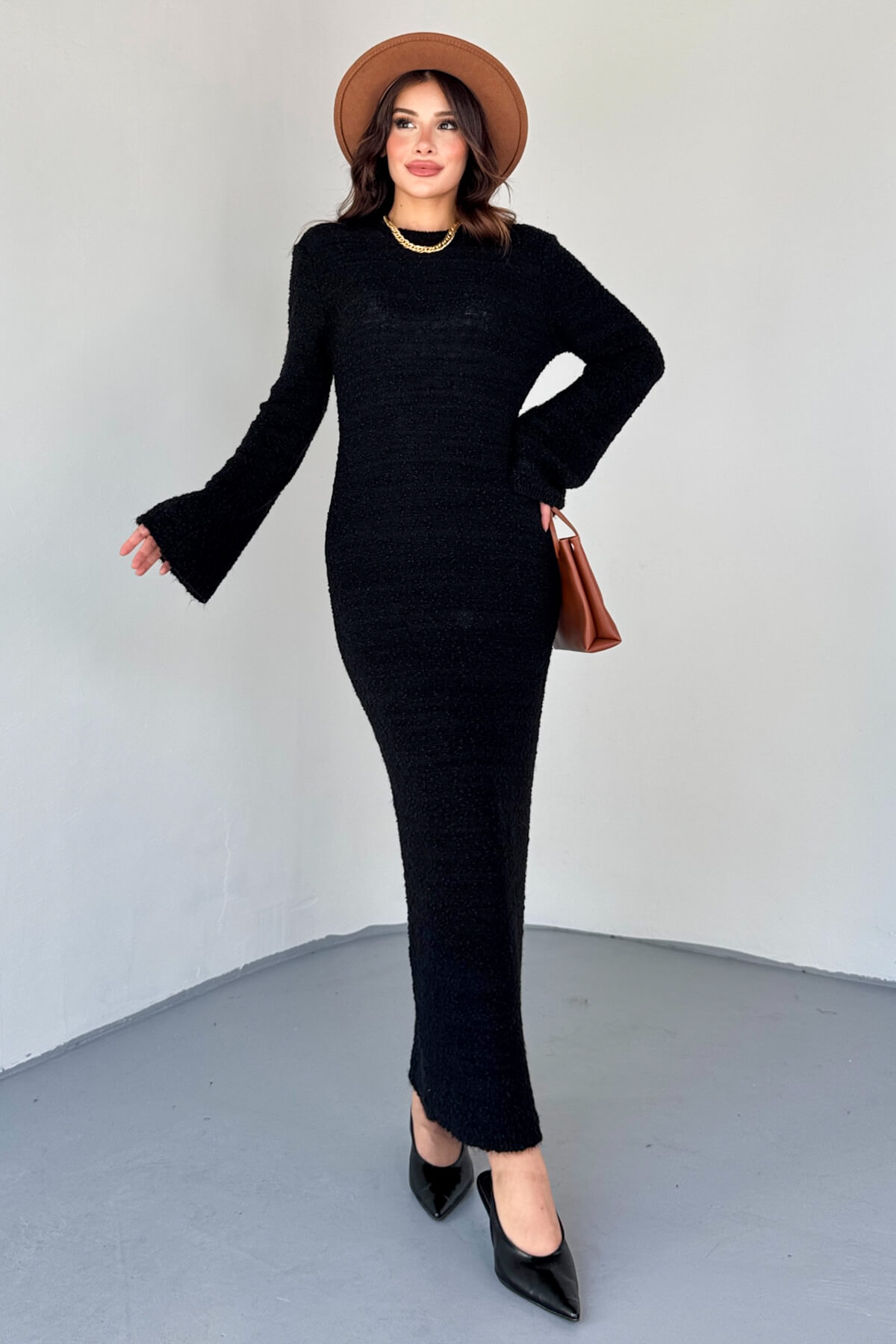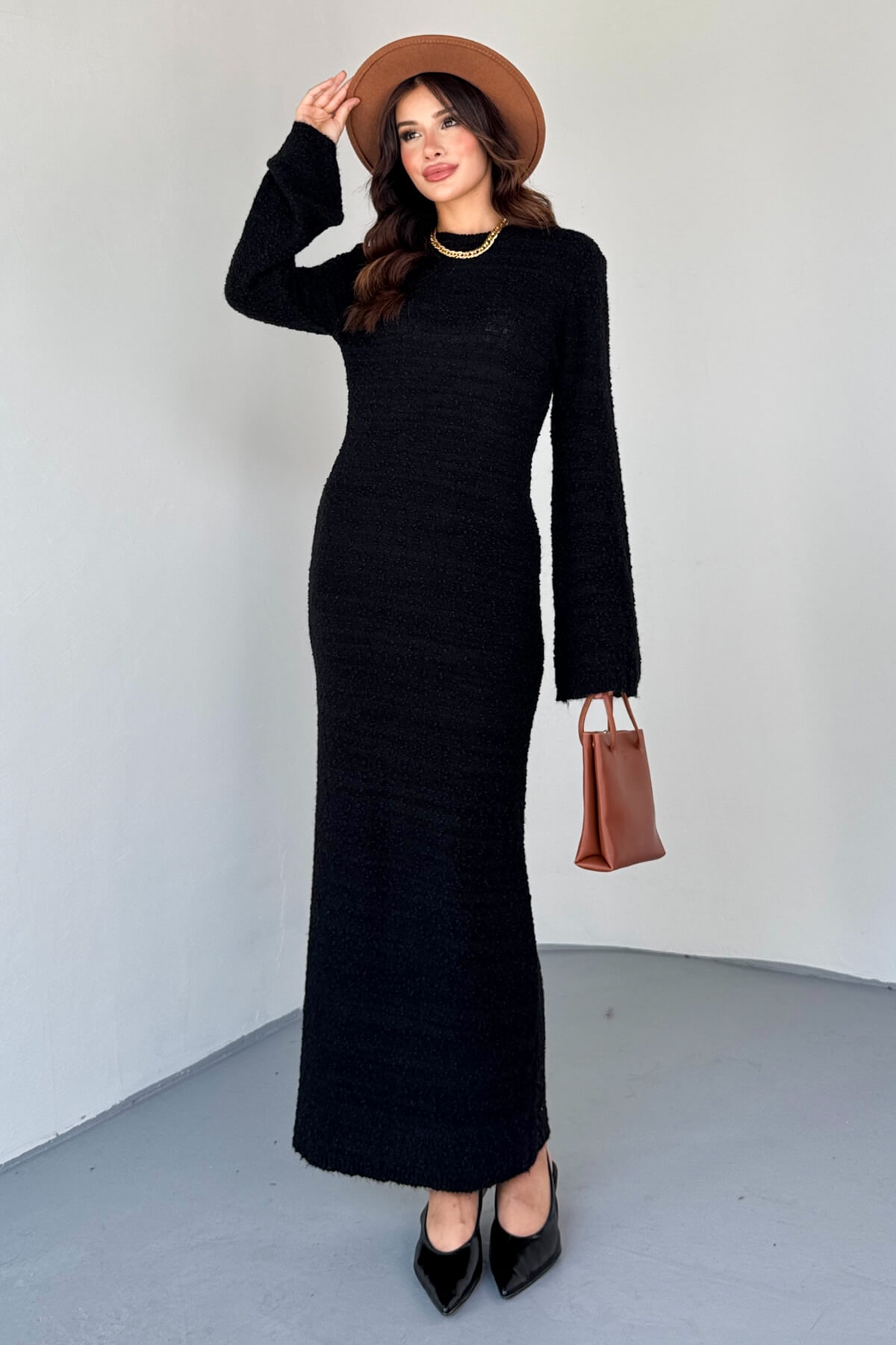 ELB-01832 Siyah Uzun Kollu Dokulu Triko Elbise