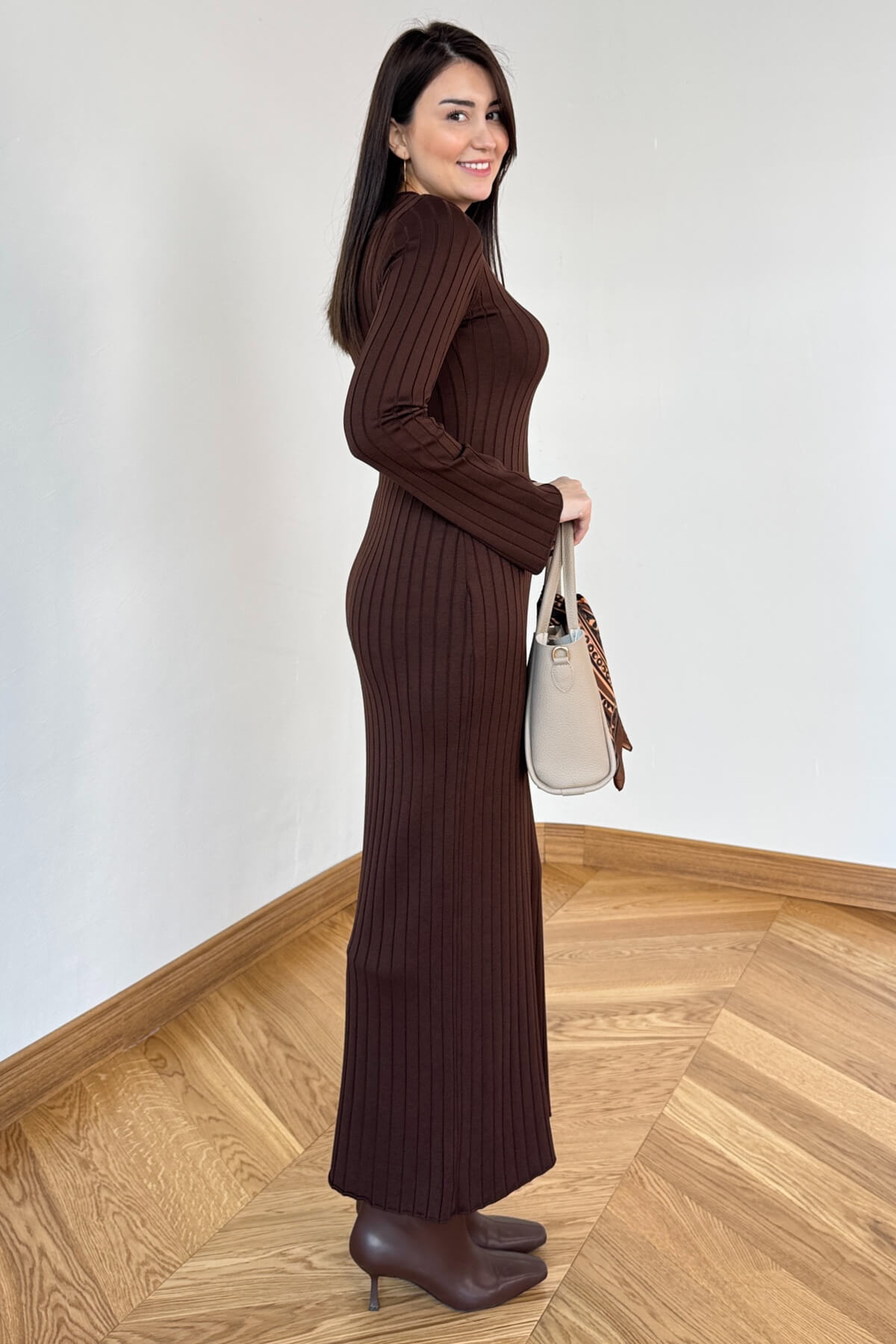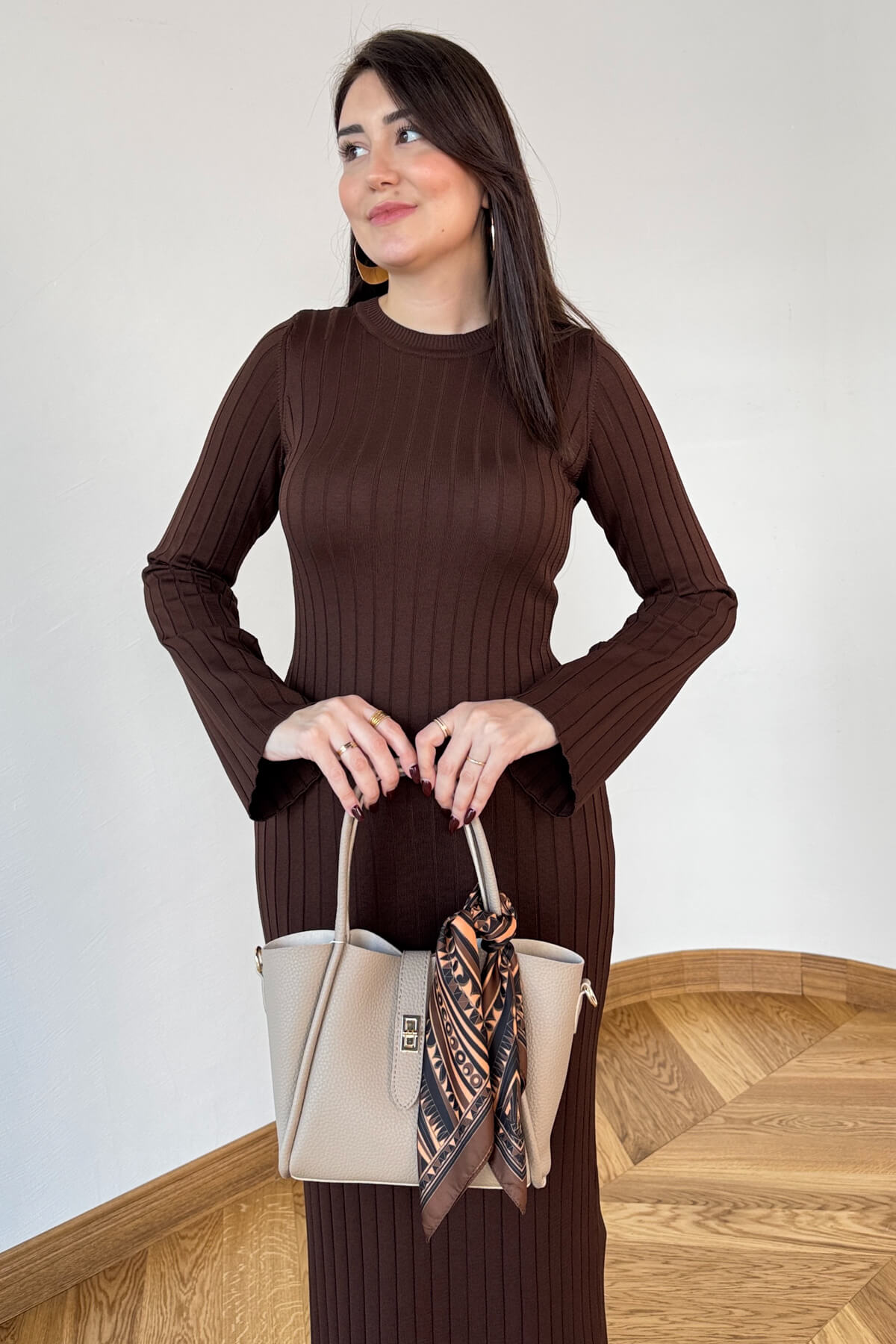 ELB-01835 Acı Kahve Pelerin Kol Triko Elbise