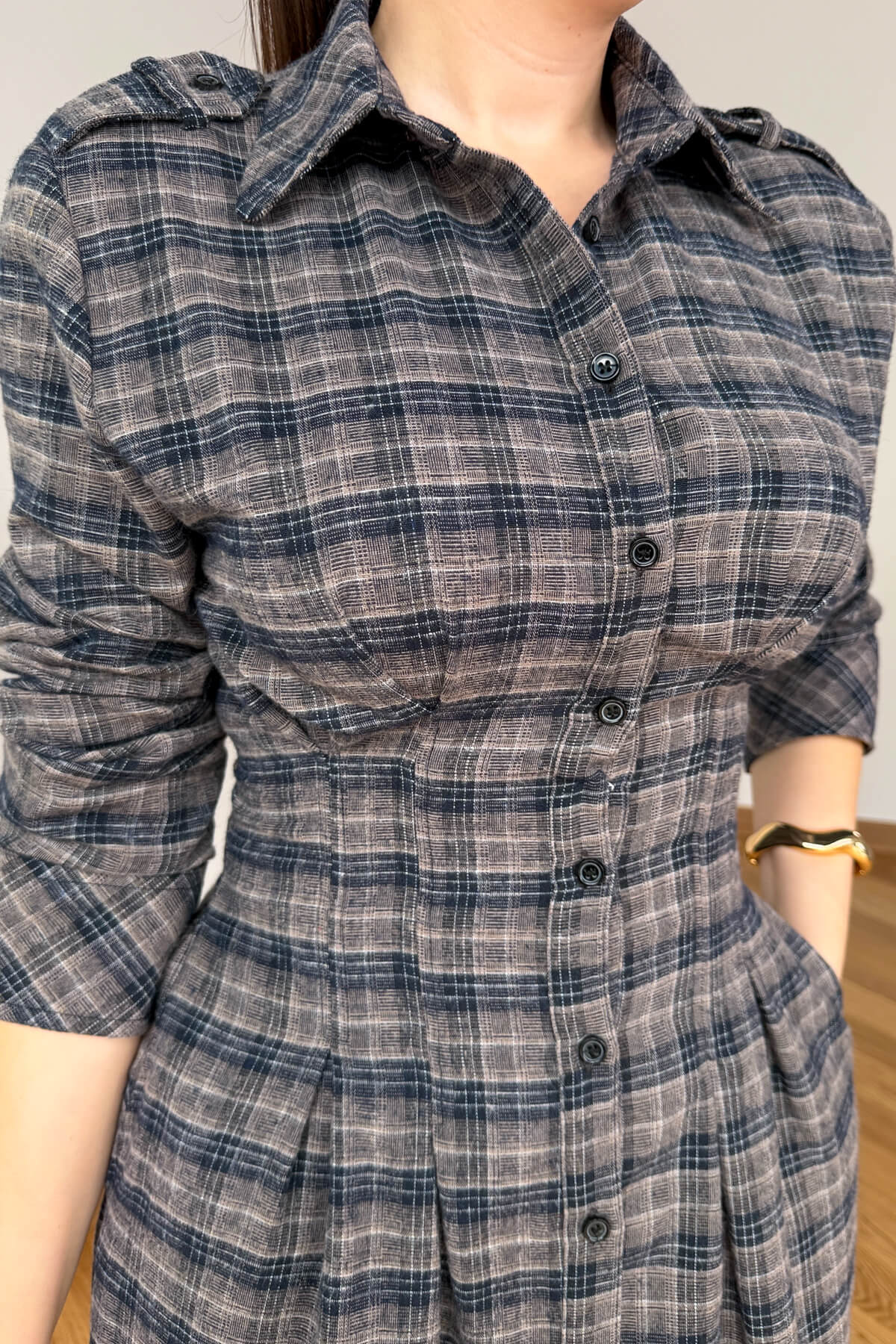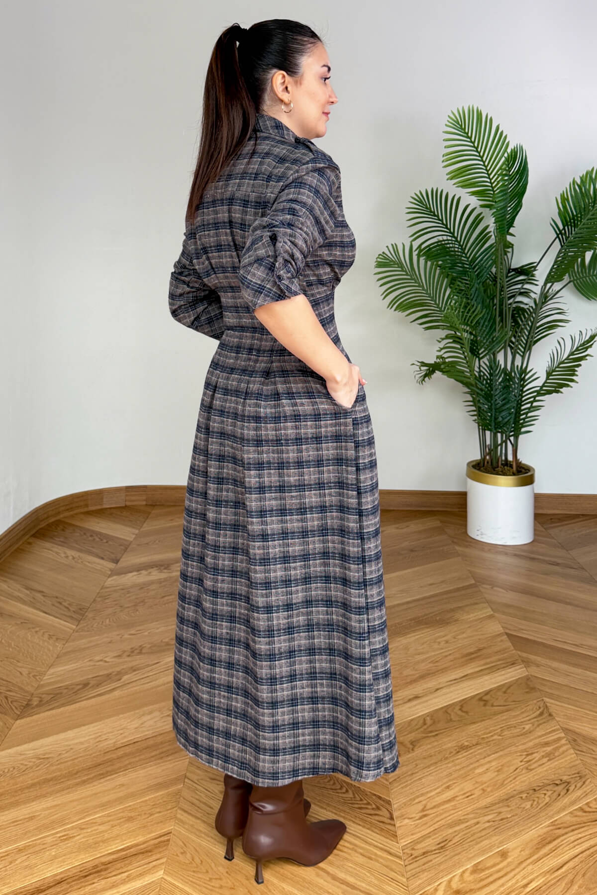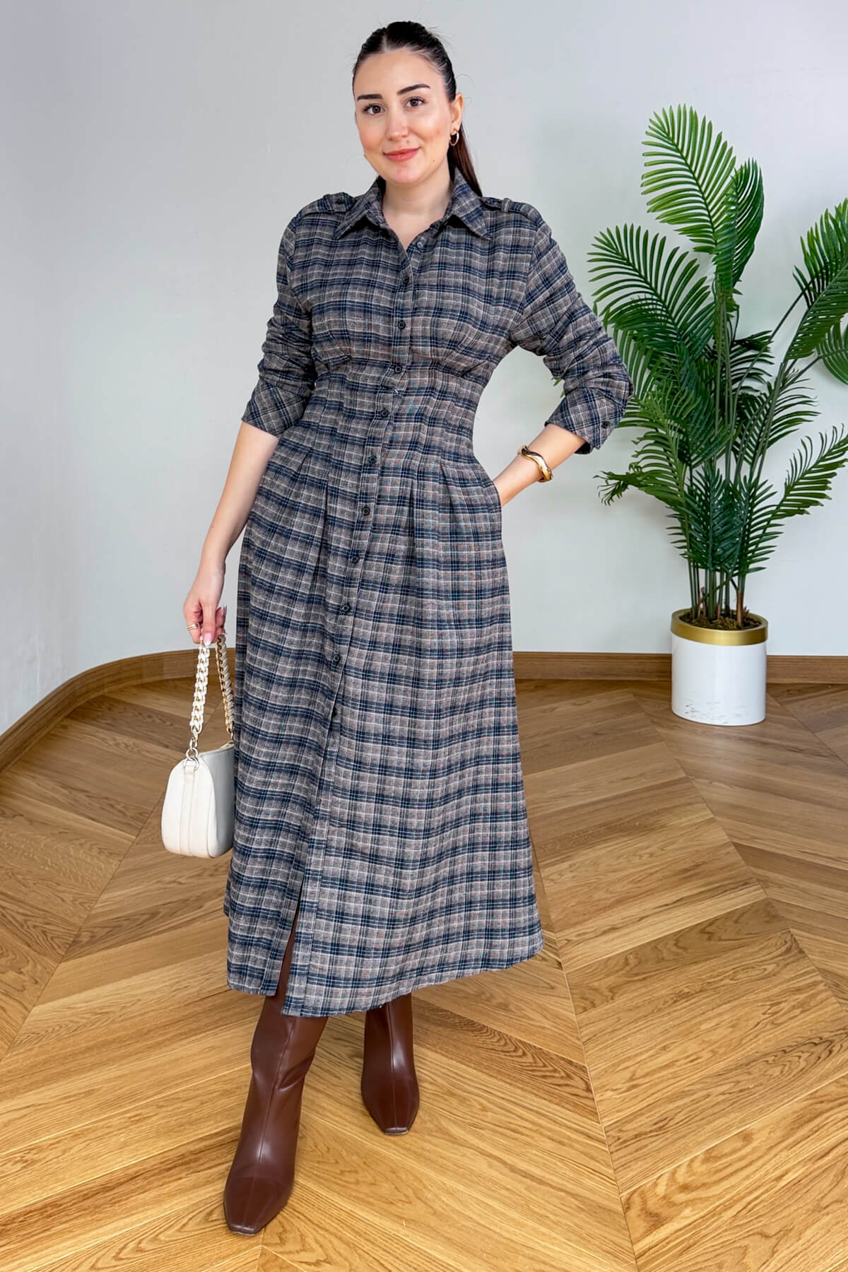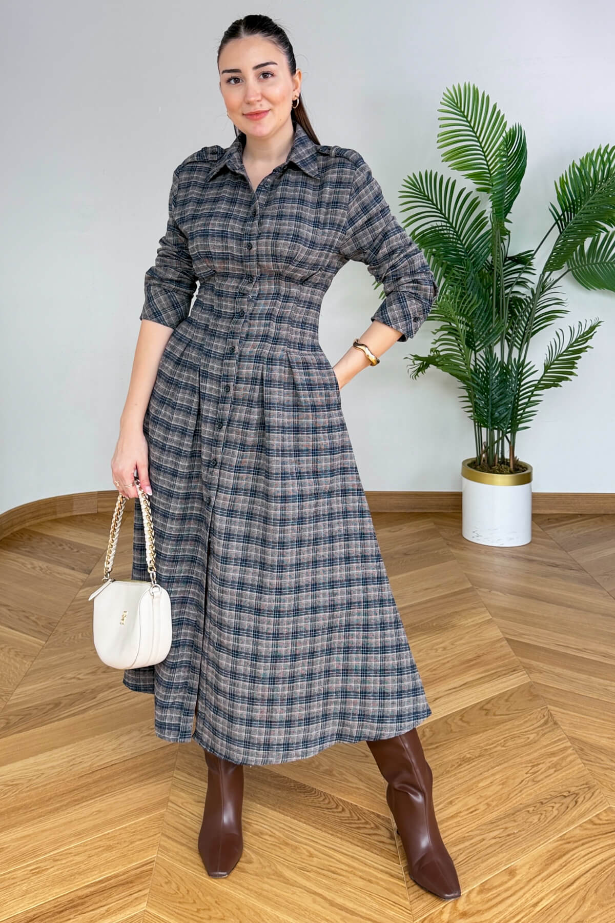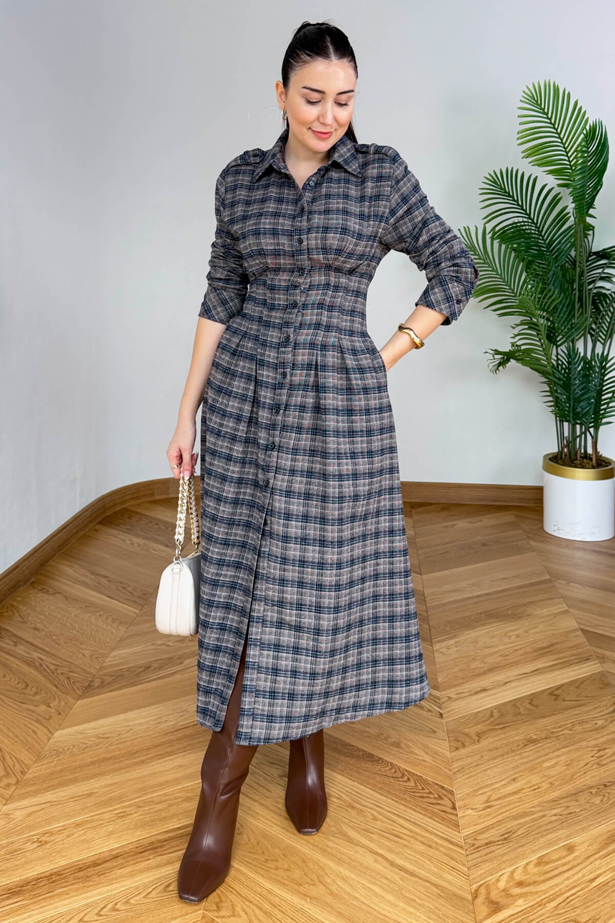 Kış sezonunun favori deseni ekose, bu elbisede güçlü detaylarla buluşuyor. 124 cm uzunluğuyla ideal bir duruş sergileyen tasarım, omuzlardaki apoletlerle karakteristik bir hava kazanıyor. Bel bölgesindeki ince pilise detayları vücut hatlarını zarifçe ortaya çıkarır ve fit bir görünüm sağlar. Kalın dokuma kumaşı sayesinde soğuk günlerde sıcak bir kullanım sunan bu elbise, boydan düğmeli ve gömlek yakalı yapısıyla pratikliği şıklıkla birleştirir.