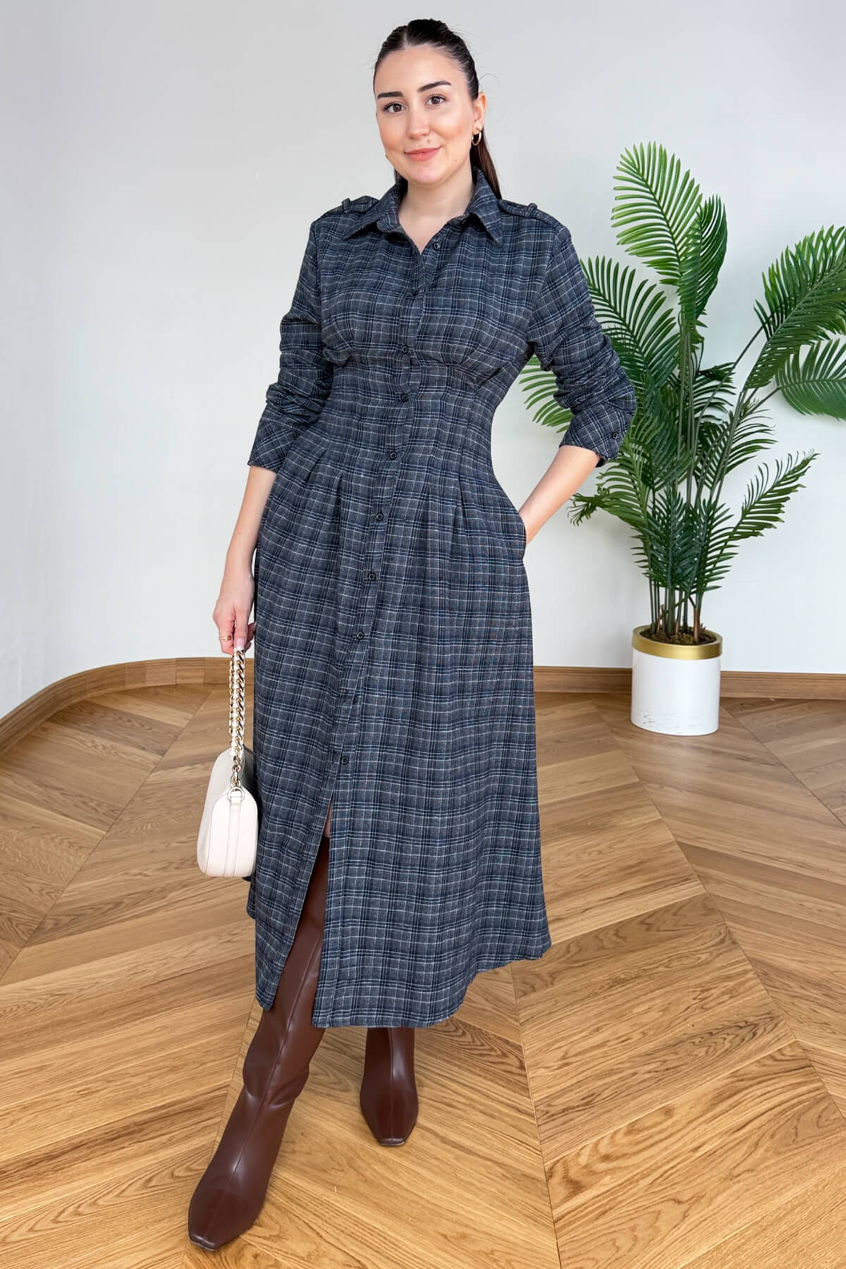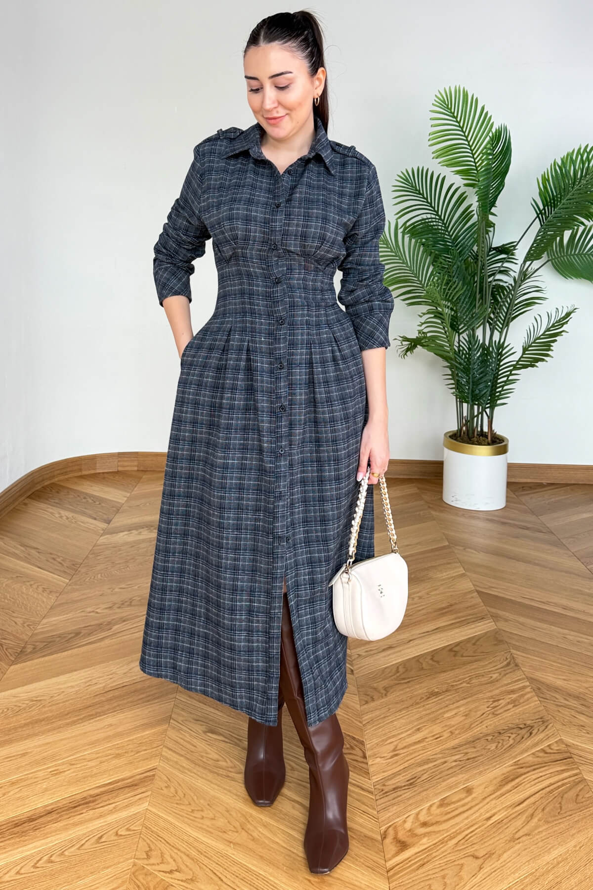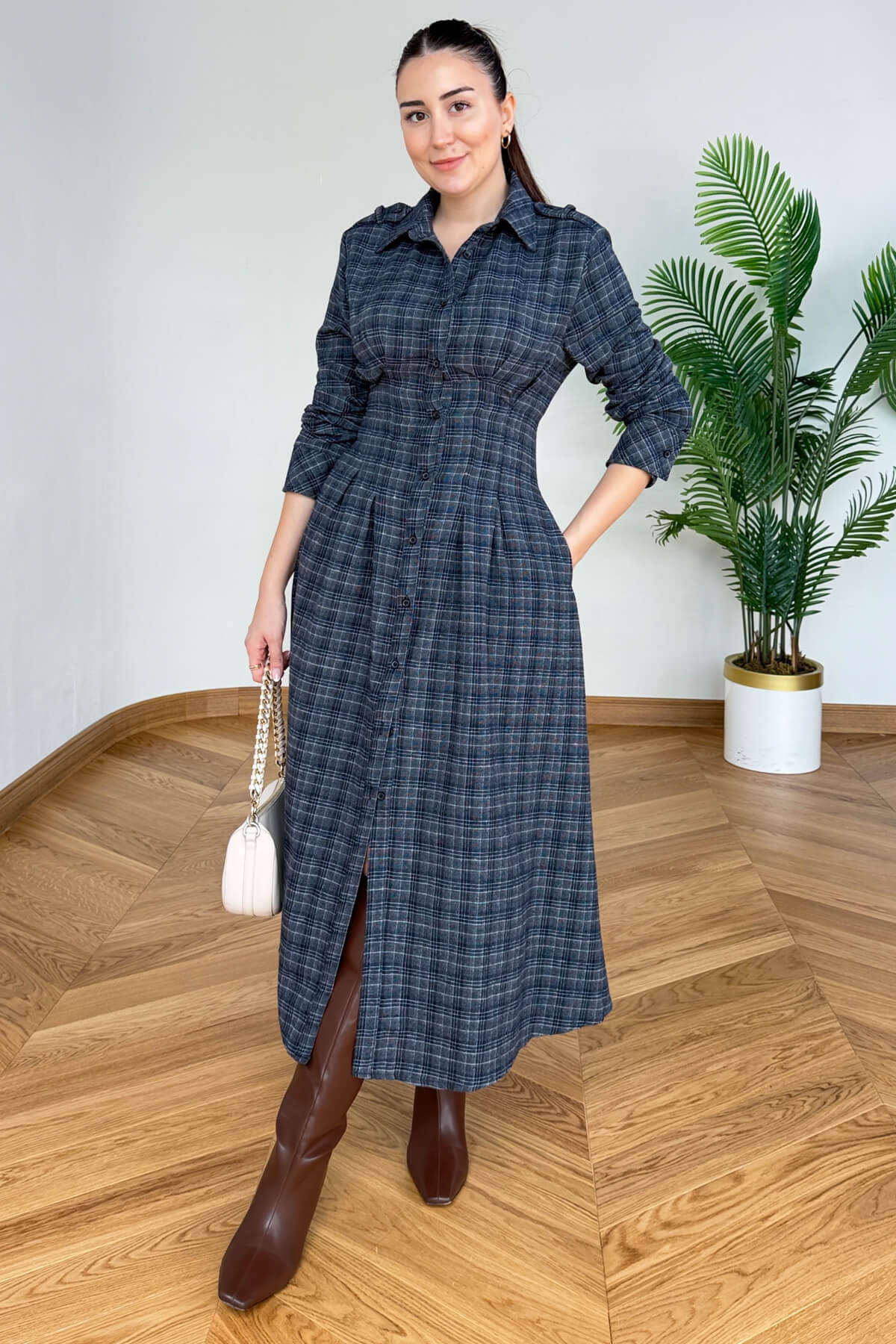 Kış sezonunun favori deseni ekose, bu elbisede güçlü detaylarla buluşuyor. 124 cm uzunluğuyla ideal bir duruş sergileyen tasarım, omuzlardaki apoletlerle karakteristik bir hava kazanıyor. Bel bölgesindeki ince pilise detayları vücut hatlarını zarifçe ortaya çıkarır. Modelin kalıbı dar olduğu için, konforlu bir kullanım adına normal bedeninizden bir beden büyük tercih etmenizi öneririz. Kalın dokuma kumaşı sayesinde soğuk günlerde sıcak bir kullanım sunan bu elbise, boydan düğmeli ve gömlek yakalı yapısıyla pratikliği şıklıkla birleştirir.