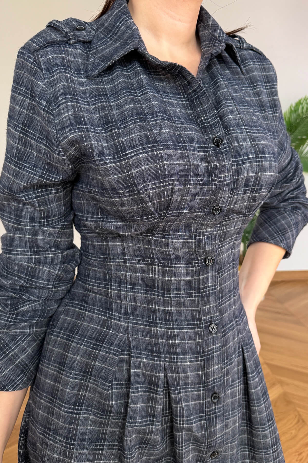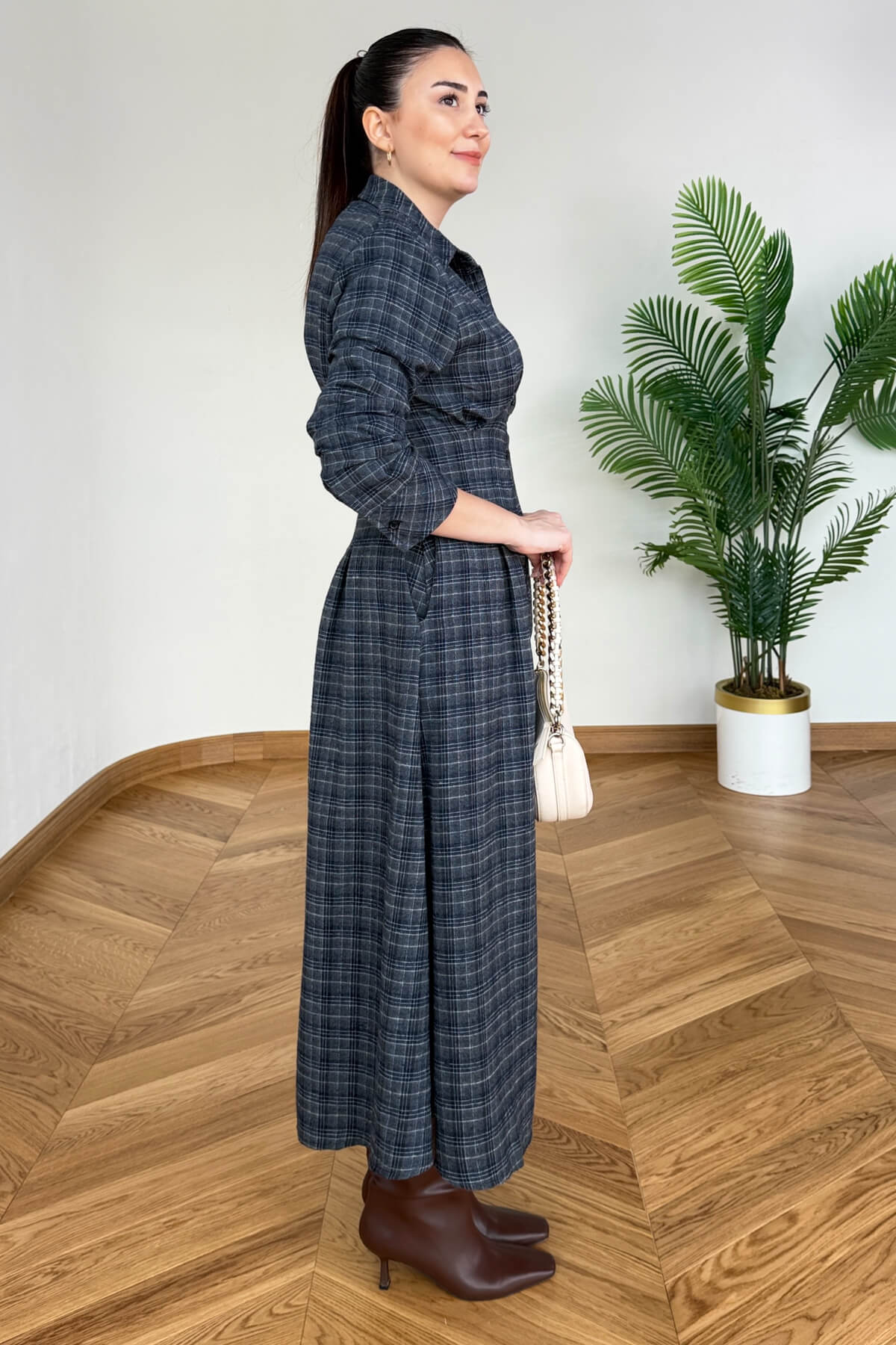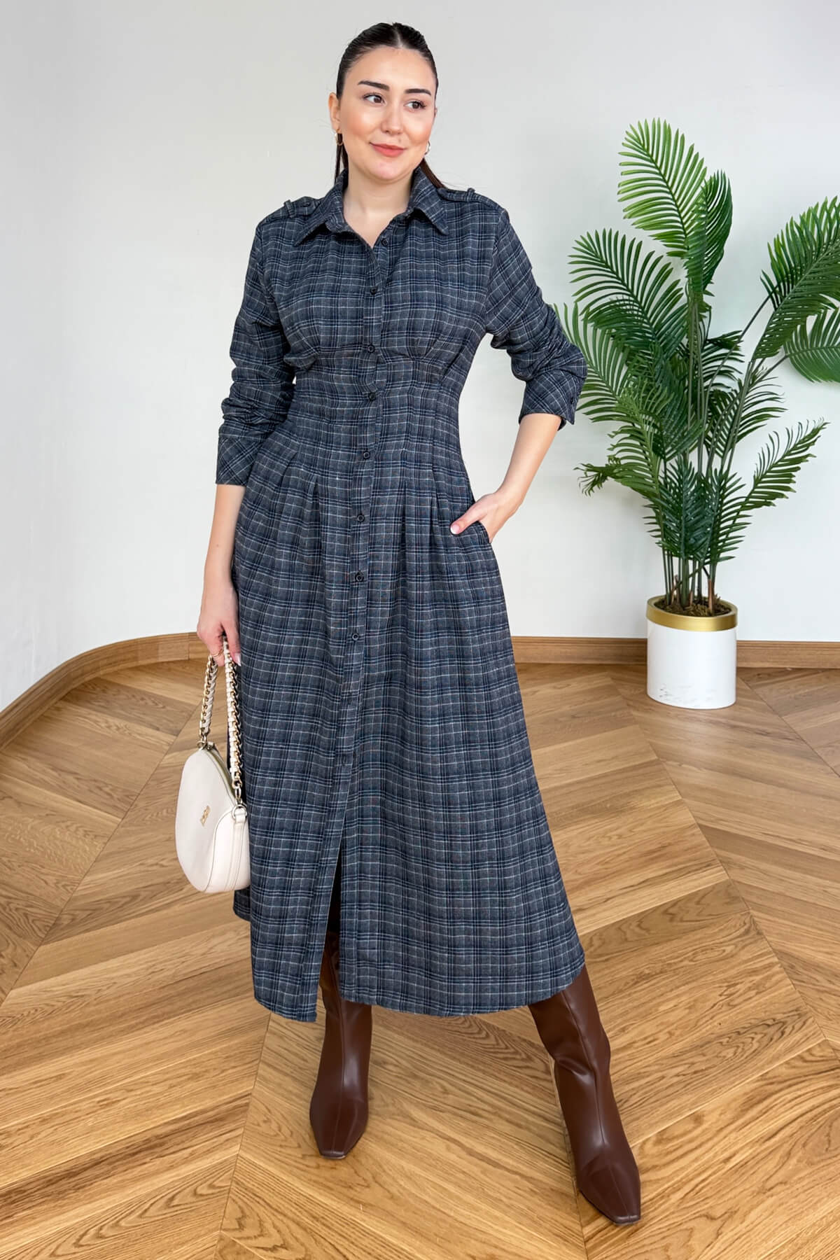 Kış sezonunun favori deseni ekose, bu elbisede güçlü detaylarla buluşuyor. 124 cm uzunluğuyla ideal bir duruş sergileyen tasarım, omuzlardaki apoletlerle karakteristik bir hava kazanıyor. Bel bölgesindeki ince pilise detayları vücut hatlarını zarifçe ortaya çıkarır. Modelin kalıbı dar olduğu için, konforlu bir kullanım adına normal bedeninizden bir beden büyük tercih etmenizi öneririz. Kalın dokuma kumaşı sayesinde soğuk günlerde sıcak bir kullanım sunan bu elbise, boydan düğmeli ve gömlek yakalı yapısıyla pratikliği şıklıkla birleştirir.