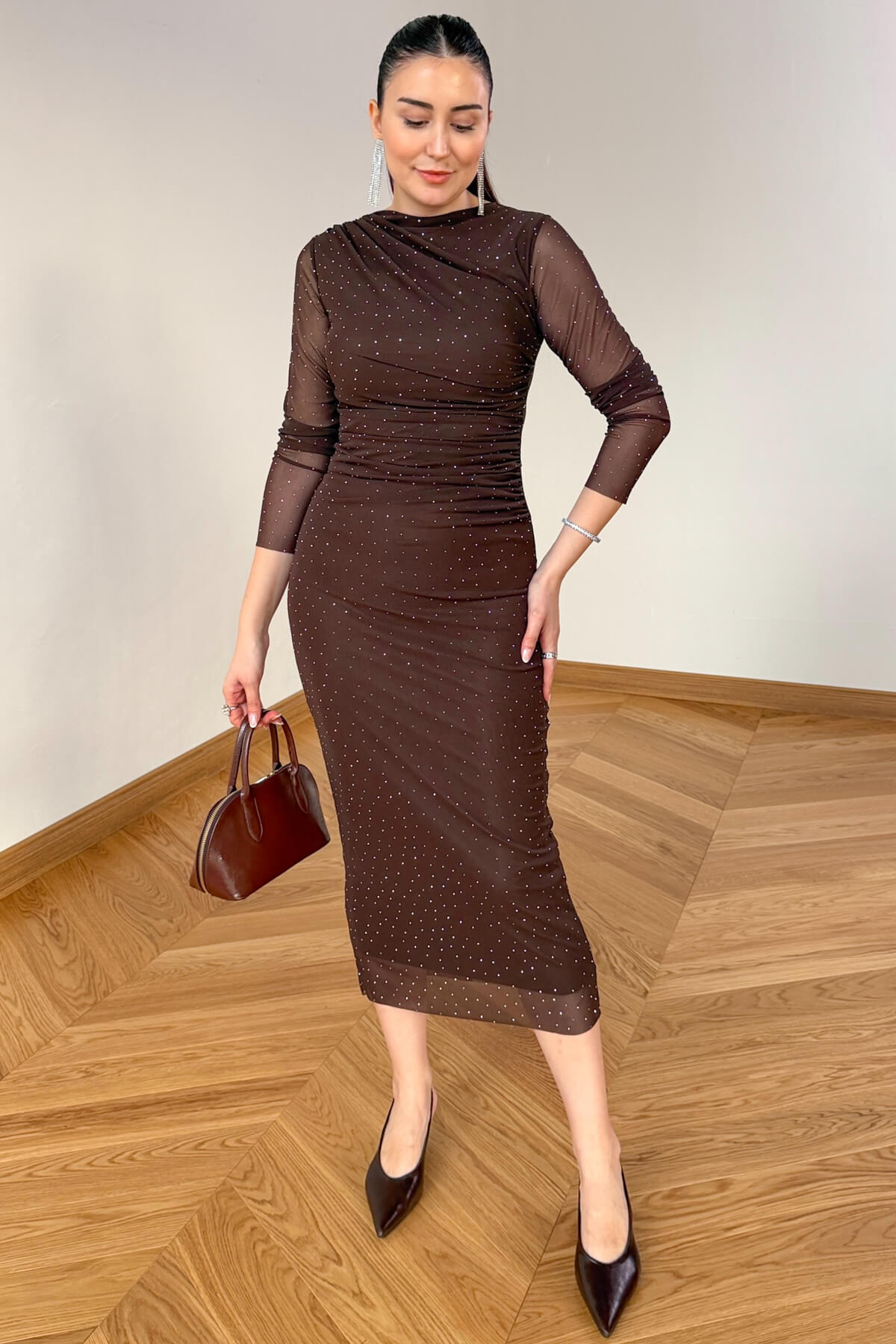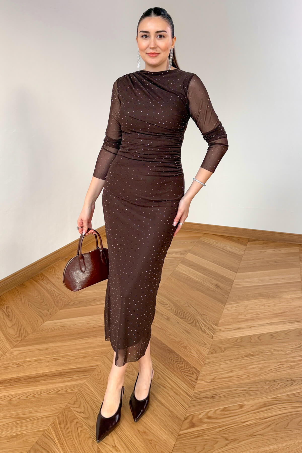 Tüm yüzeyi kaplayan ışıltılı taş detayları ve vücudu kusursuzca saran formuyla bu elbise, özel davetlerin vazgeçilmezi olmaya aday. Gövde boyunca uzanan yoğun yan drape (büzgü) detayları, hem modern bir görünüm sunar hem de daha fit ve ince bir silüet yaratır. Esnek tül kumaşın konforunu tam boy astarın güveniyle birleştiren tasarım, iç göstermeyen yapısıyla rahatça hareket etmenizi sağlar. 132 cm’lik maxi boyu ve zarif şeffaf kol detaylarıyla asil bir duruş sergiler.