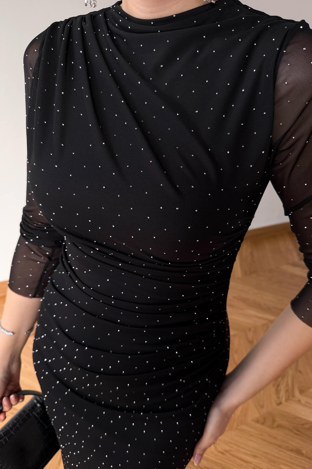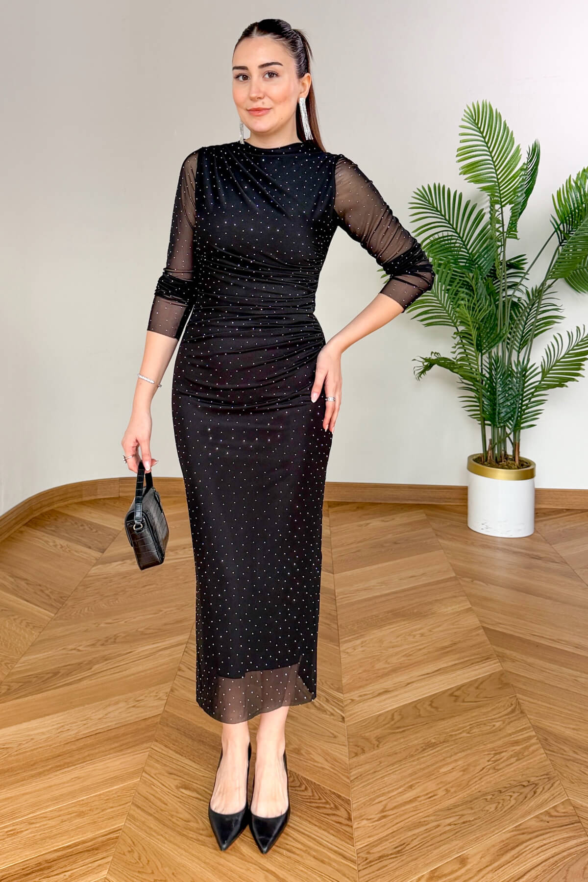 Tüm yüzeyi kaplayan ışıltılı taş detayları ve vücudu kusursuzca saran formuyla bu elbise, özel davetlerin vazgeçilmezi olmaya aday. Gövde boyunca uzanan yoğun yan drape (büzgü) detayları, hem modern bir görünüm sunar hem de daha fit ve ince bir silüet yaratır. Esnek tül kumaşın konforunu tam boy astarın güveniyle birleştiren tasarım, iç göstermeyen yapısıyla rahatça hareket etmenizi sağlar. 132 cm’lik maxi boyu ve zarif şeffaf kol detaylarıyla asil bir duruş sergiler.