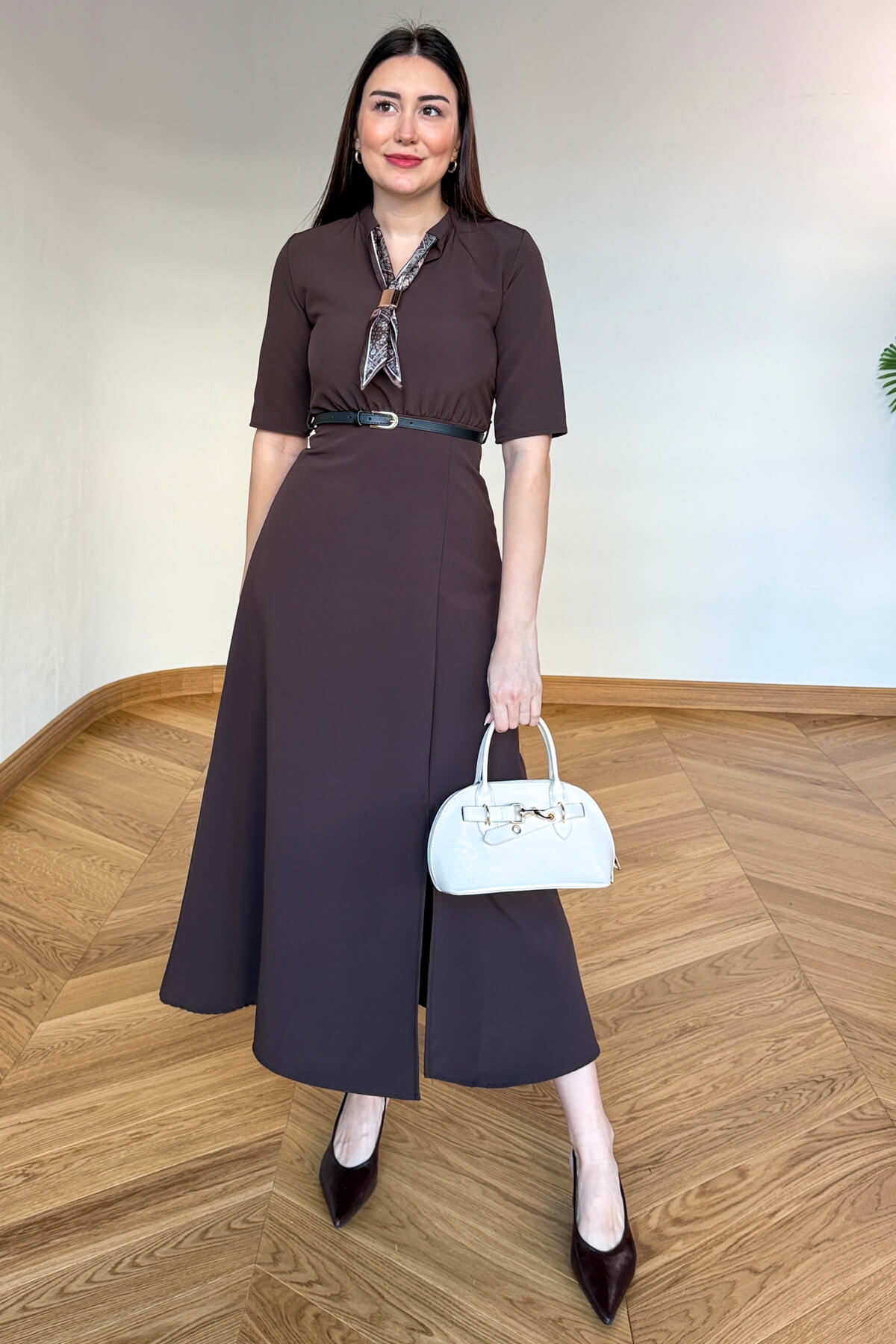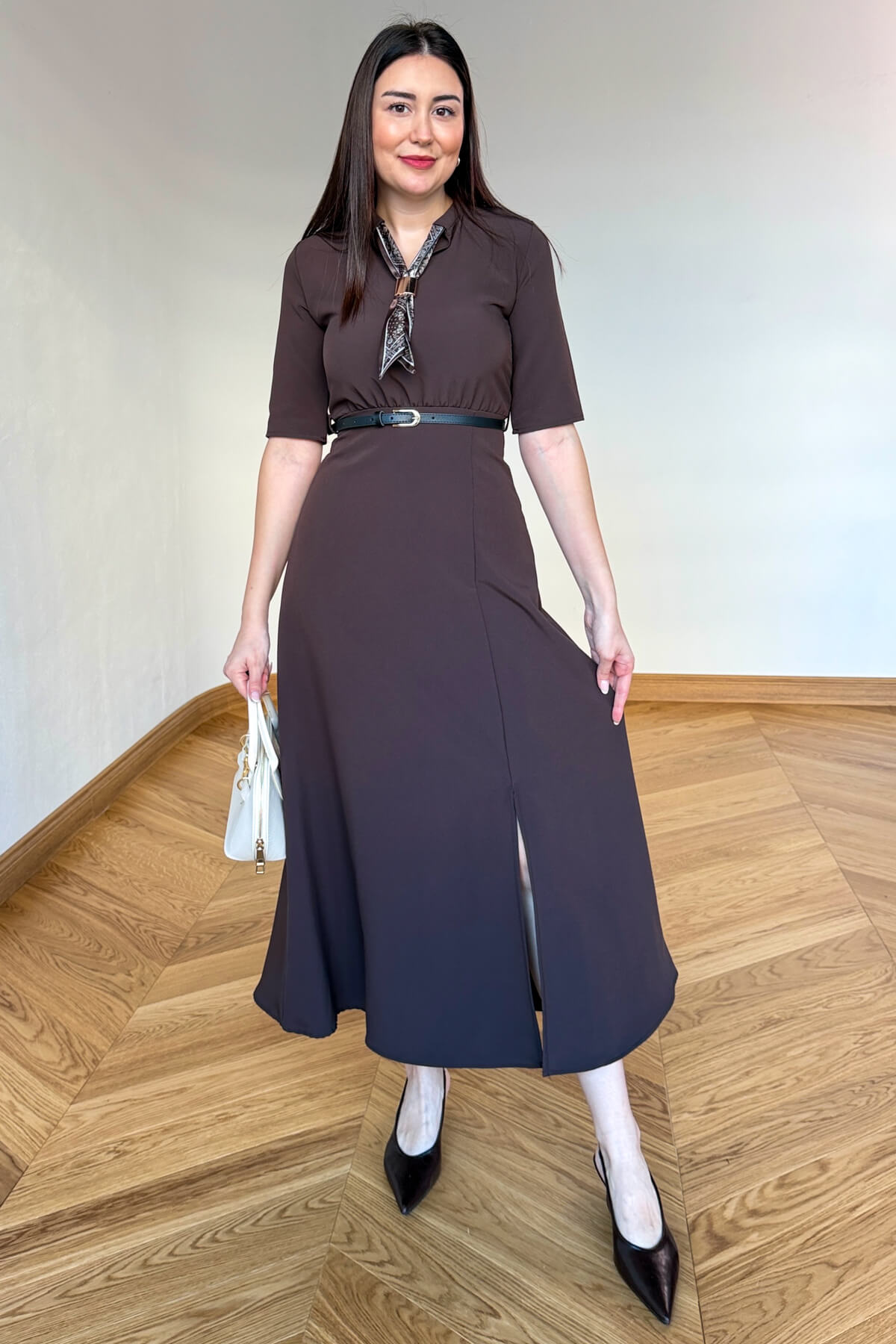 Kesim: Yırtmaçlı etek, kendinden kemerli bel.