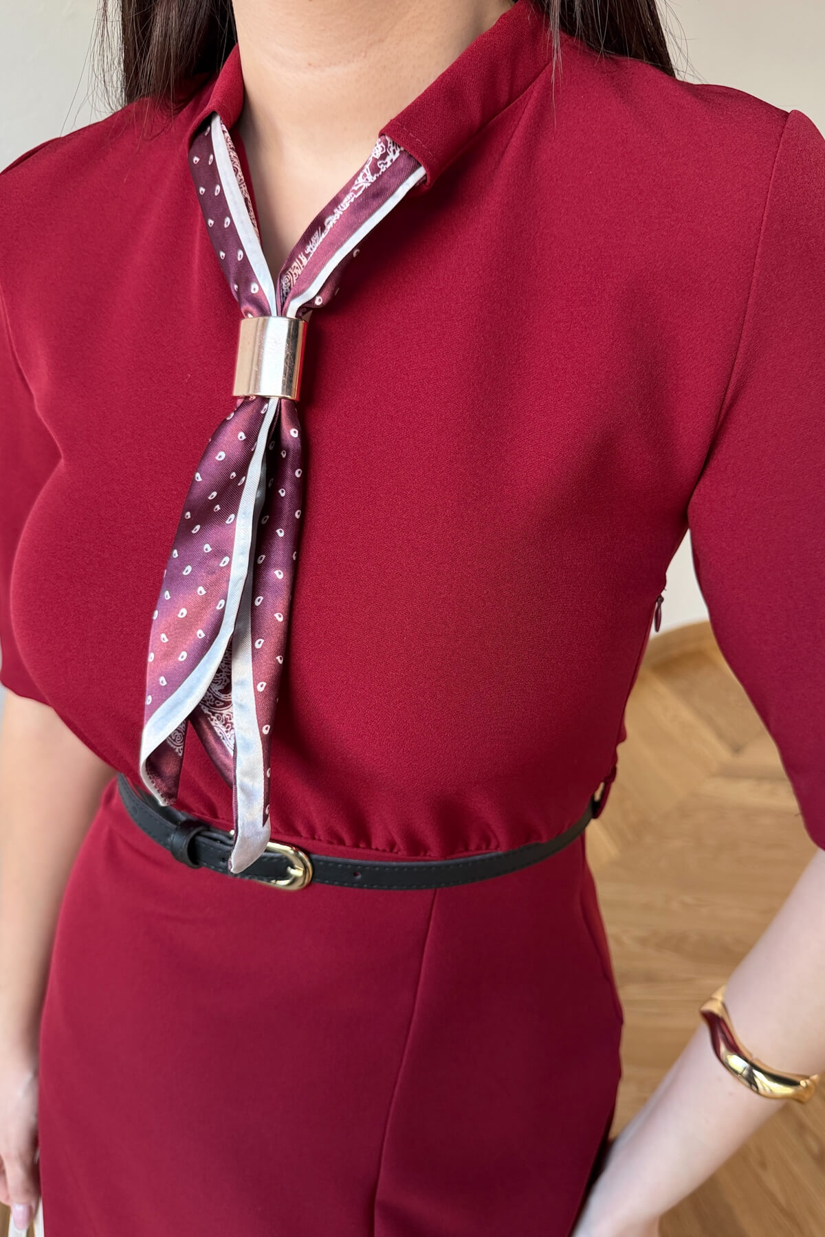 Tasarım Detayı: Yaka kısmında metal halka içinden geçen desenli fular.