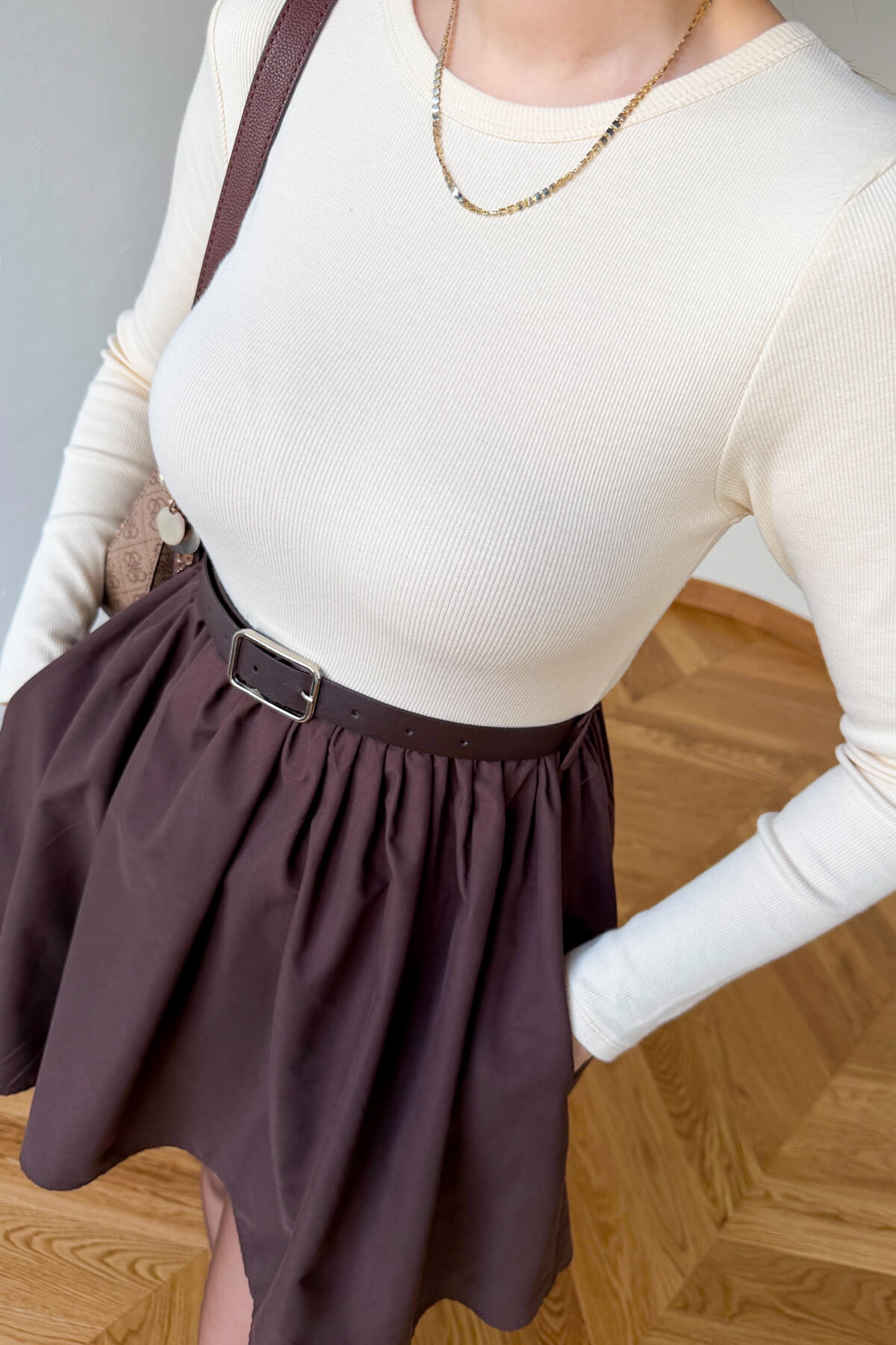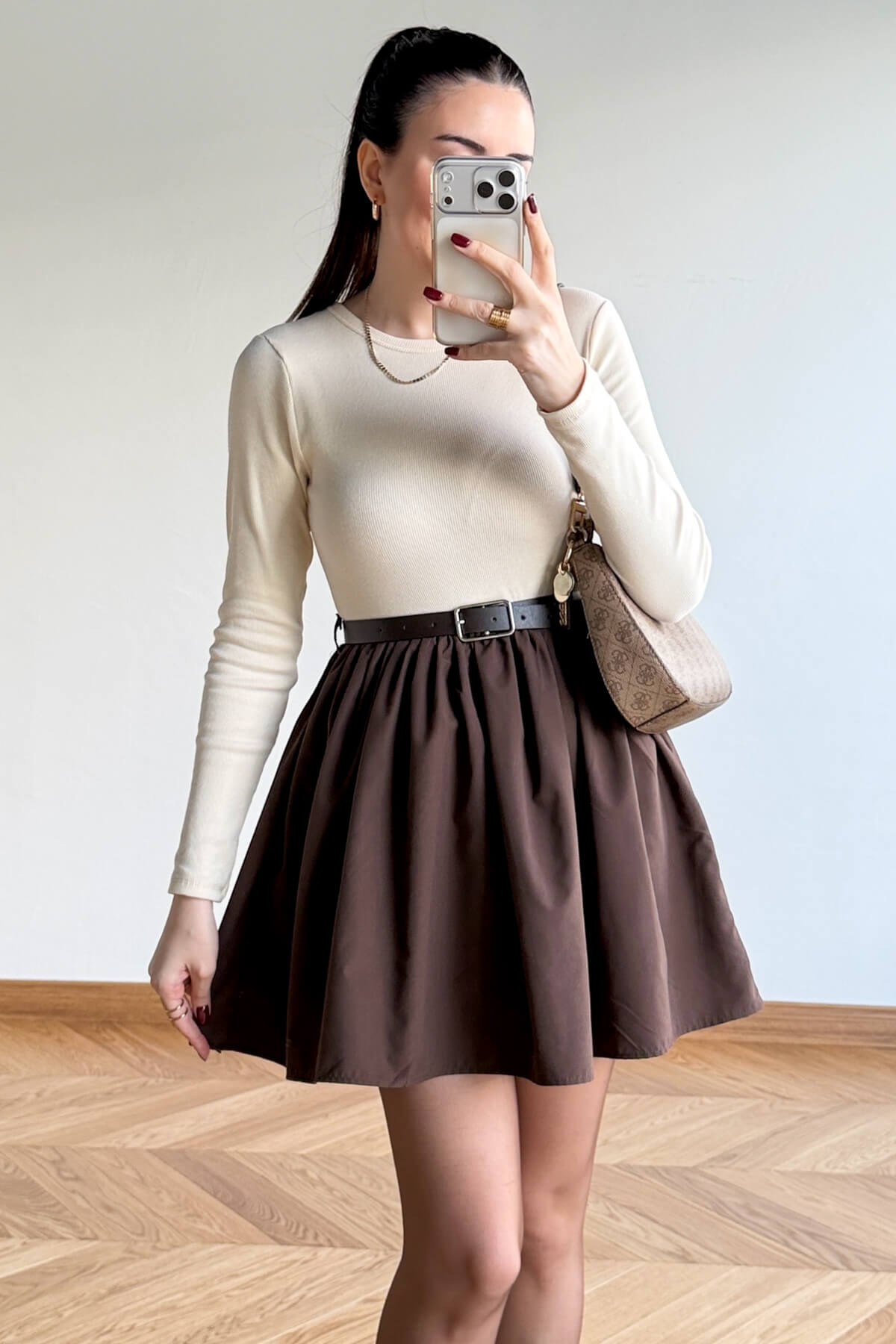 Tek parçada iki farklı dokuyu ve stili buluşturan bu tasarım elbise, zahmetsiz şıklığın en pratik halini sunuyor. Üst bedenindeki esnek fitilli doku vücudu nazikçe sararken, belden aşağıya doğru genişleyen tok duruşlu etek kısmı modern ve dinamik bir silüet yaratıyor. Sanki bir bluz ve eteği kombinlemişsiniz gibi görünen bu özel tasarım, 80 cm’lik mini boyuyla enerjik bir duruş sergiliyor. Kendi kumaşından tasarlanan uzun kuşak detayı ise belinizi vurgulayarak feminen bir dokunuş katıyor.