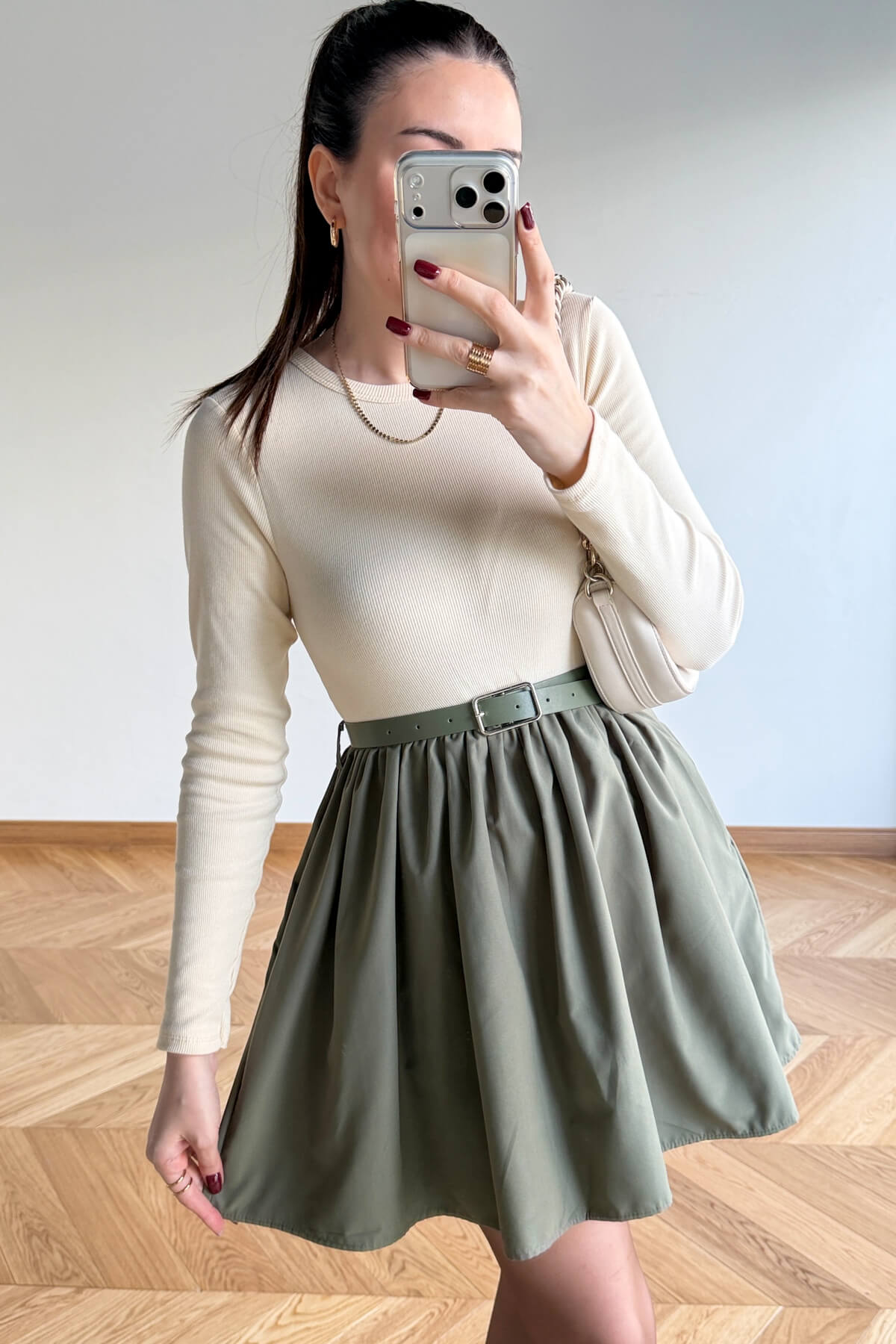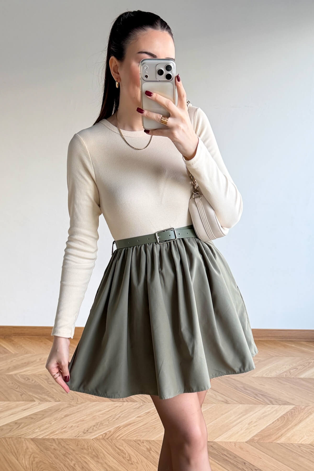 Tek parçada iki farklı dokuyu ve stili buluşturan bu tasarım elbise, zahmetsiz şıklığın en pratik halini sunuyor. Üst bedenindeki esnek fitilli doku vücudu nazikçe sararken, belden aşağıya doğru genişleyen tok duruşlu etek kısmı modern ve dinamik bir silüet yaratıyor. Sanki bir bluz ve eteği kombinlemişsiniz gibi görünen bu özel tasarım, 80 cm’lik mini boyuyla enerjik bir duruş sergiliyor. Kendi kumaşından tasarlanan uzun kuşak detayı ise belinizi vurgulayarak feminen bir dokunuş katıyor.
