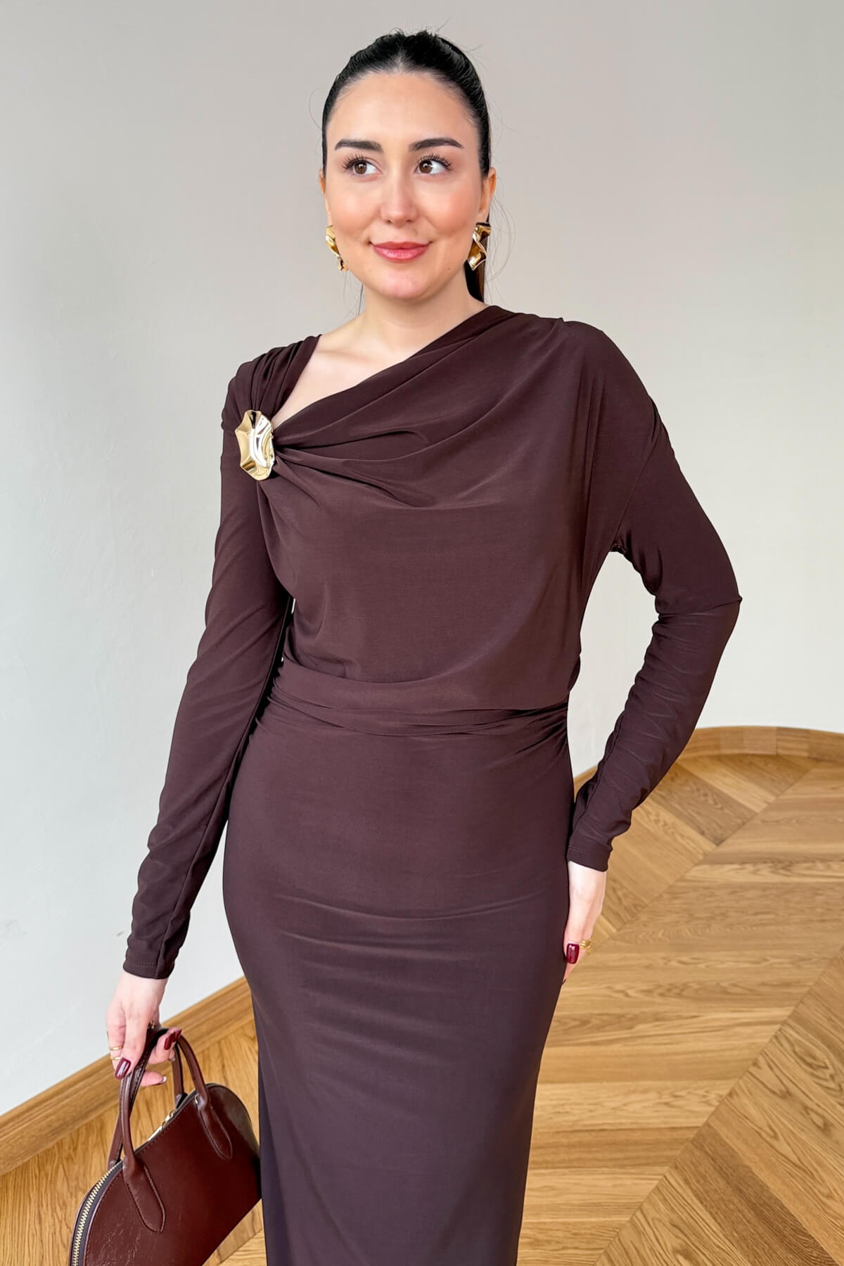 Tasarım Detayı: Omuzda büzgü üzerine konumlandırılmış gold metal aksesuar (broş)