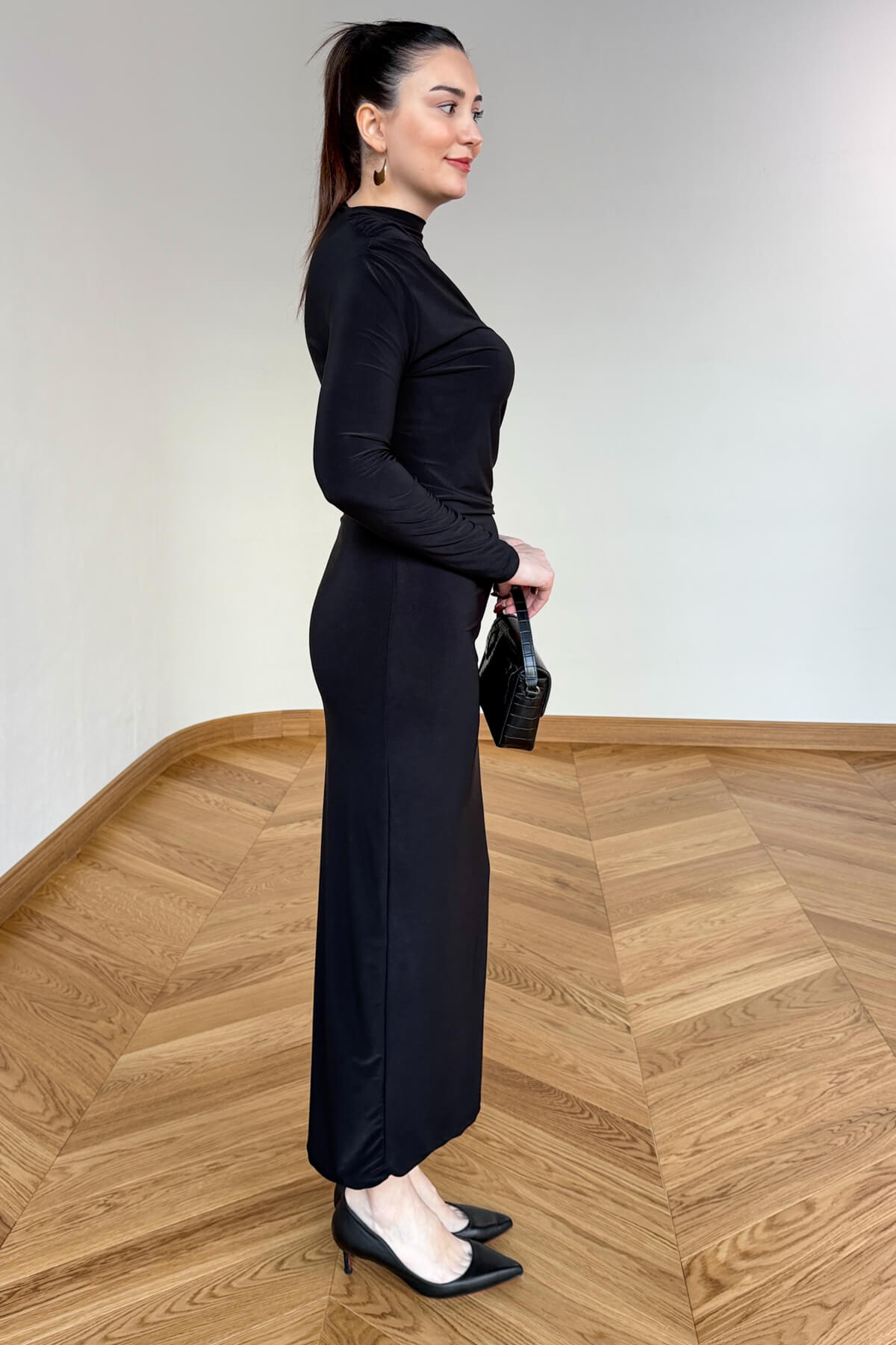 Siyahın asaletini modern tasarım detaylarıyla birleştiren bu elbise, özel davetlerde zarif bir silüet yaratmanız için tasarlandı. Akışkan yapılı sandy kumaşı sayesinde gün boyu konfor sunarken, bel kısmında yer alan gold broş ve eşlik eden drape detayları bel hattını incelterek feminen bir görünüm kazandırıyor. 140 cm uzunluğundaki maxi boyu ve esnek dokusuyla hem şık hem de rahat bir kullanım vadediyor.