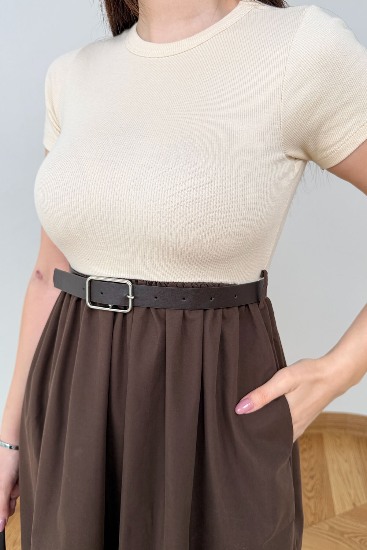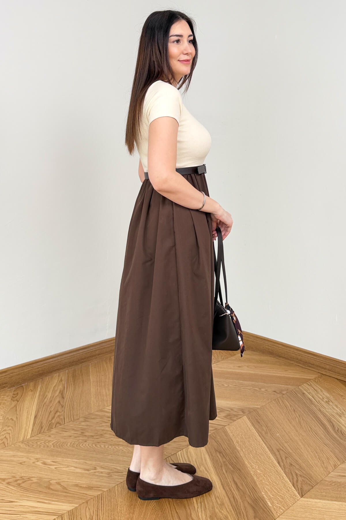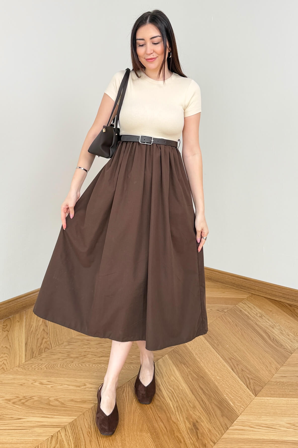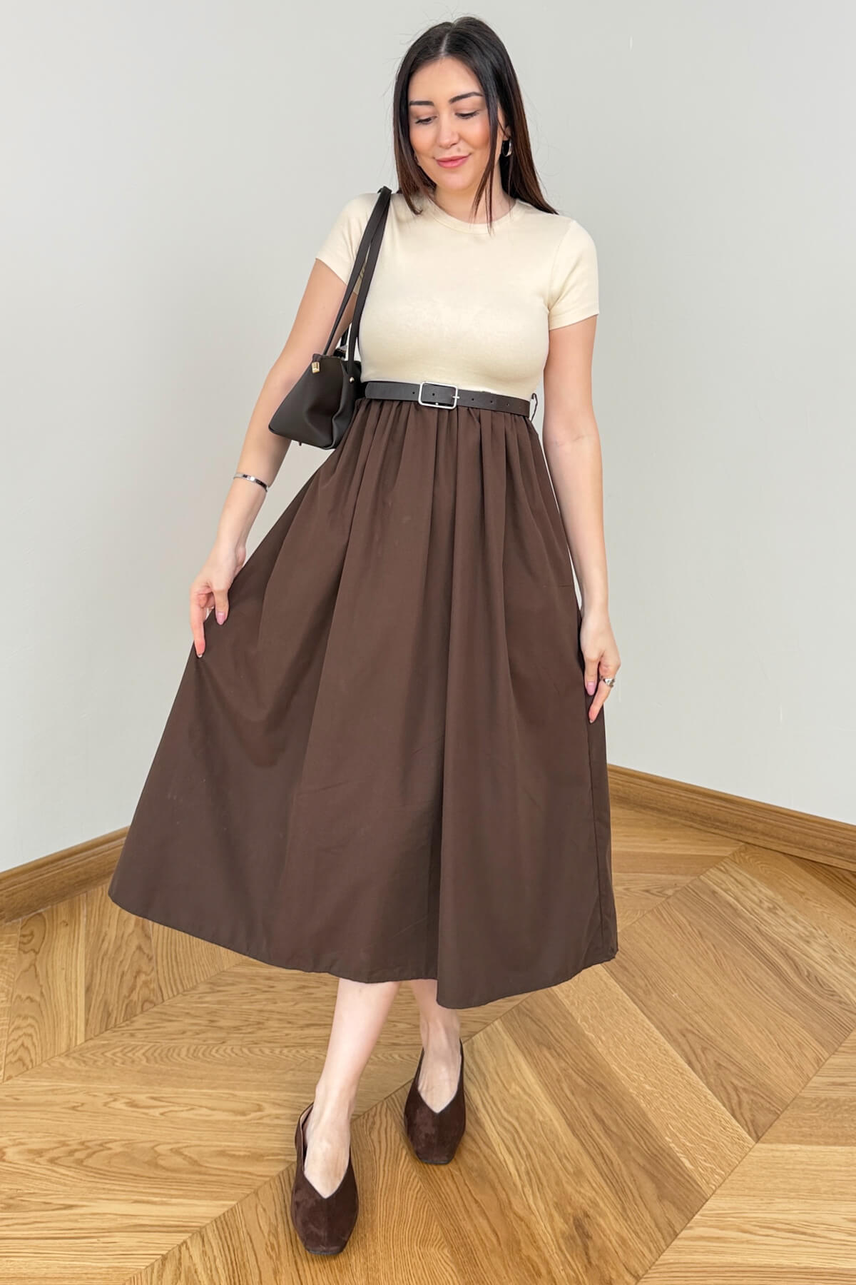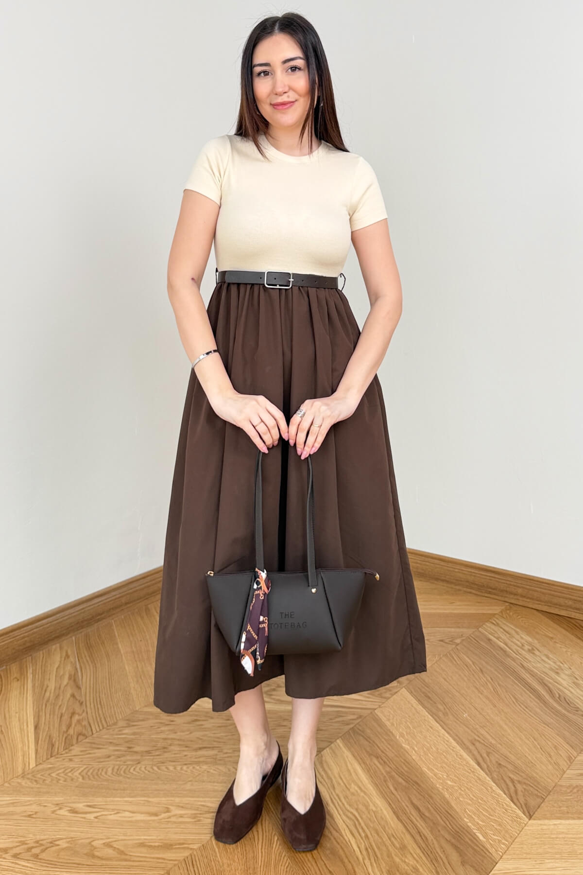Pamuklu penyenin konforu ile trikoton kumaşın asil duruşunu bir araya getiren bu iki parçalı görünümlü elbise, günlük şıklığınıza sofistike bir dokunuş katıyor. Üst kısmındaki yumuşak dokulu penye kumaş gün boyu rahatlık sunarken, alt kısımdaki tok duruşlu trikoton etek ucu kusursuz bir silüet oluşturur. 122 cm boyu ve beli vurgulayan şık kemer detayı ile modern bir duruş sergileyen bu tasarım, gardırobunuzun en işlevsel parçalarından biri olmaya aday.