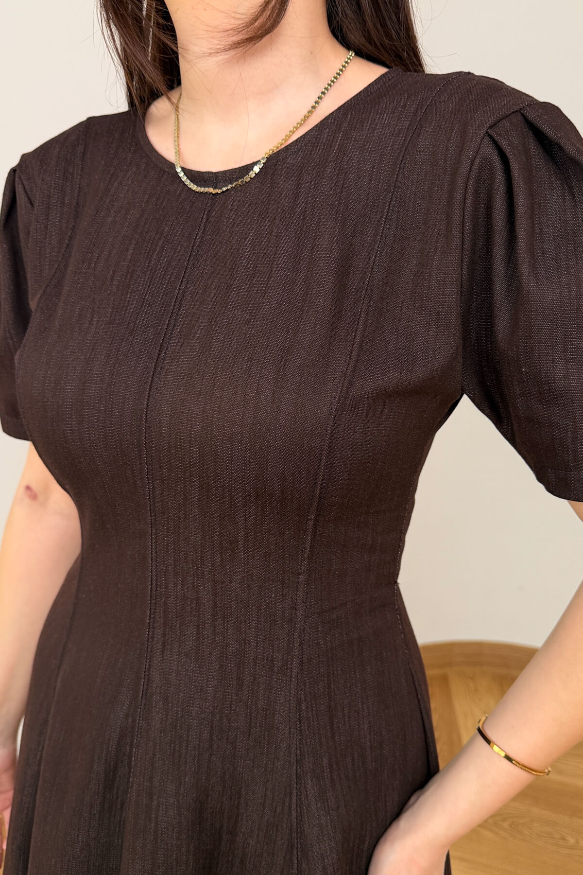 Tasarım Detayı: Omuz hattına hareket katan balon kol yapısı ve temiz bir bitiş sağlayan arka fermuar.