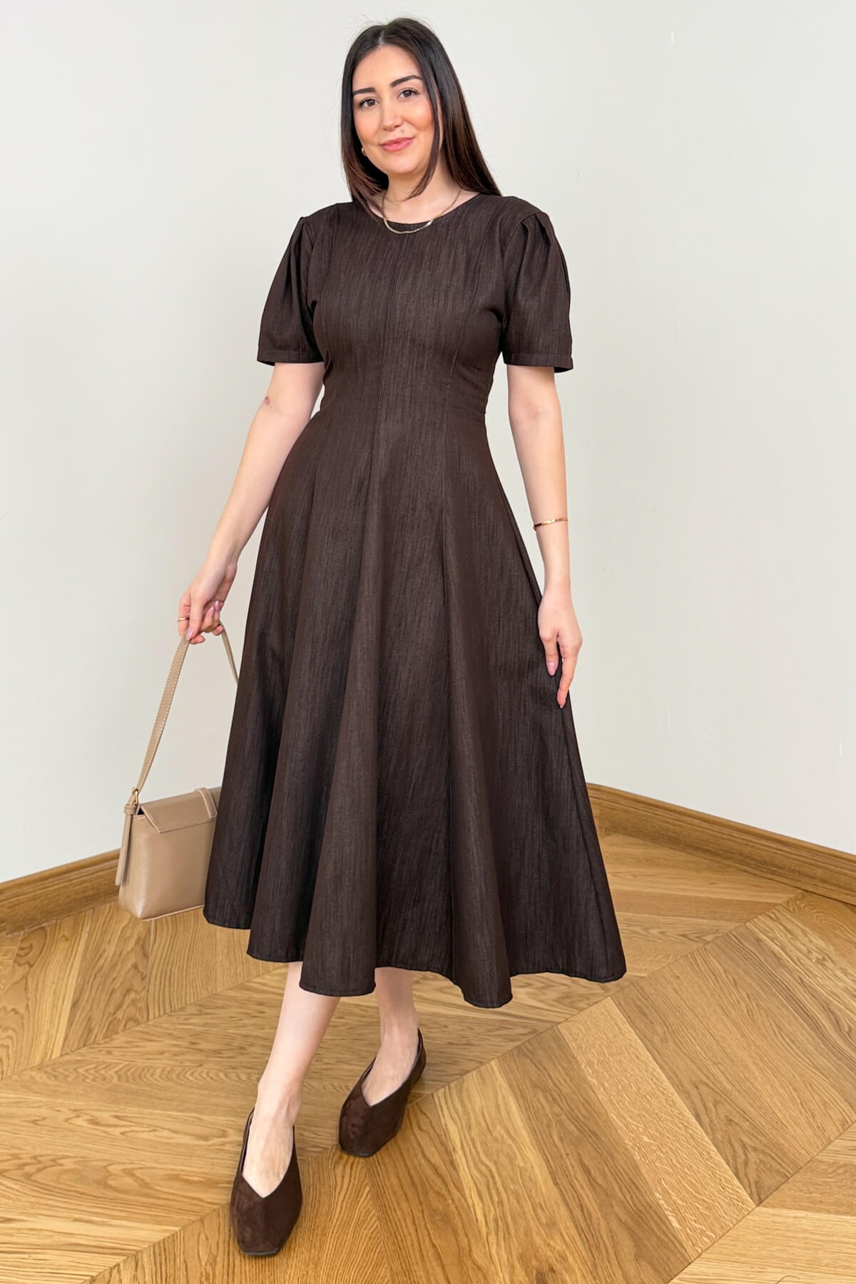 enim şıklığını feminen detaylarla yeniden yorumlayan bu tasarım, hem günlük hem de ofis stiliniz için kusursuz bir seçenek sunuyor. 120 cm boyu ve karakteristik balon kol yapısı ile modern bir silüet çizen elbise, kot kumaşın zamansız ve dayanıklı dokusunu zarif bir kesimle buluşturuyor. Arka kısmındaki gizli fermuar detayı sayesinde vücuda tam oturan bu parça, akışkan formuyla her adımda kendinizi hem rahat hem de sofistike hissetmenizi sağlıyor.