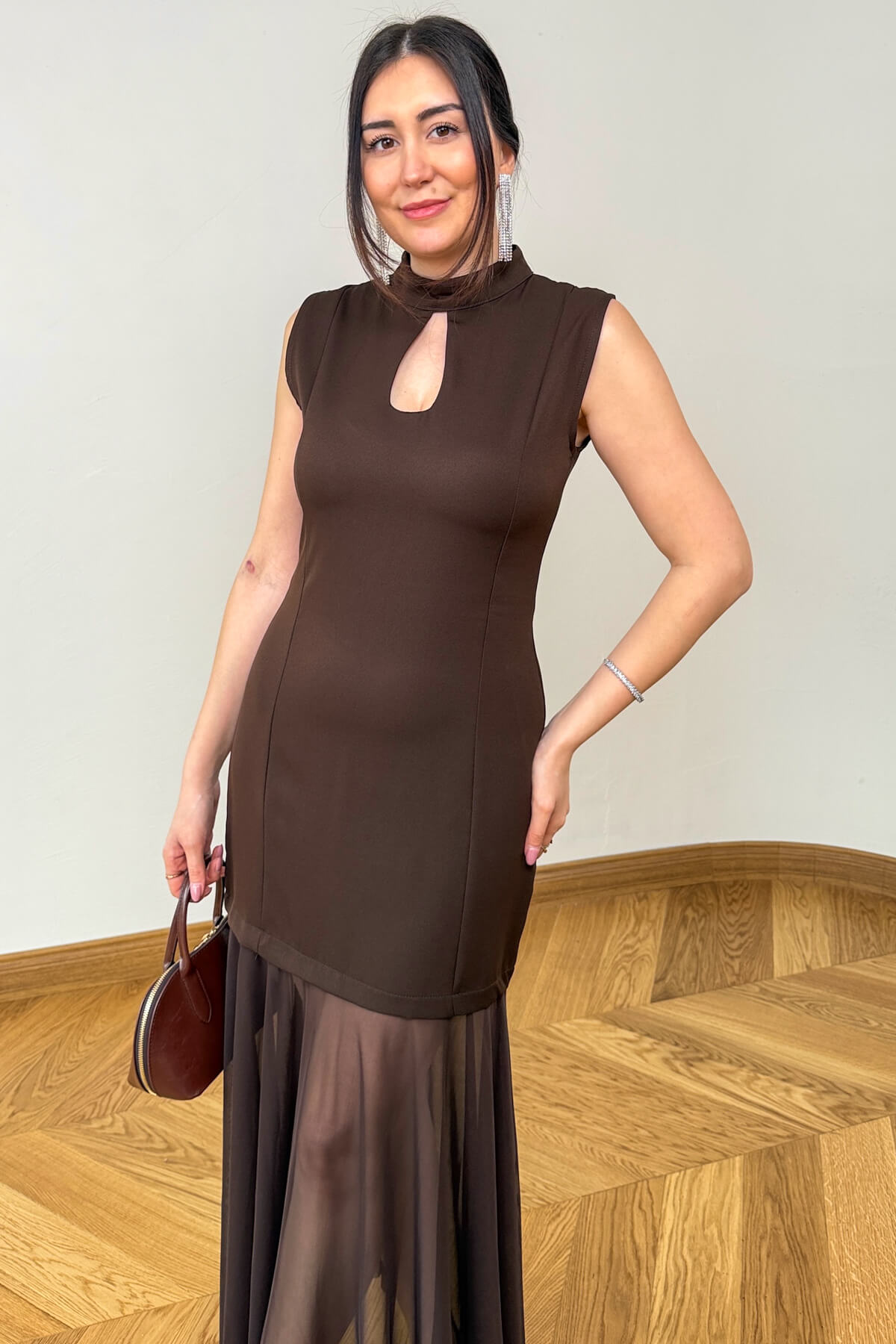 Tasarım Detayı: Göğüs kısmında modern pencere dekoltesi ve etek ucunda akışkan tül garnisi.