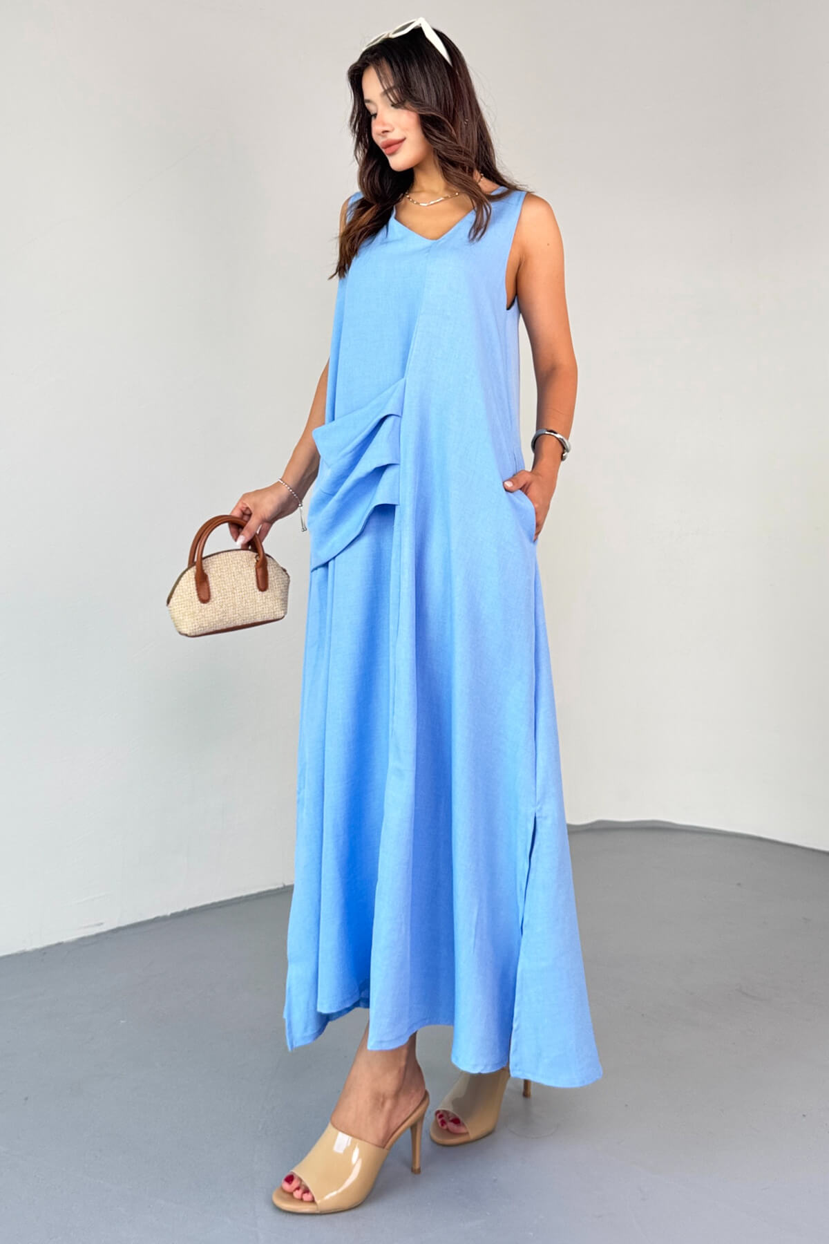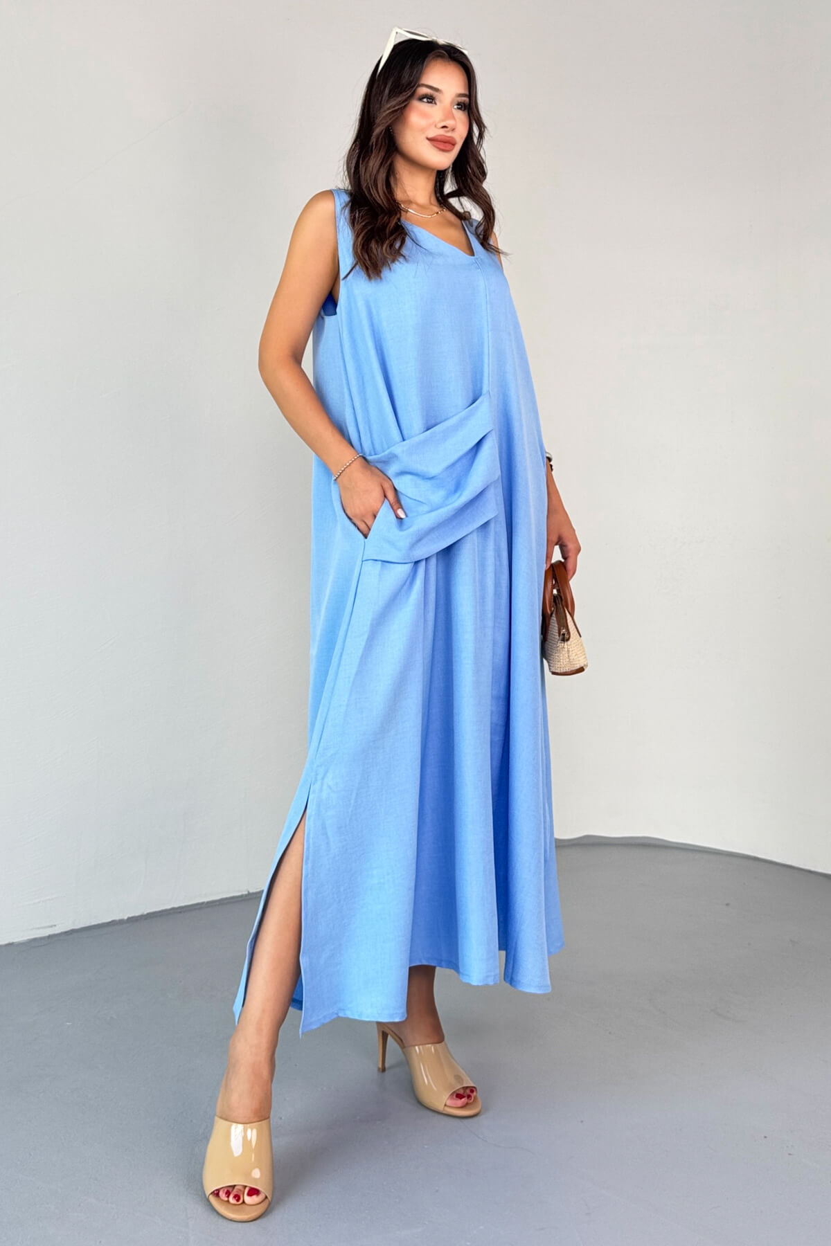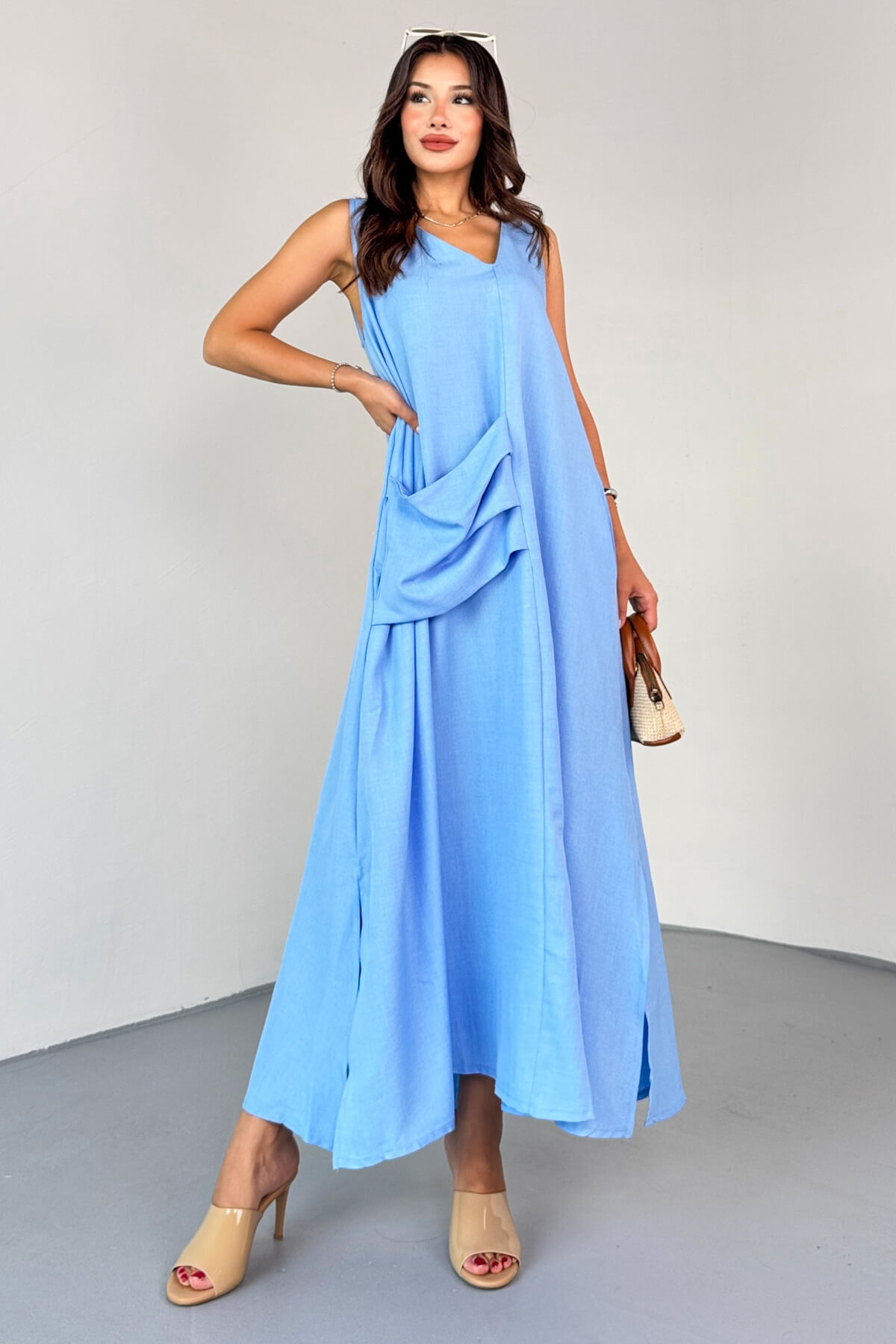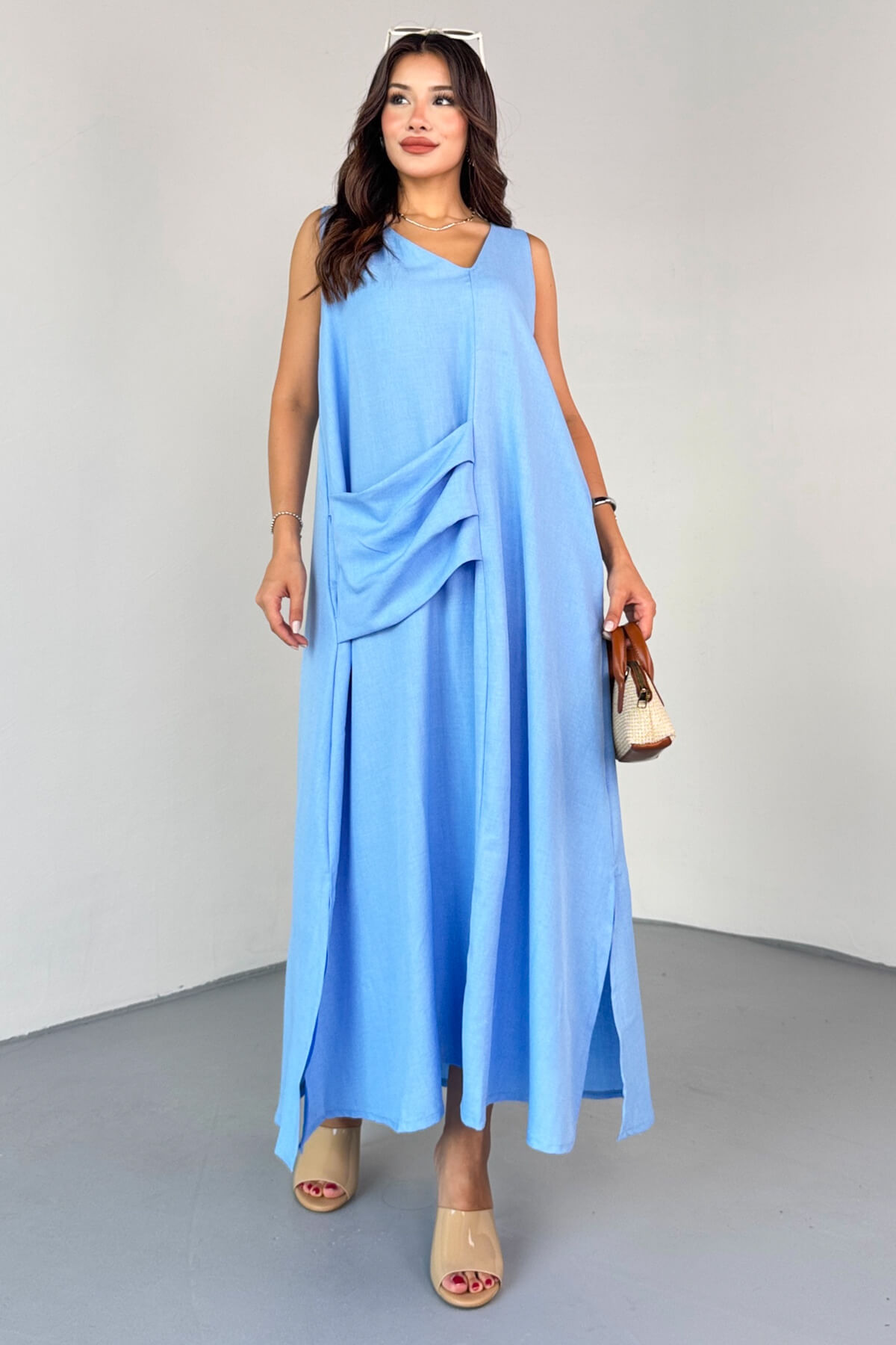 ELB-3078 Mavi Asimetrik Yaka Yan Yırtmaçlı Cepli Uzun Yazlık Elbise