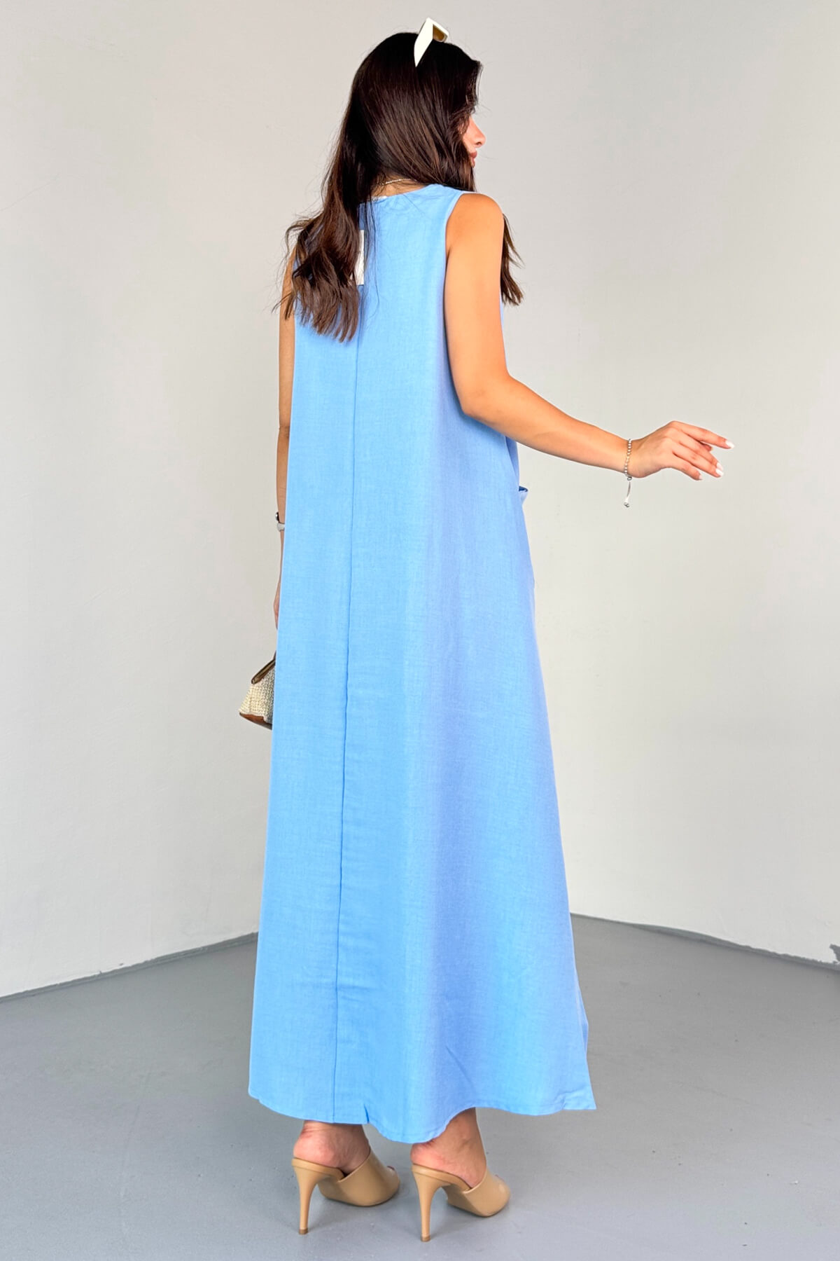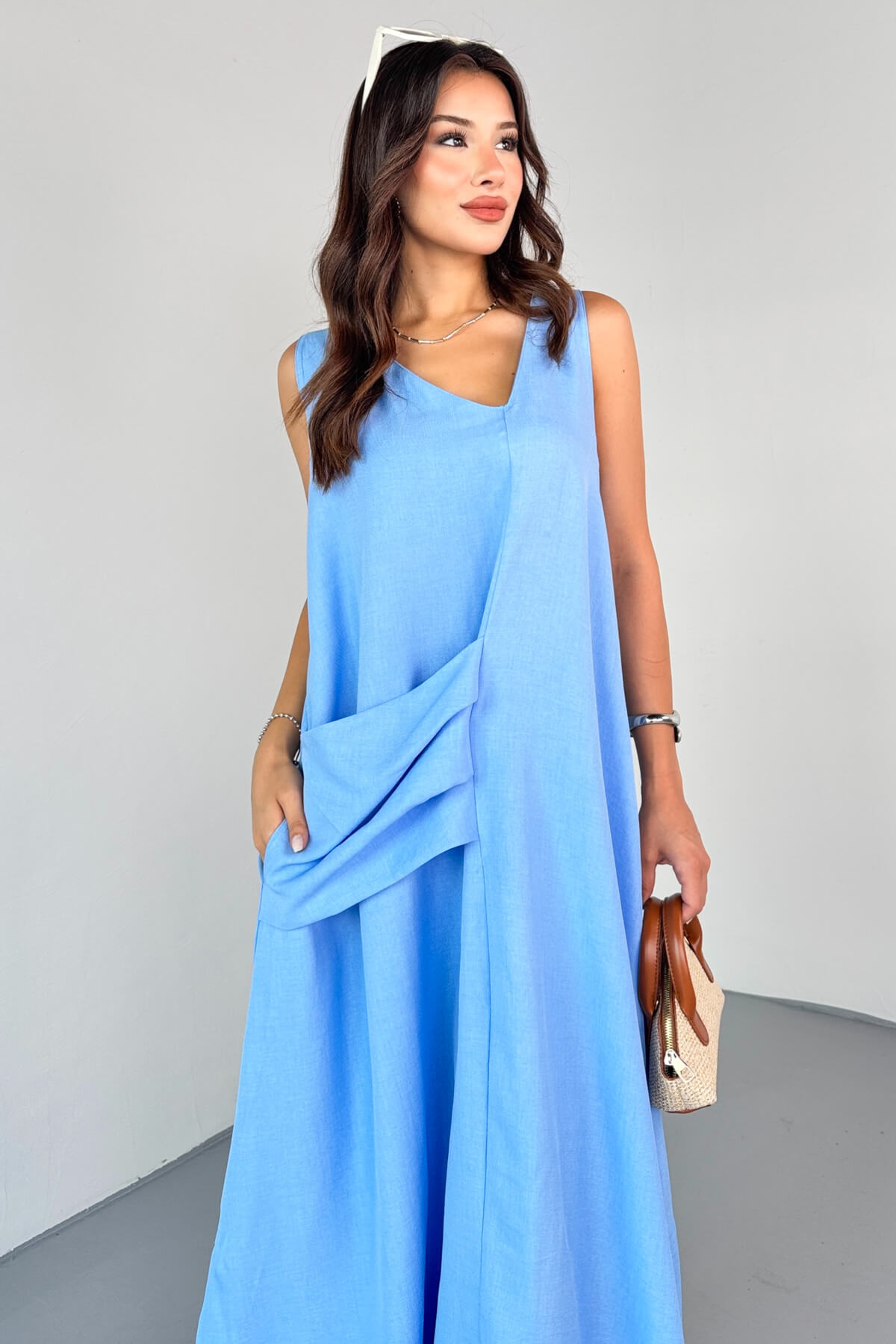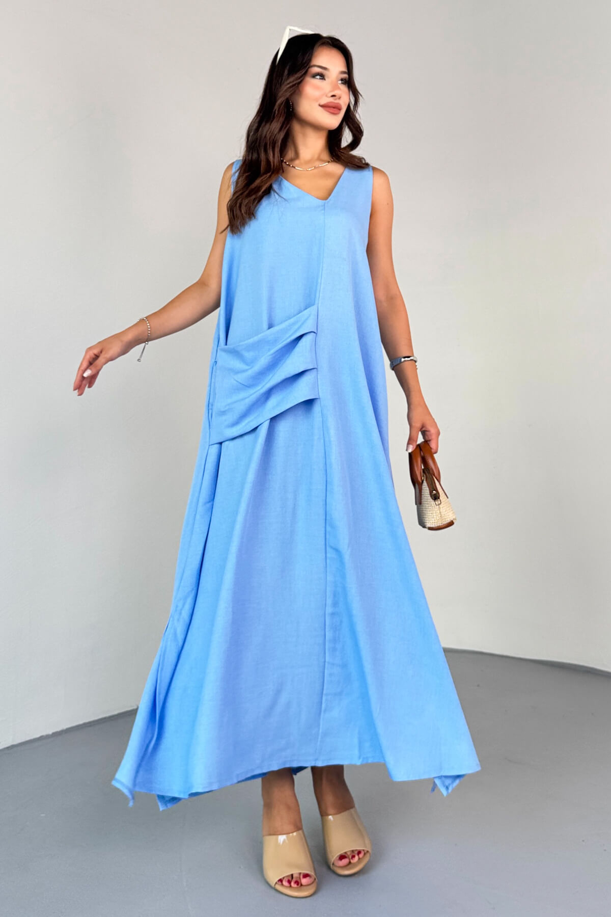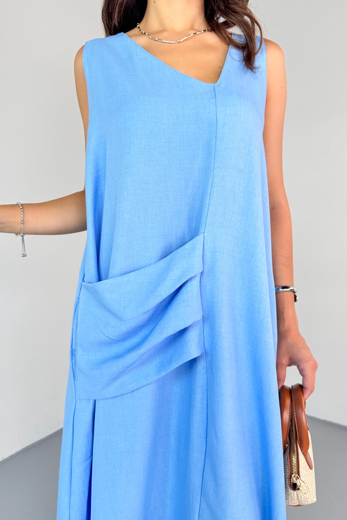 ELB-3078 Mavi Asimetrik Yaka Yan Yırtmaçlı Cepli Uzun Yazlık Elbise