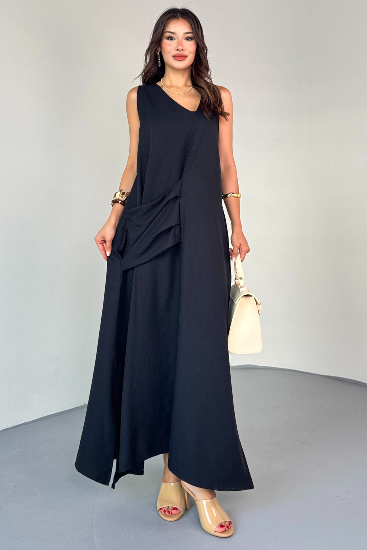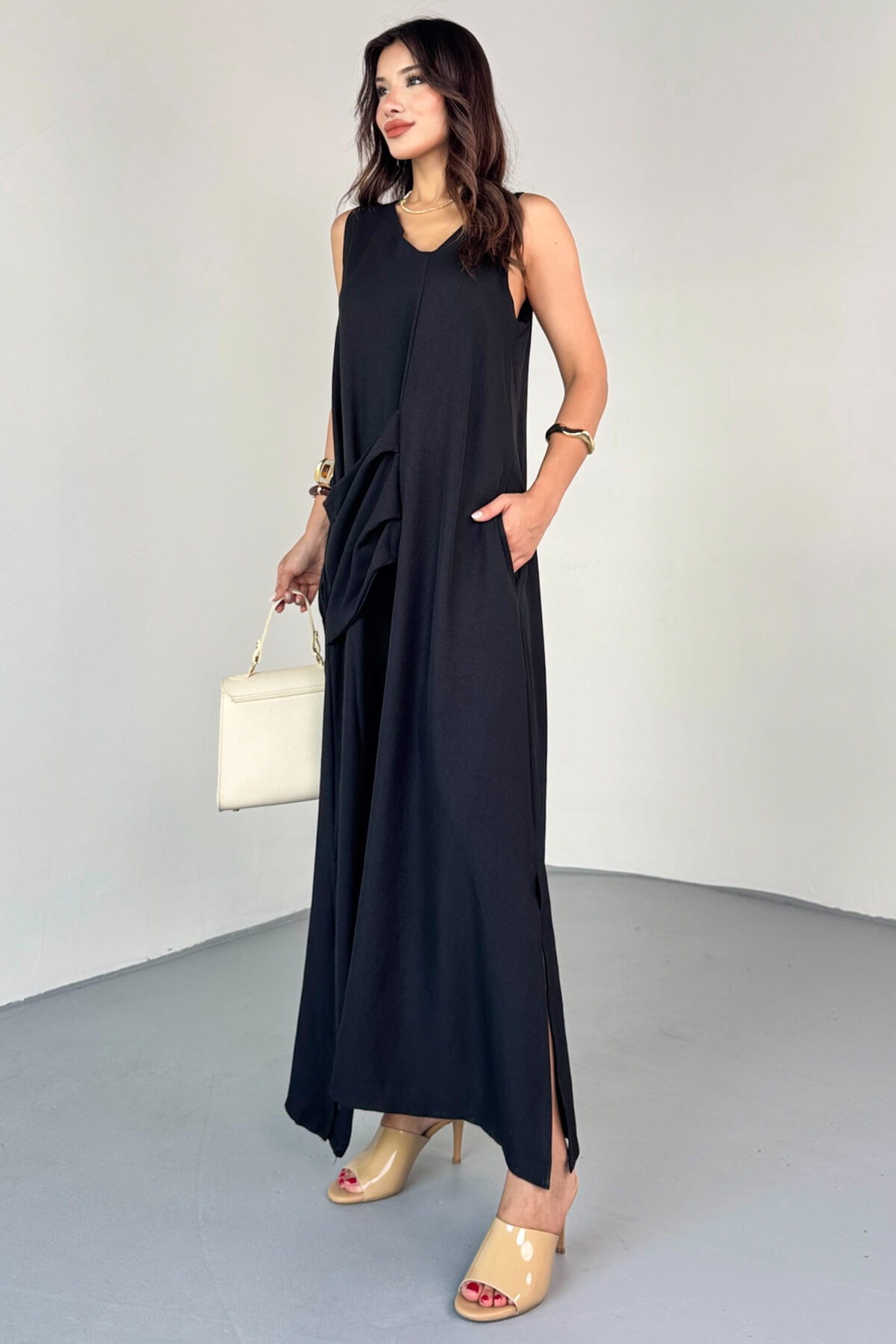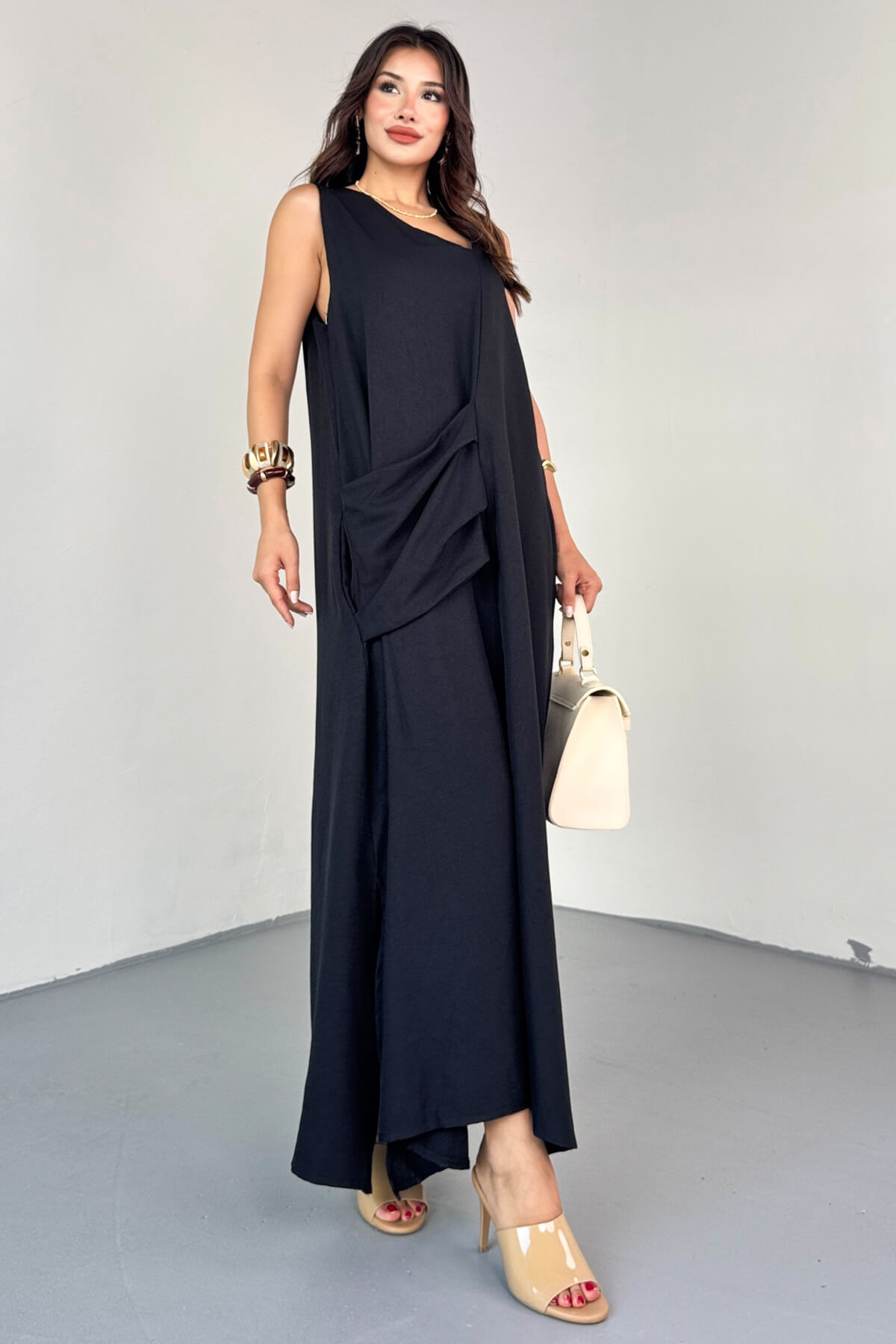 ELB-3078 Siyah Asimetrik Yaka Yan Yırtmaçlı Cepli Uzun Yazlık Elbise