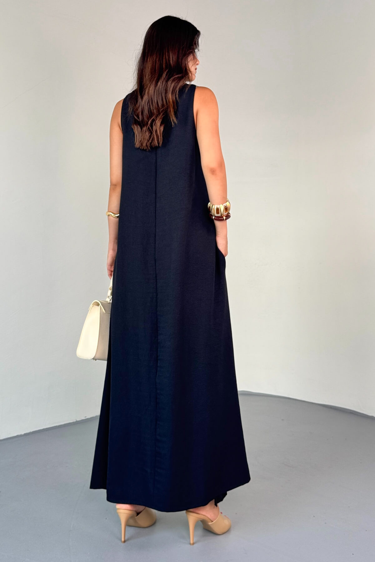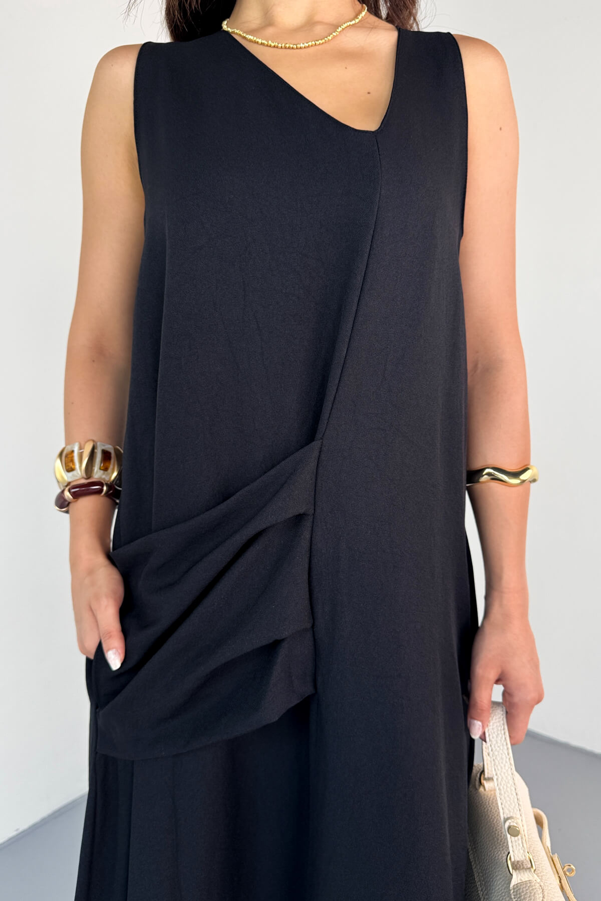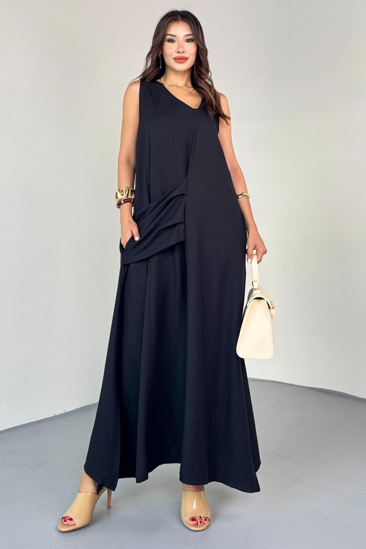 ELB-3078 Siyah Asimetrik Yaka Yan Yırtmaçlı Cepli Uzun Yazlık Elbise