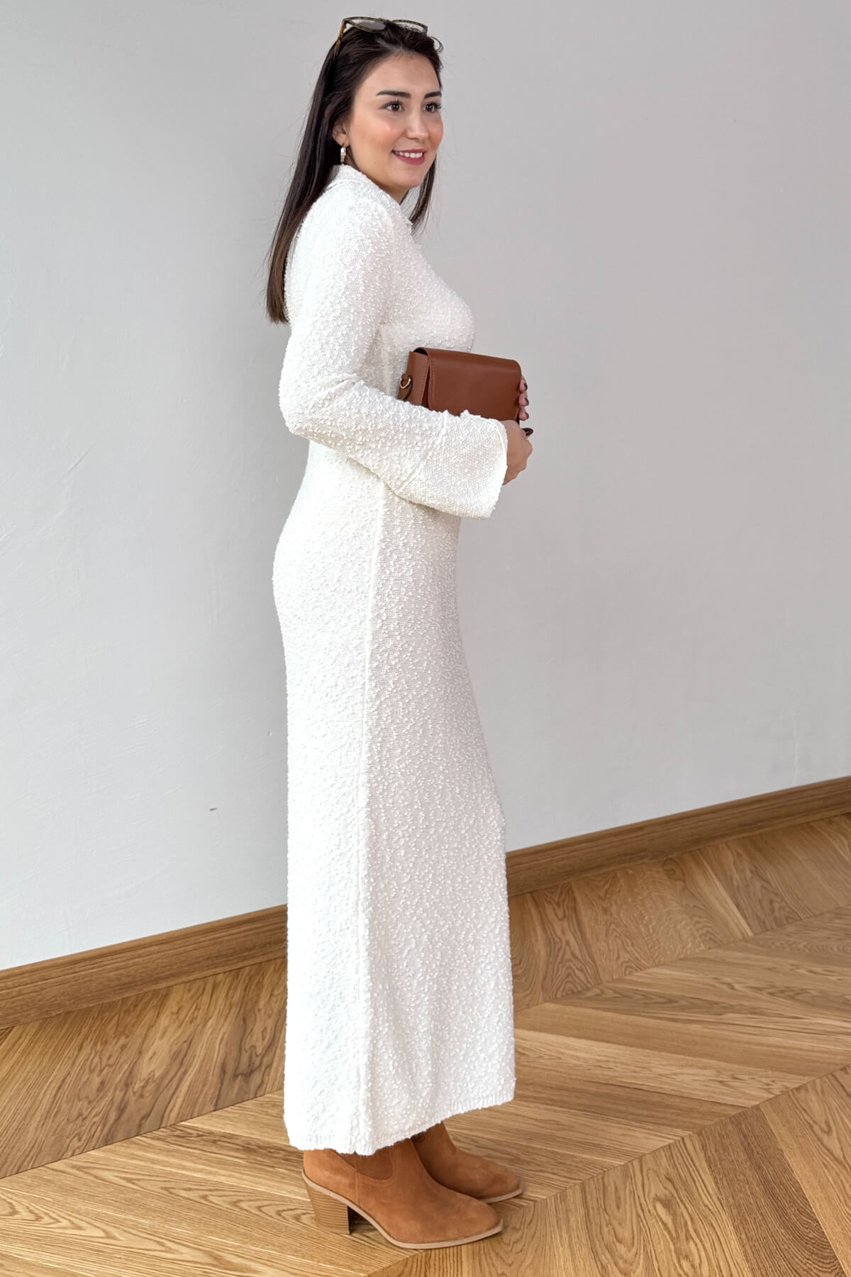 ELB-3861 Ekru Polo Yaka Dokulu Uzun Triko Elbise