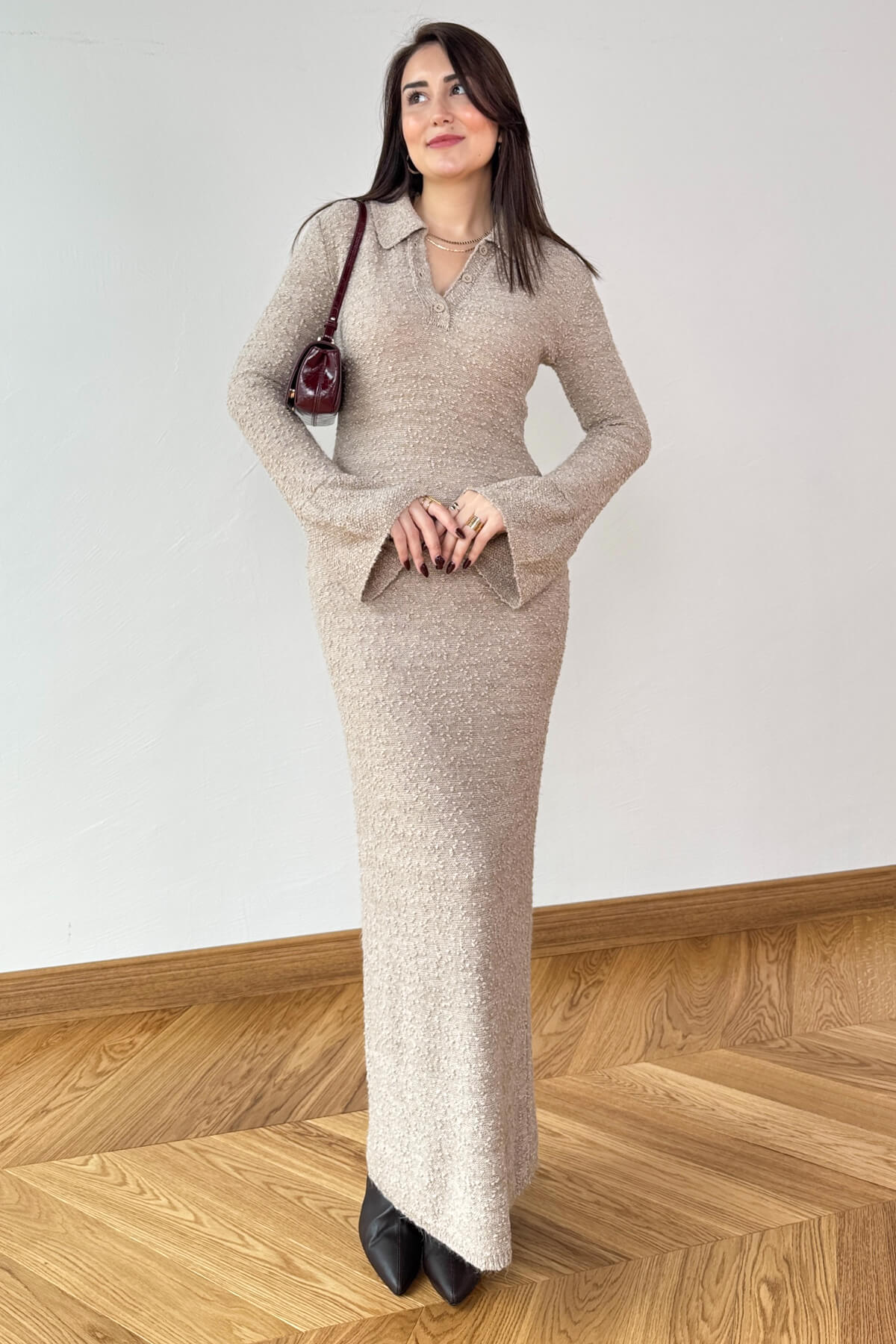 ELB-3861 Taş Rengi Polo Yaka Dokulu Uzun Triko Elbise