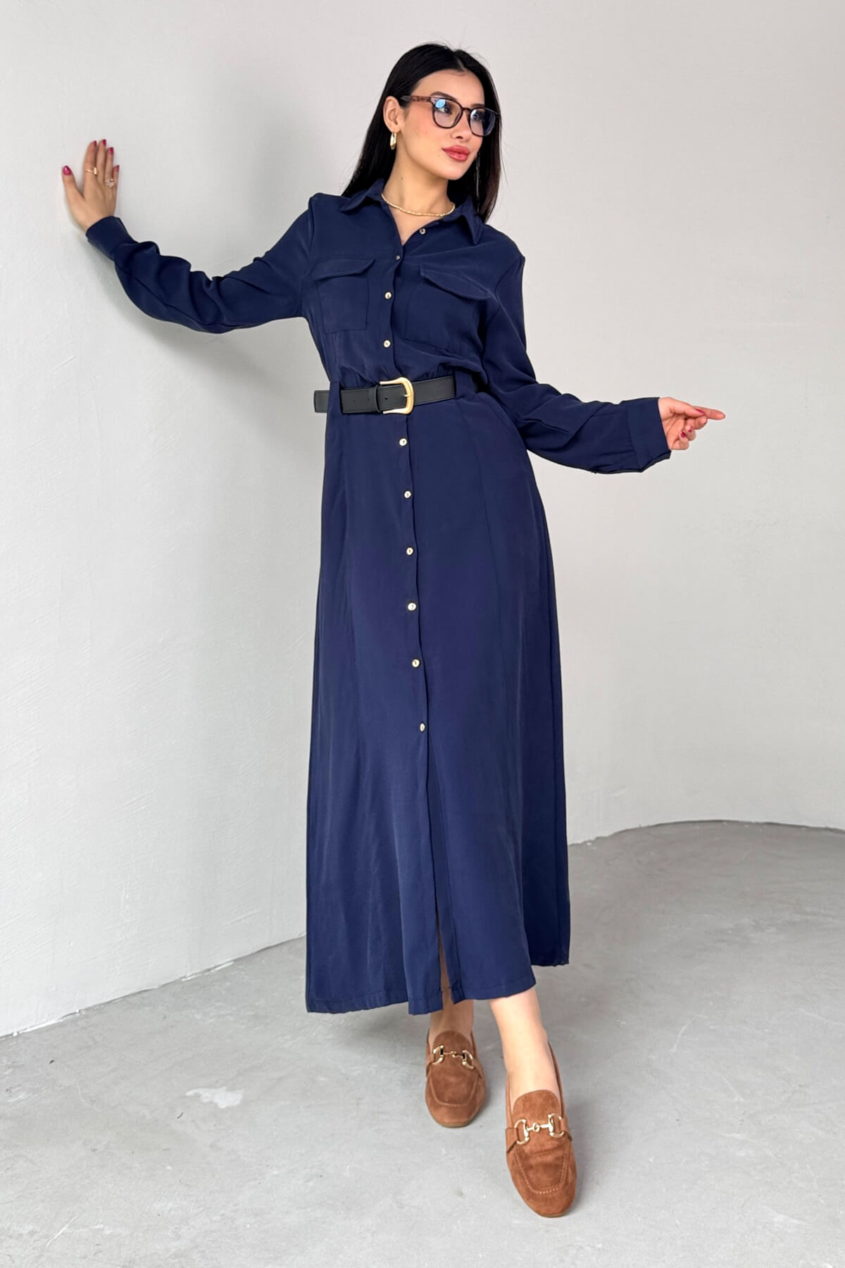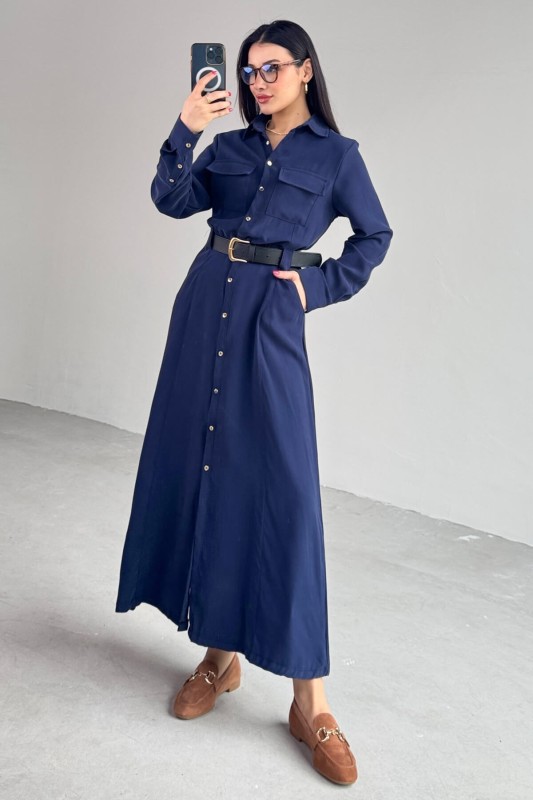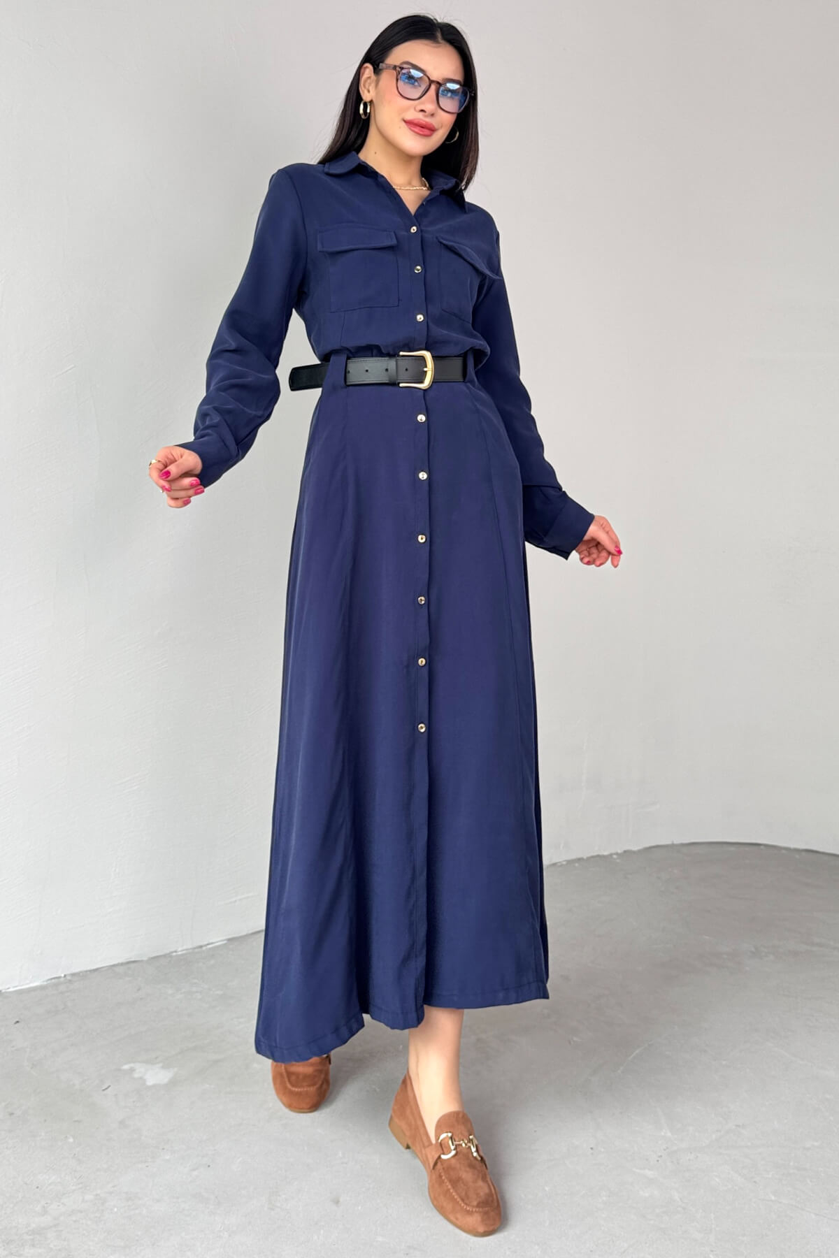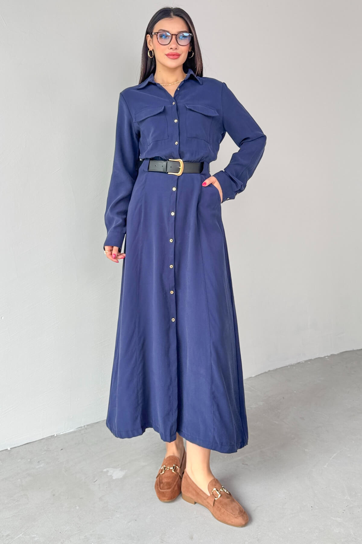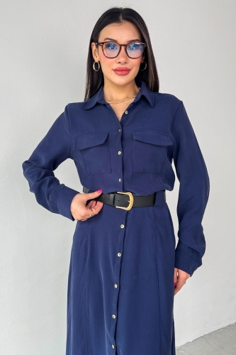 ELB-8189 Lacivert Kemerli Cep Detaylı Düğmeli Elbise