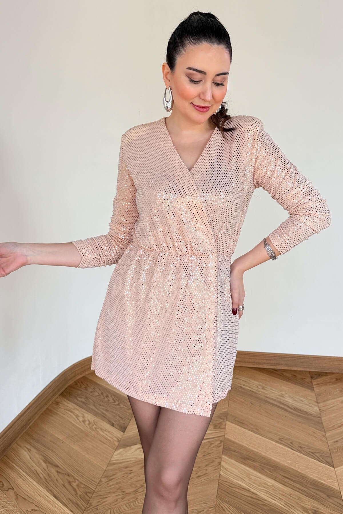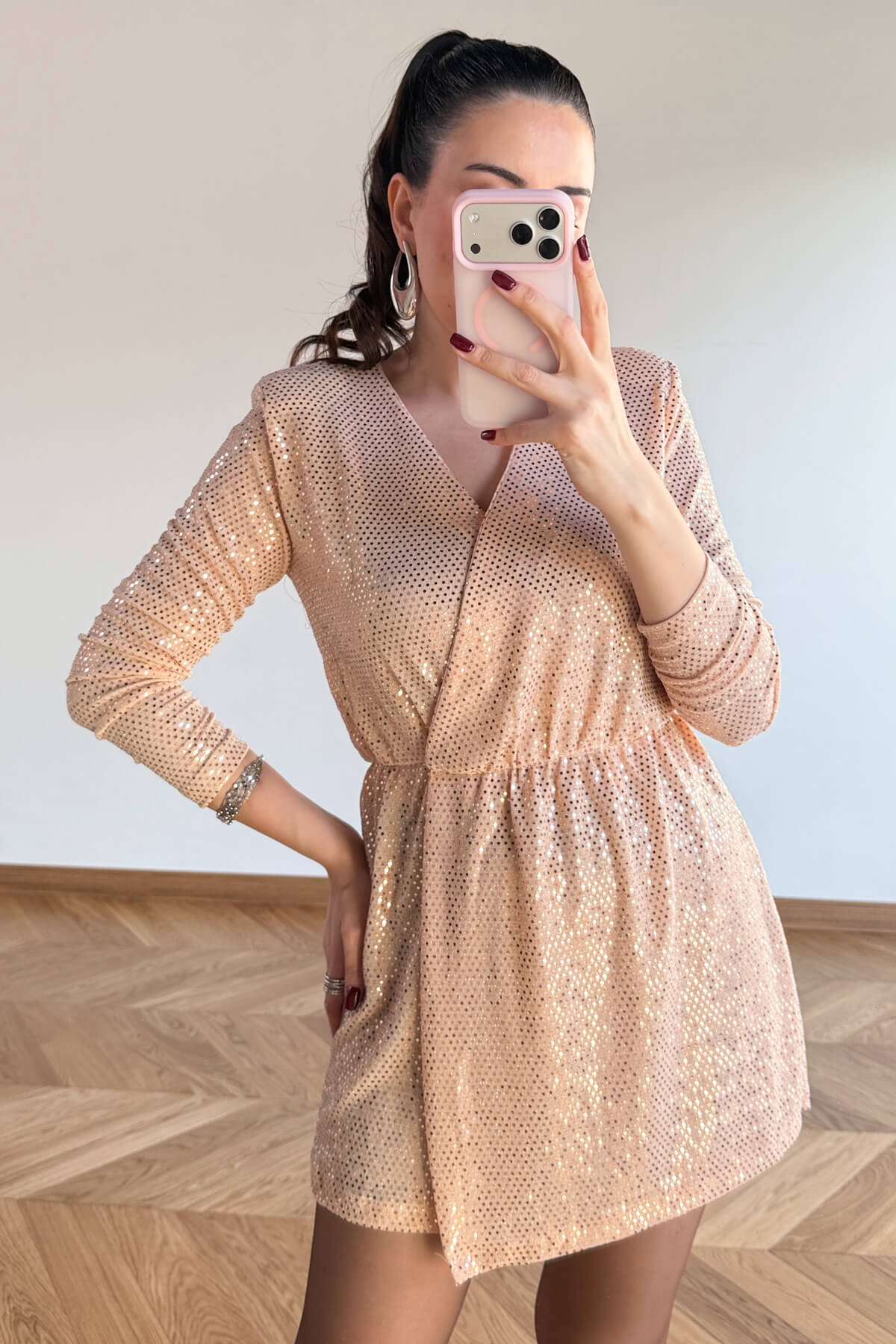 Özel davetlerin ve gece şıklığının vazgeçilmezi olacak bu tasarım, tüm dikkatleri üzerinize çekmeye hazır. Işıltılı sim süslemeleriyle hareket kazanan kumaşı, her adımda parıldamanızı sağlarken; modern kruvaze yaka kesimi feminen ve zarif bir duruş sergiliyor. Belden lastikli rahat formu, vücut hatlarını nazikçe sararak konforlu bir kullanım sunarken, kollarındaki büzgü detayları tasarıma sofistike bir hava katıyor. 78 cm mini boyu ile bacak boyunuzu uzun gösteren bu parça, ışıltısı ve kusursuz kalıbıyla gardırobunuzun yıldızı olmaya aday.