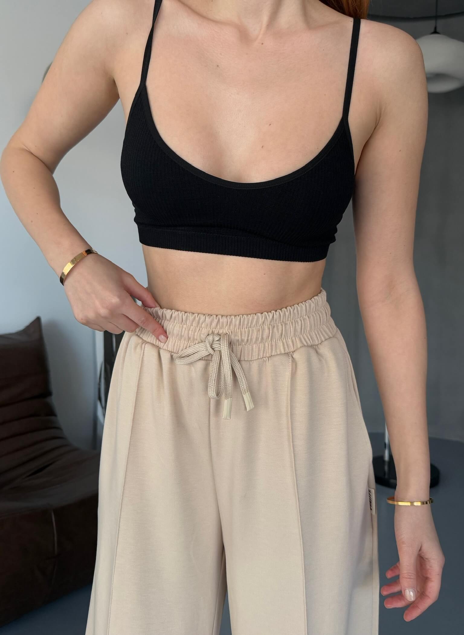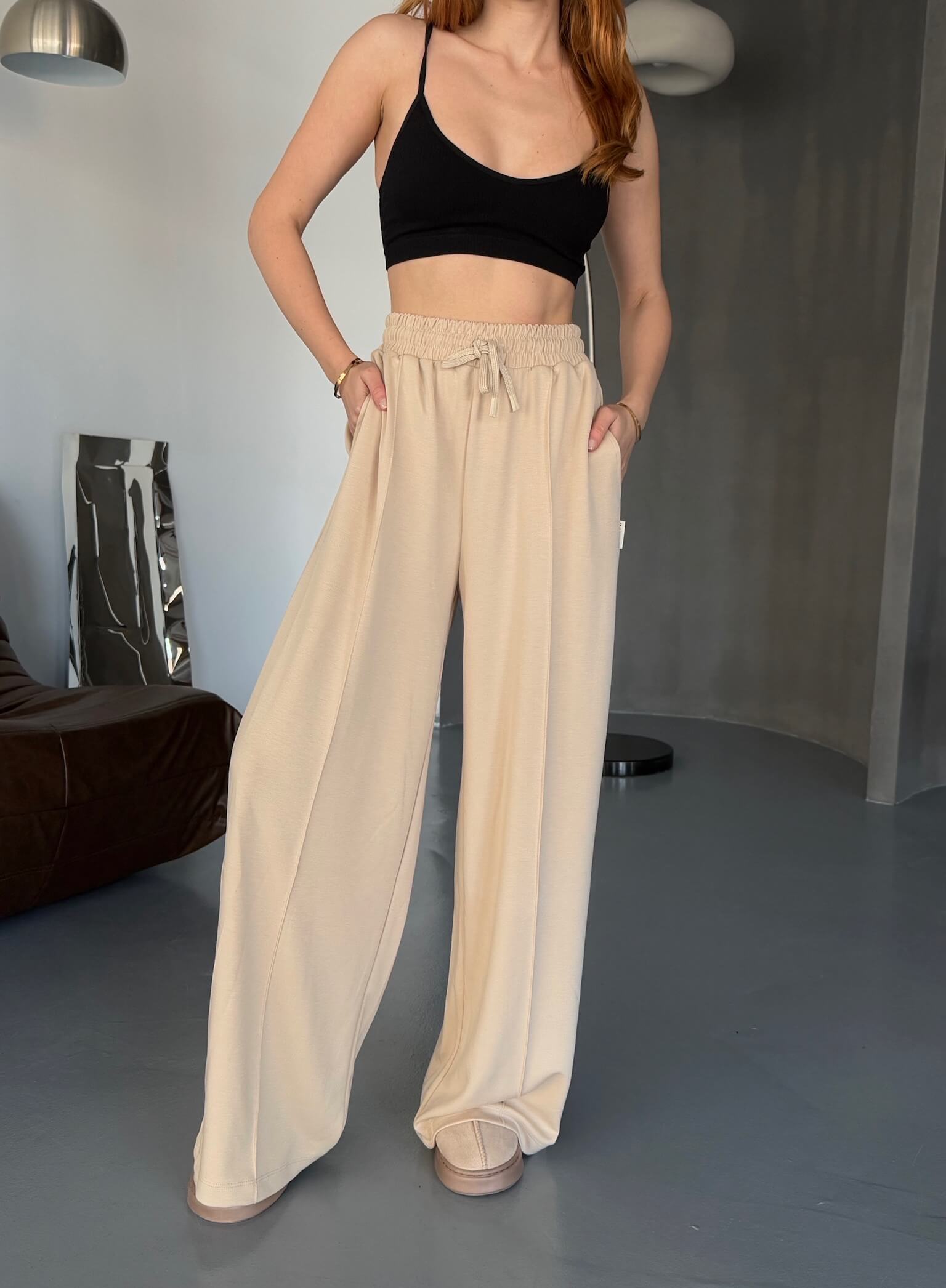EŞF0017 Bej Rengi Modal Kumaş Bel Lastikli Salaş Çimalı Eşofman Altı