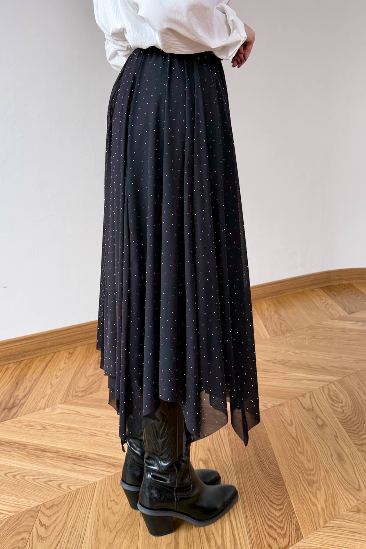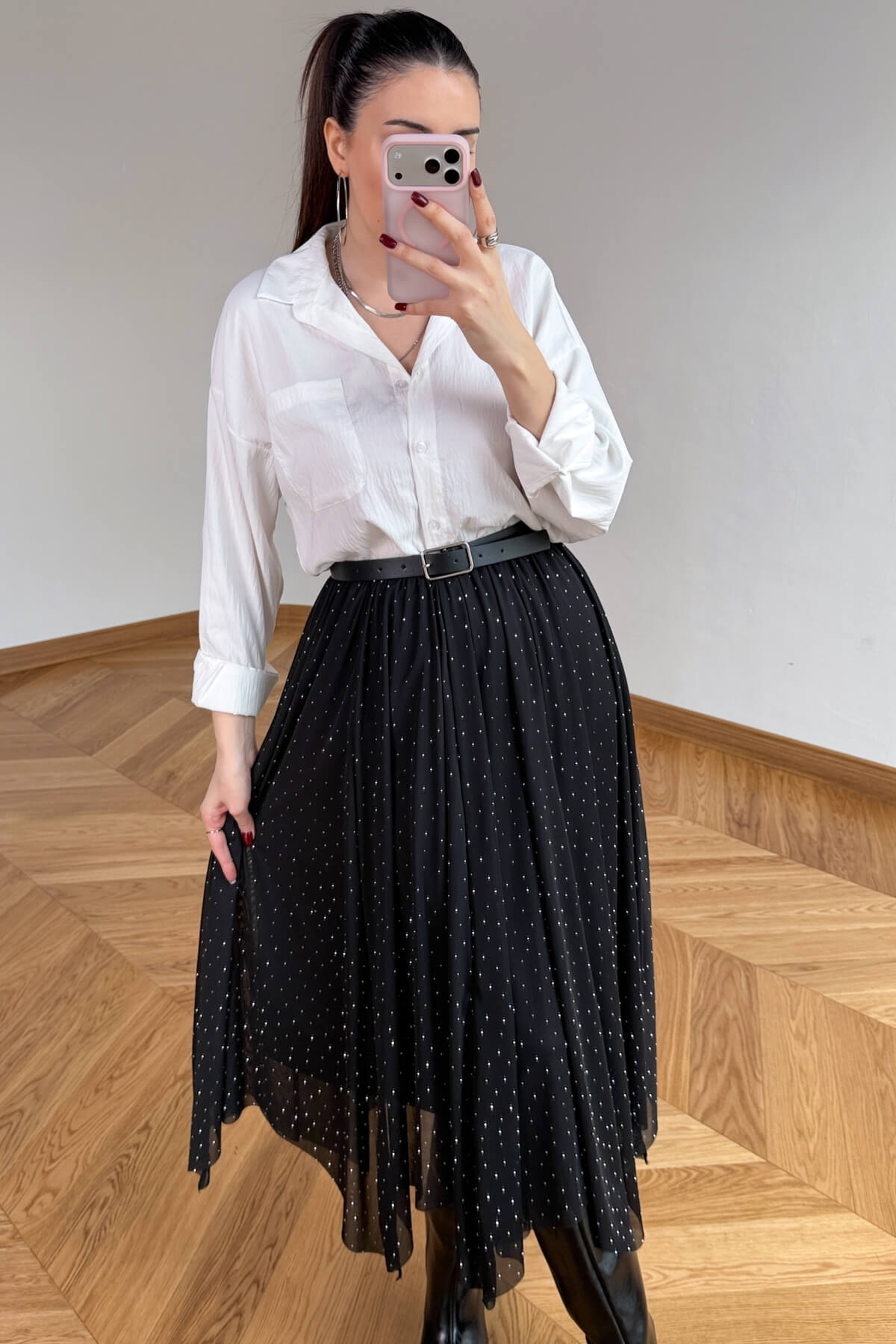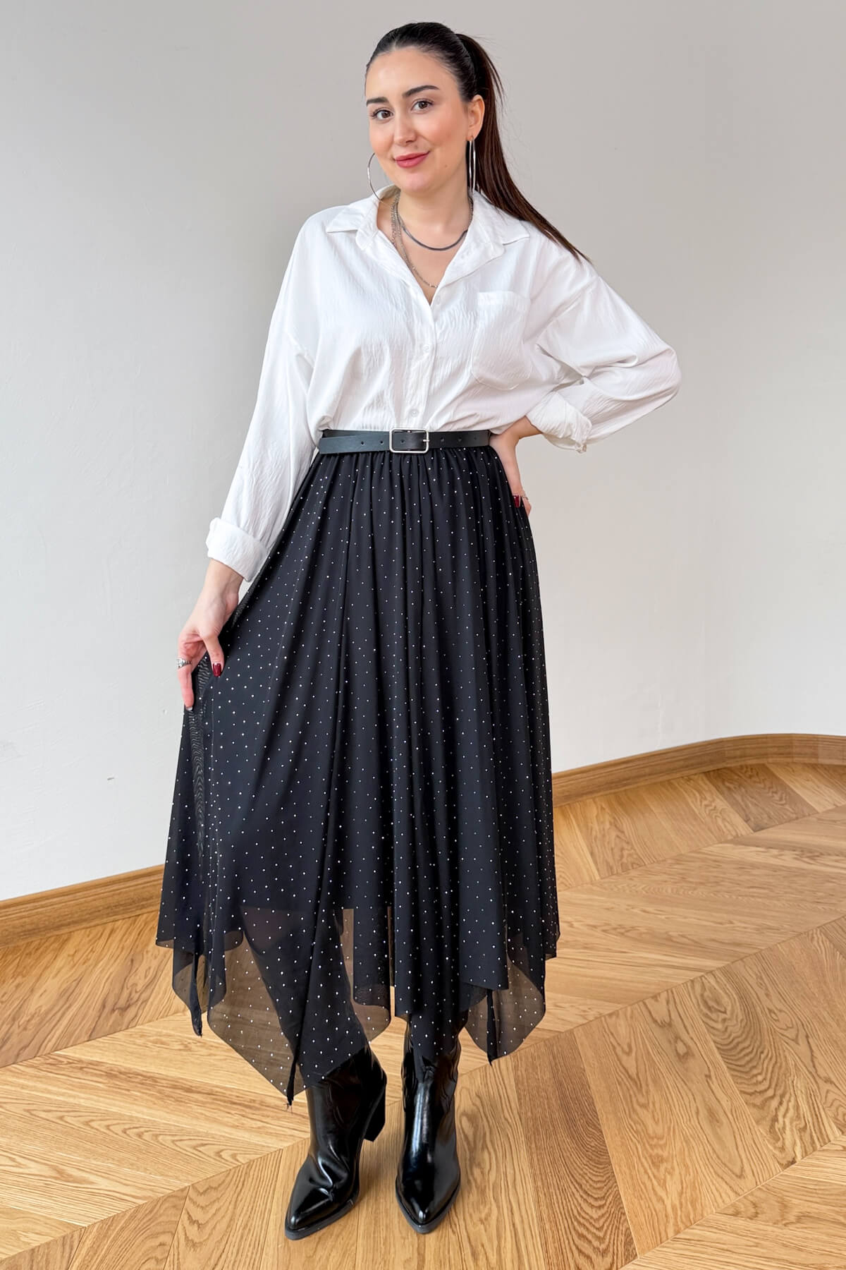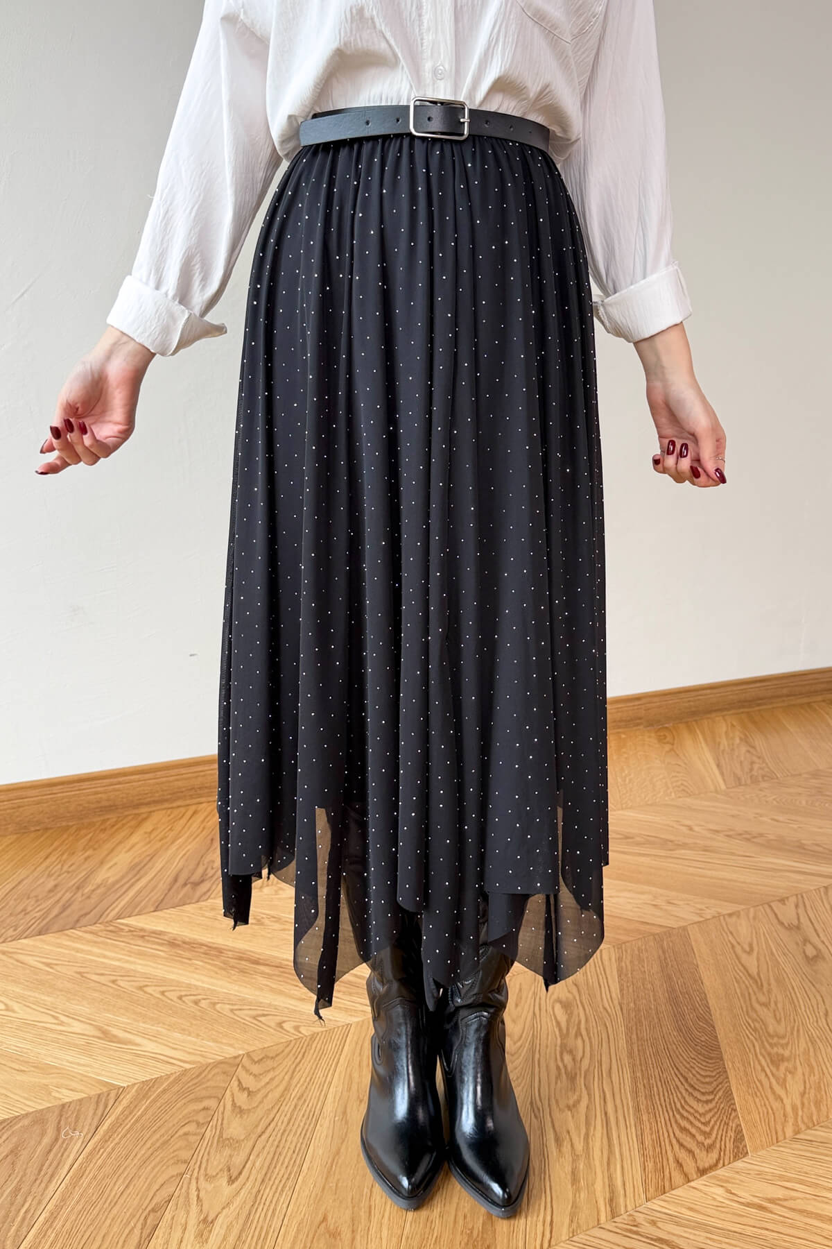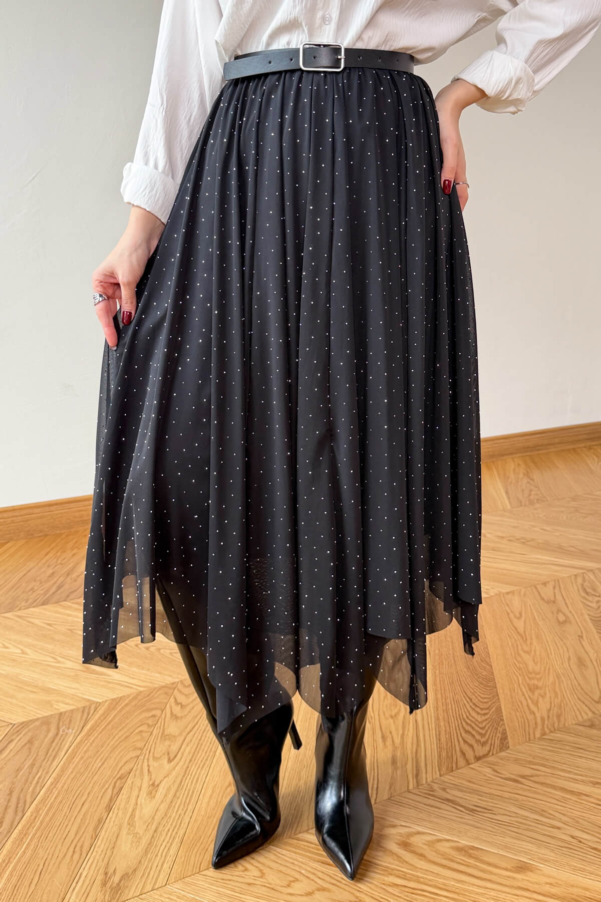 Işıltılı taş detaylarının siyahın asaletiyle buluştuğu bu tasarım, gardırobunuza sofistike bir parıltı katıyor. 85 cm uzunluğundaki asimetrik kesimi ve uçuşan tül dokusu, her adımda büyüleyici ve akışkan bir silüet vadediyor. Konforlu iç astarı ve pratik lastikli bel yapısı sayesinde hem şıklığı hem de rahatlığı aynı anda sunan bu parça, modern duruşuyla tüm bakışları üzerinize çekecek.
