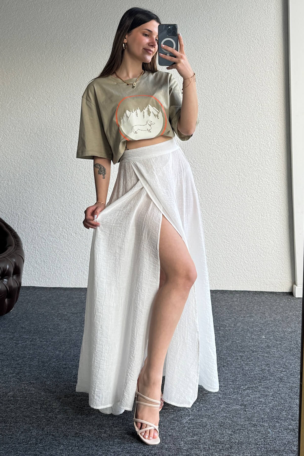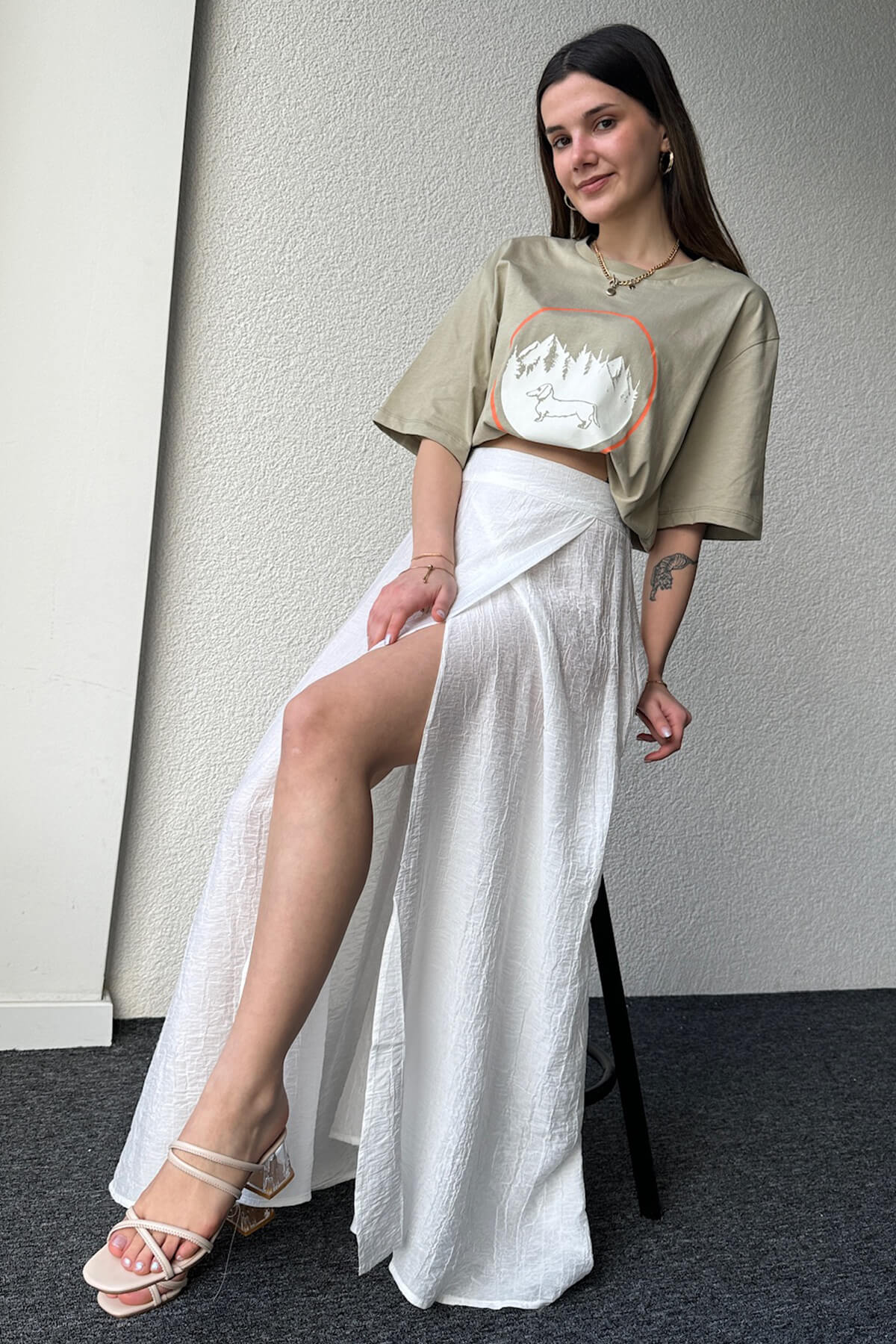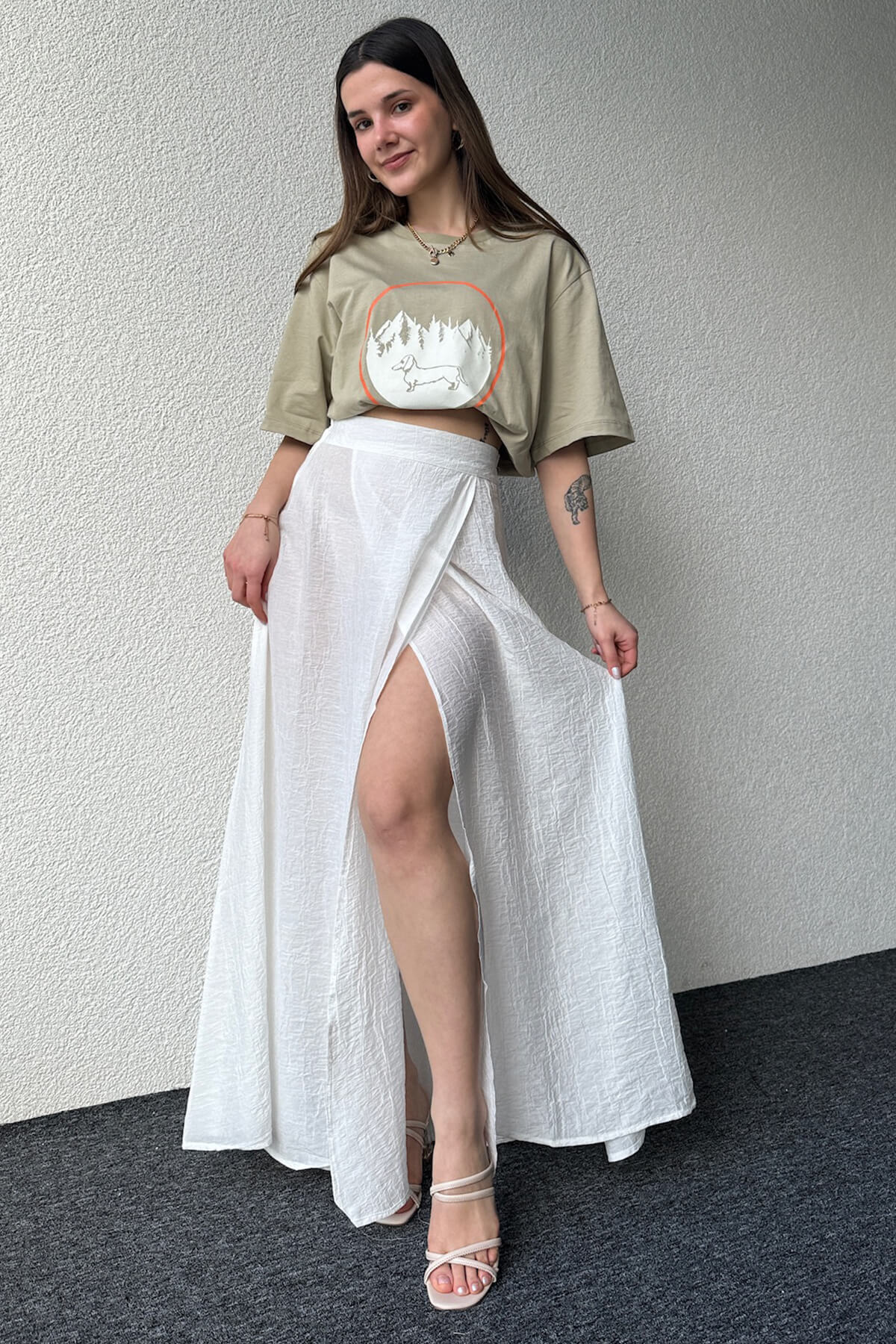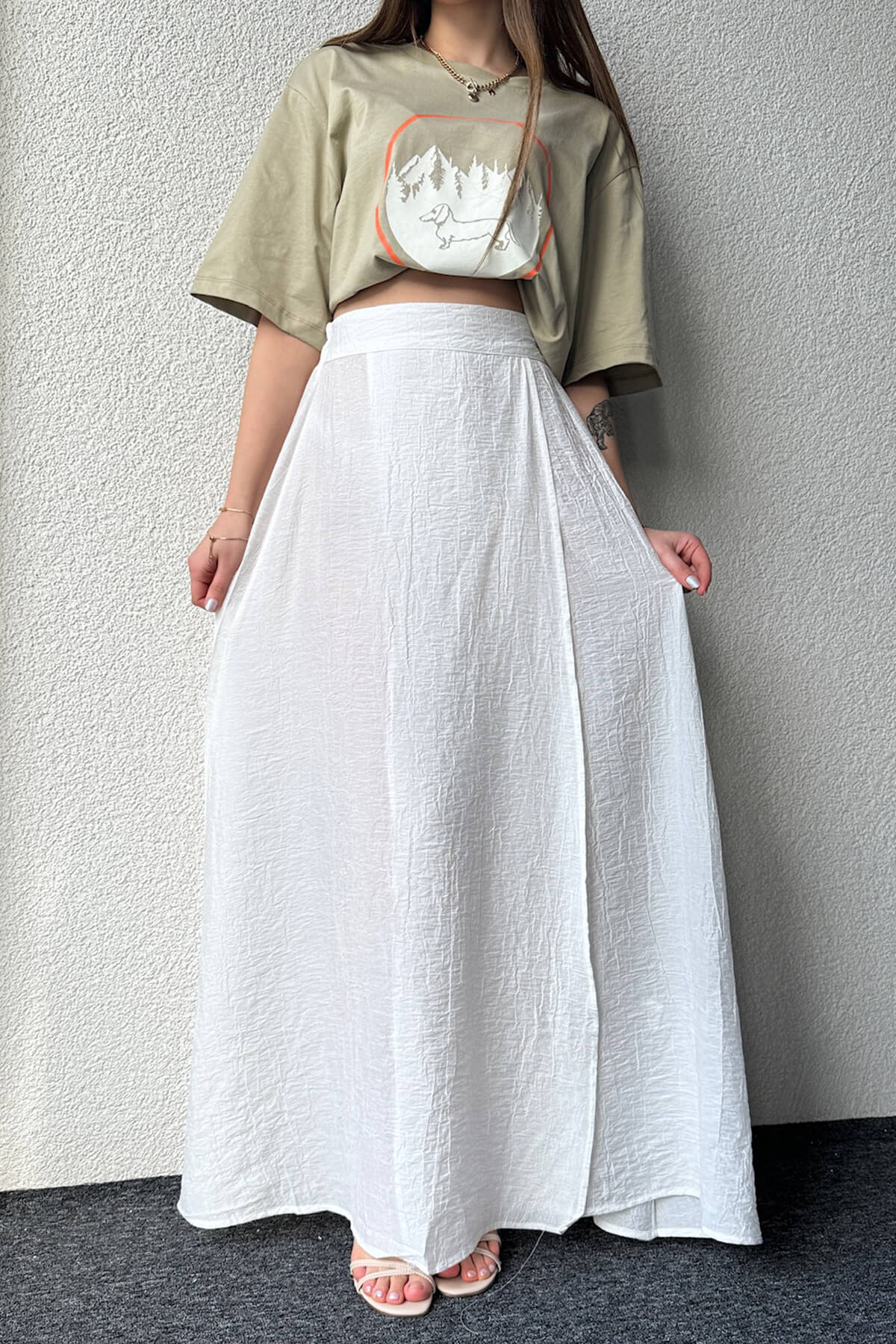 ETK-02321 Beyaz Çan Model Yırtmaçlı Bel Lastikli Salaş Uzun Etek