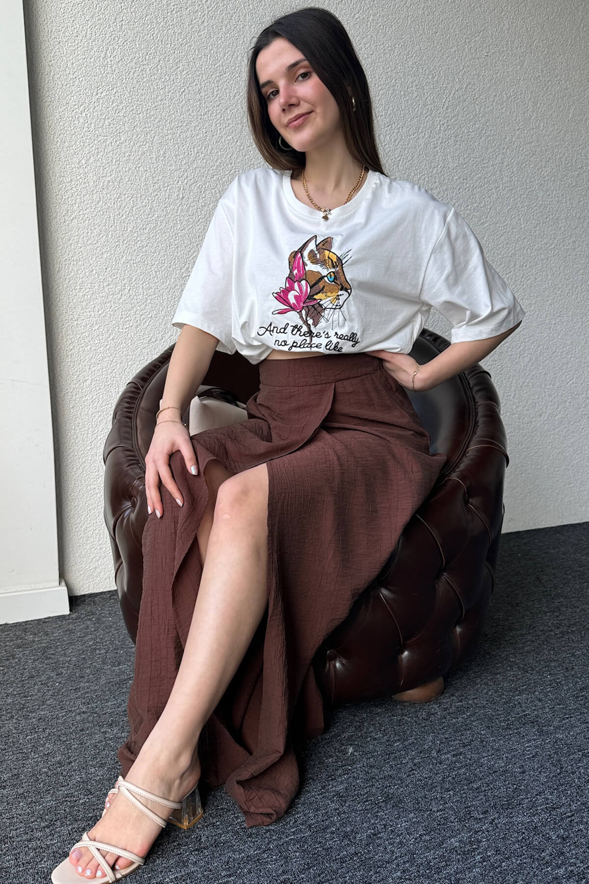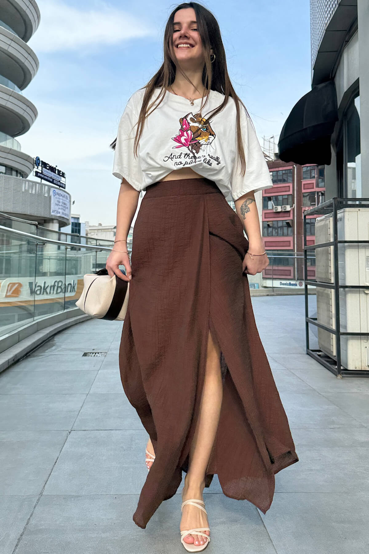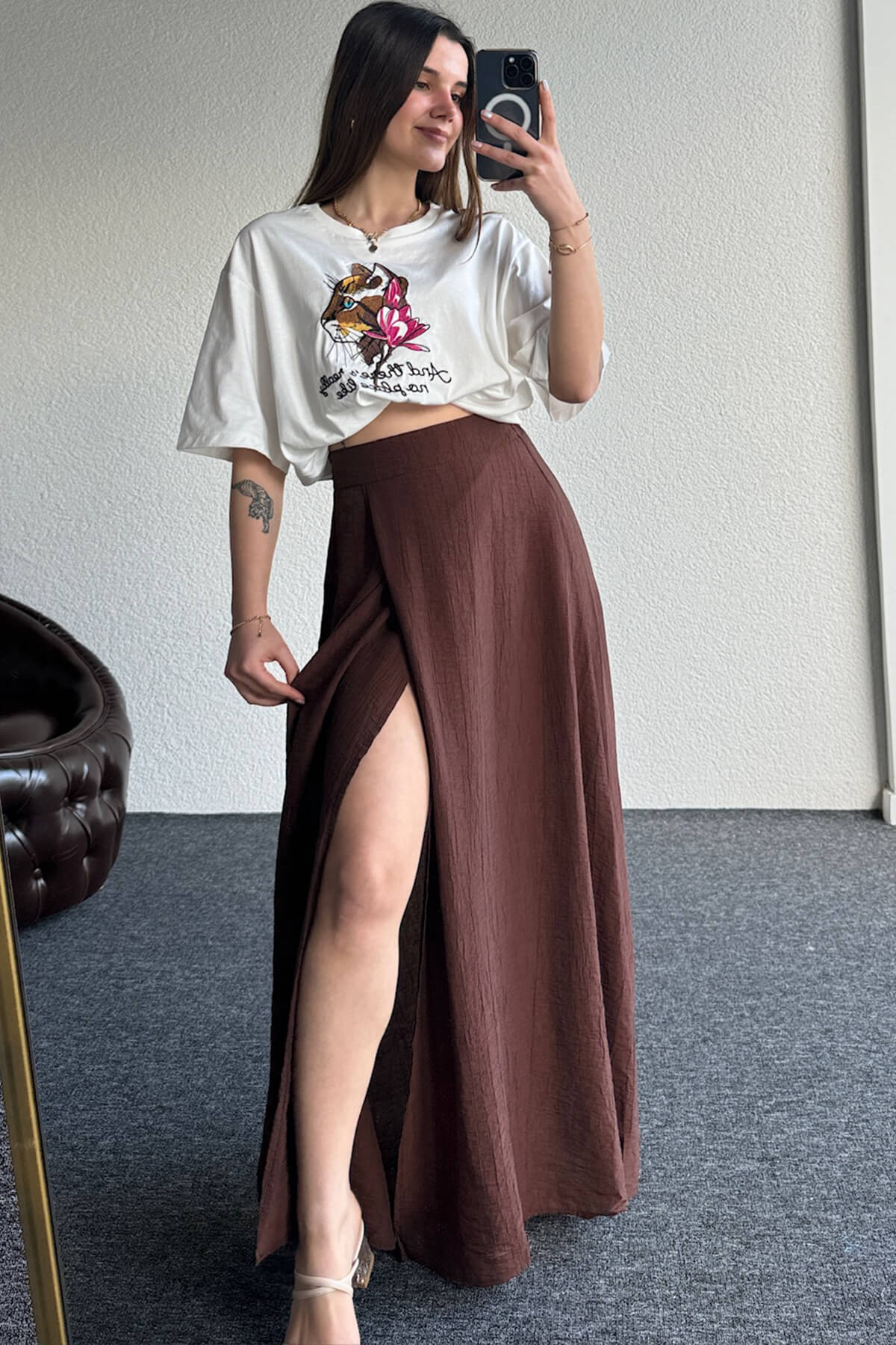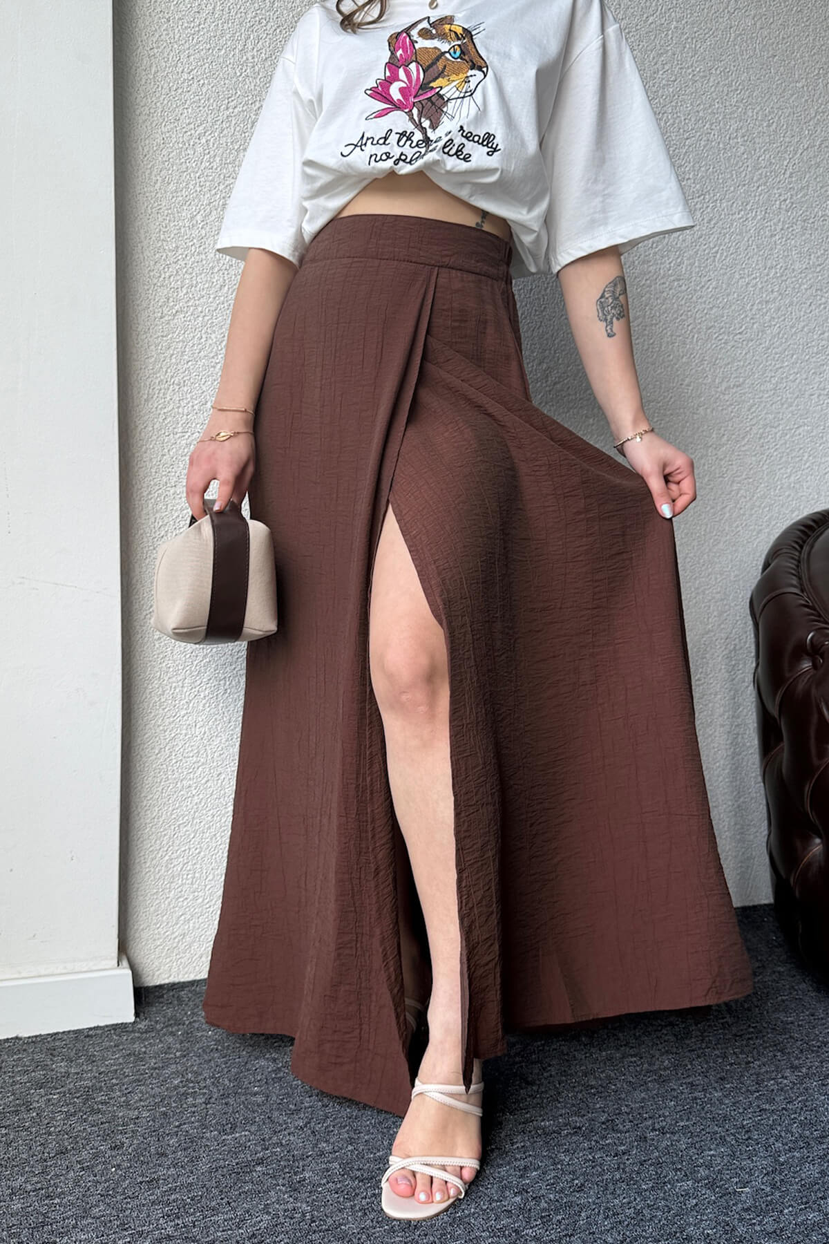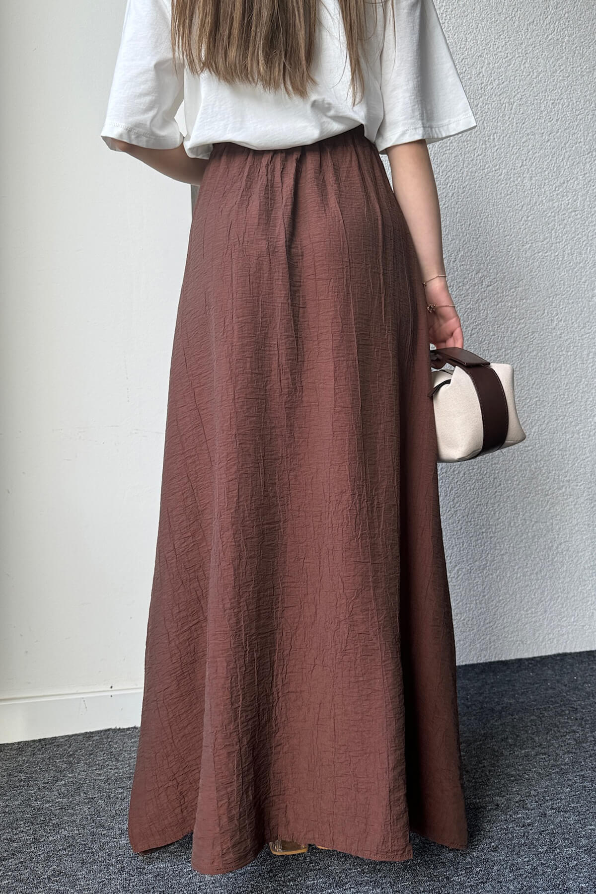 ETK-02321 Kahverengi Çan Model Yırtmaçlı Bel Lastikli Salaş Uzun Etek