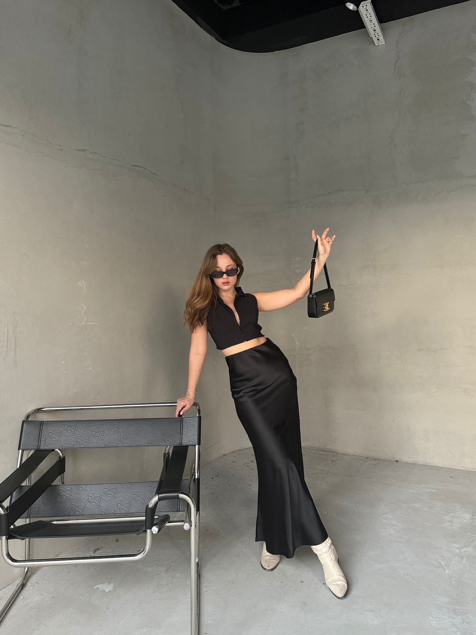 ETK-02326 Siyah Bel Lastikli Midi Boy Saten Kumaş Etek