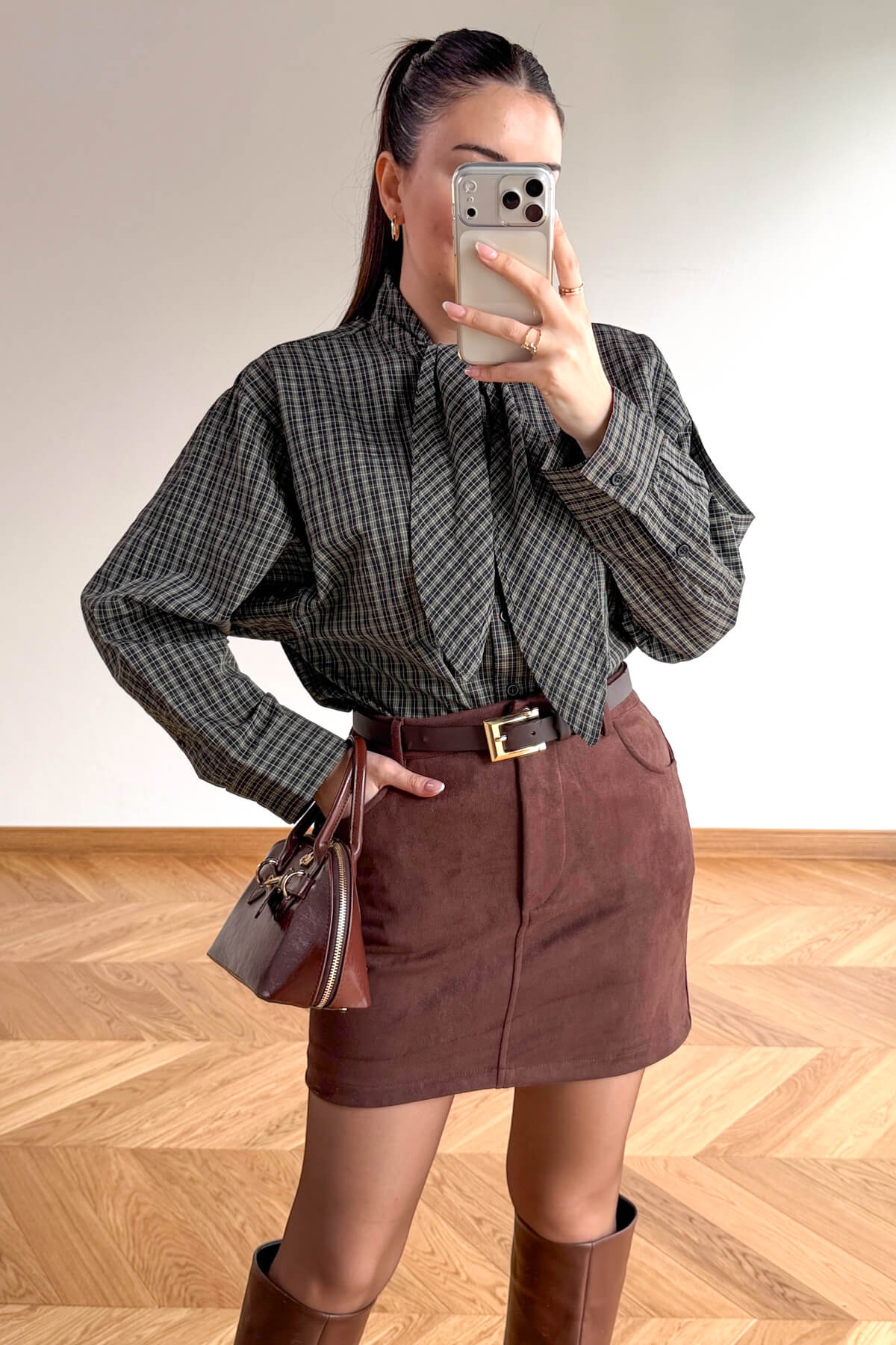 Sezonun en sevilen dokusu nubuk, modern kesimiyle gardırobunuza sıcak bir dokunuş yapıyor. Yumuşak dokusu ve zengin taba rengiyle dikkat çeken bu mini etek, ön kısmındaki fonksiyonel cep detayları ve kemer köprüleri ile hem şık hem de sportif bir duruş sergiliyor. 40 cm'lik ideal mini boyu sayesinde bacak boyunuzu daha uzun gösterirken, nubuk kumaşın tok duruşu vücut hatlarınızı kusursuz bir şekilde sarar. İster opak çoraplarla kış kombinlerinde, ister geçiş mevsimlerinde stilettolarla değerlendirebileceğiniz zamansız bir parça.
