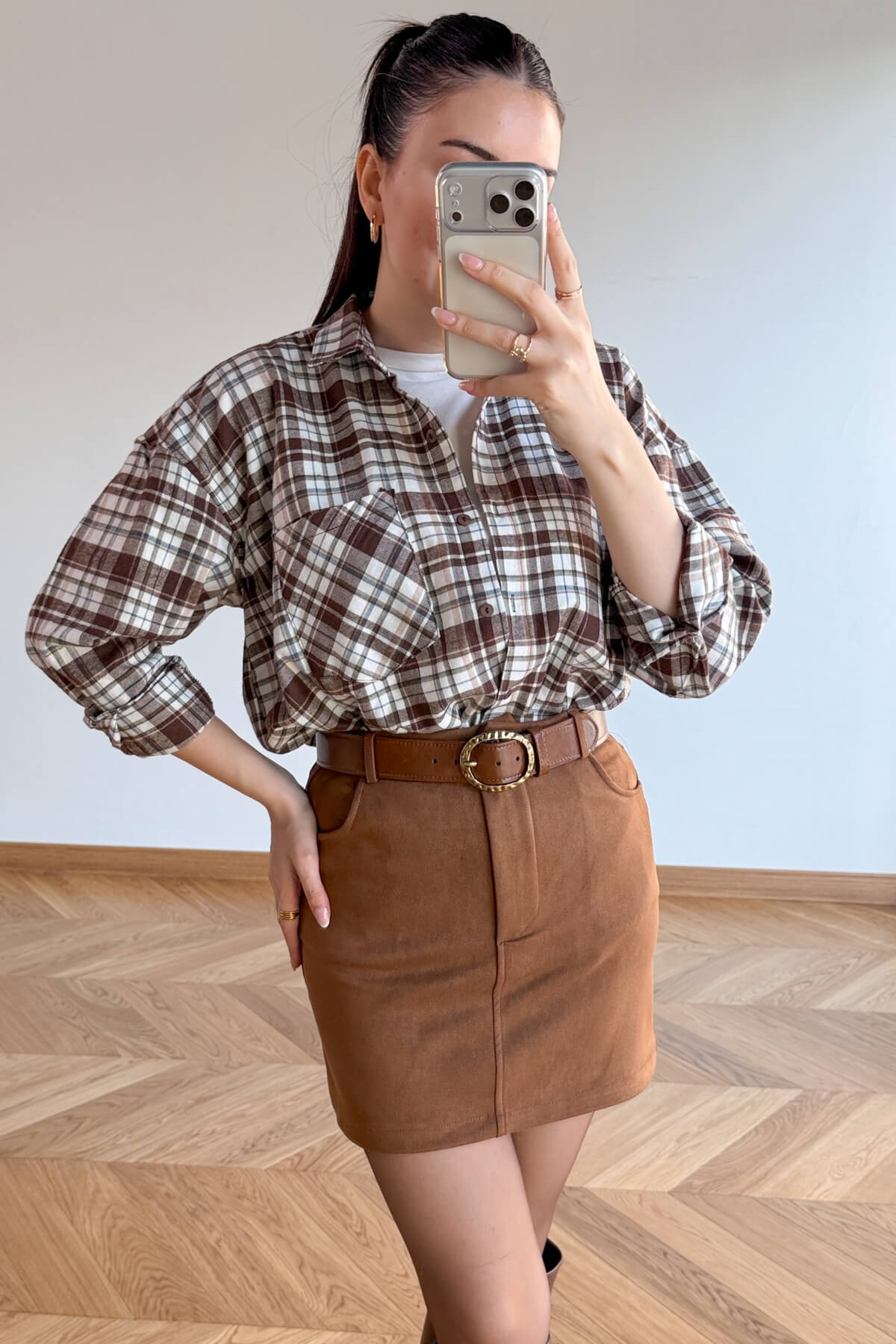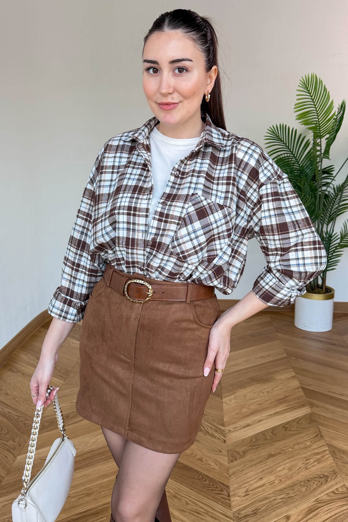 Sezonun en sevilen dokusu nubuk, modern kesimiyle gardırobunuza sıcak bir dokunuş yapıyor. Yumuşak dokusu ve zengin taba rengiyle dikkat çeken bu mini etek, ön kısmındaki fonksiyonel cep detayları ve kemer köprüleri ile hem şık hem de sportif bir duruş sergiliyor. 40 cm'lik ideal mini boyu sayesinde bacak boyunuzu daha uzun gösterirken, nubuk kumaşın tok duruşu vücut hatlarınızı kusursuz bir şekilde sarar. İster opak çoraplarla kış kombinlerinde, ister geçiş mevsimlerinde stilettolarla değerlendirebileceğiniz zamansız bir parça.