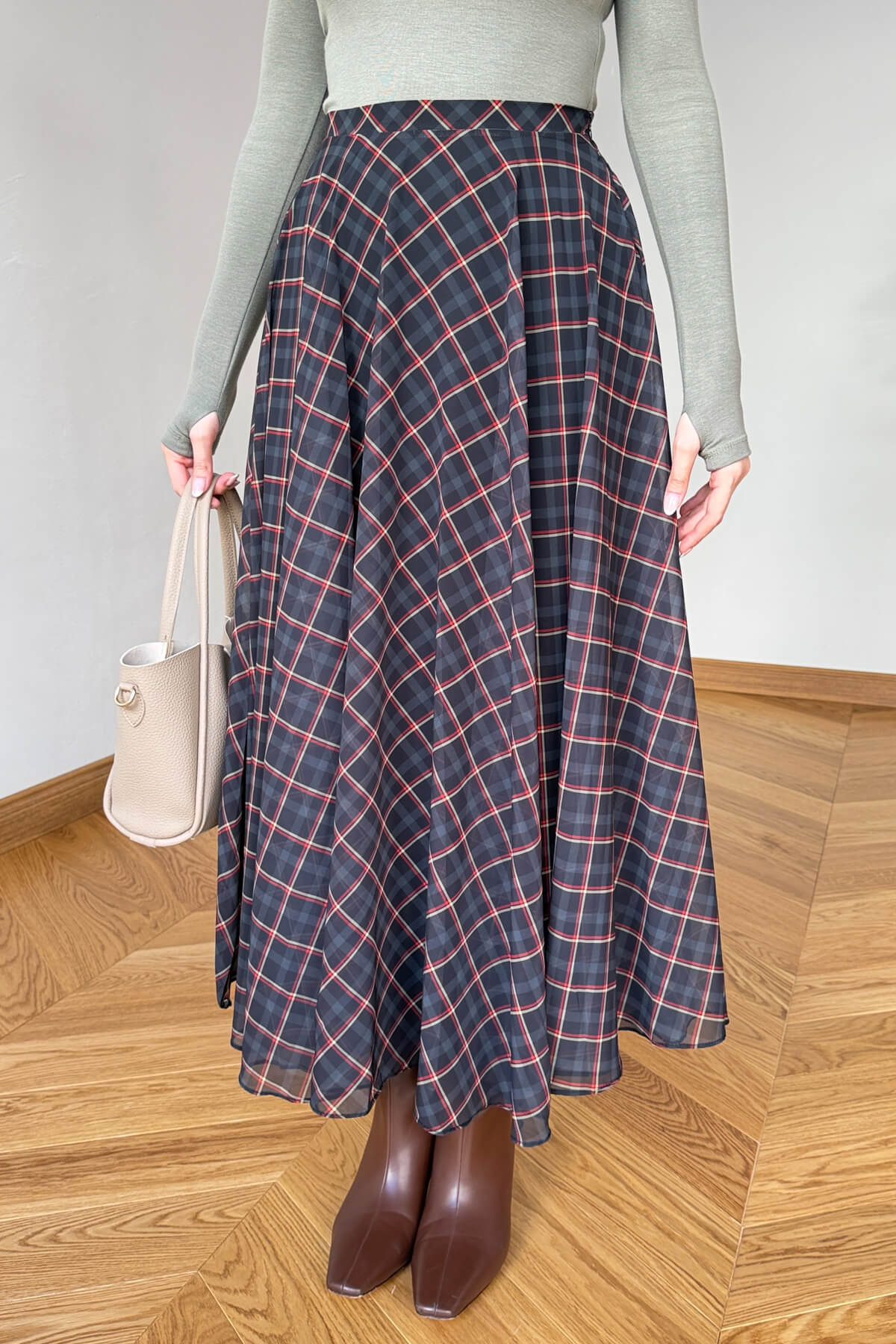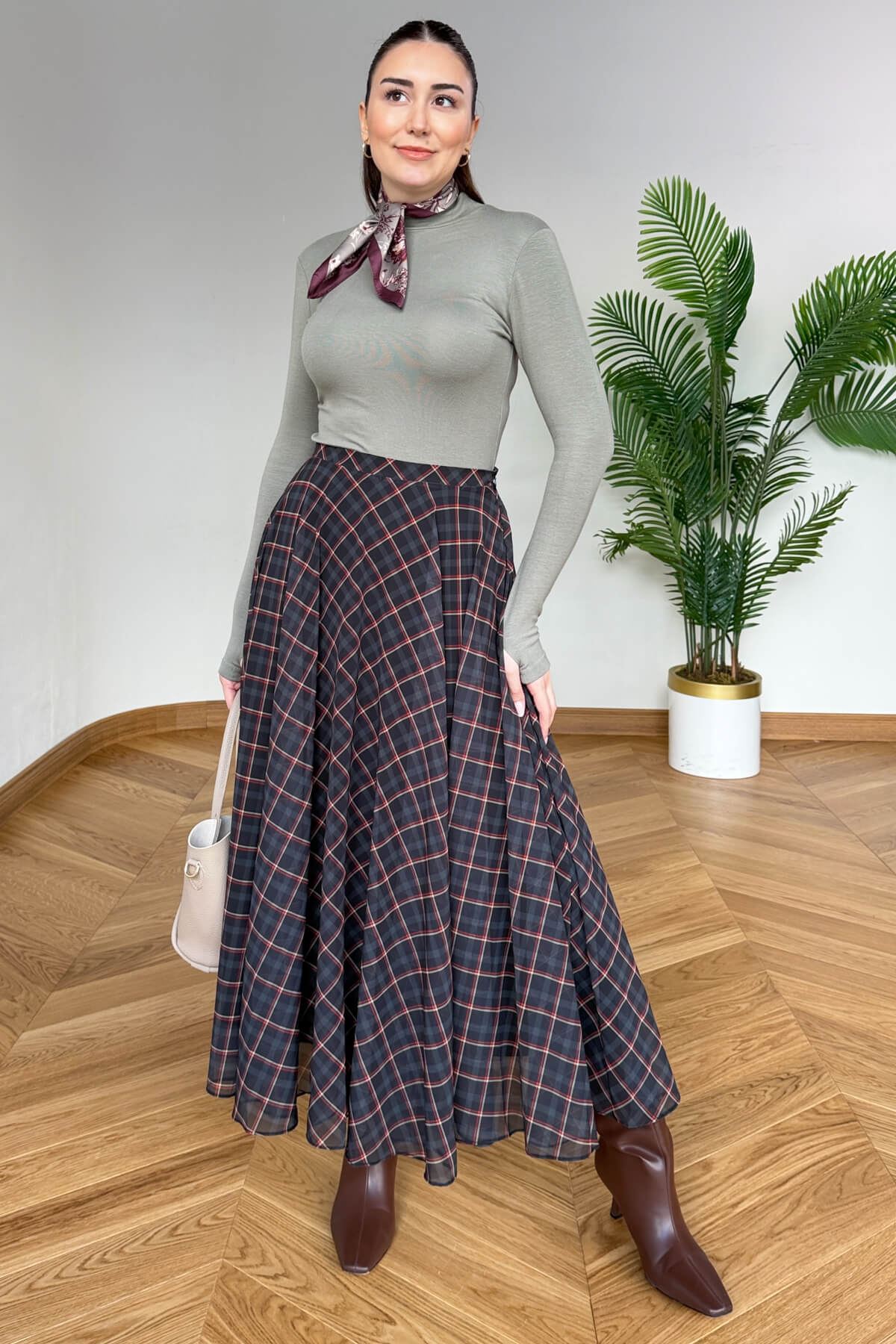 Şifon kumaşın hafifliği ile ekose desenin klasik şıklığını buluşturan bu tasarım, hareketli yapısıyla dikkat çekiyor. 92 cm uzunluğundaki maxi boyu ve akışkan kesimi, her adımda zarif bir görünüm sunar. İç göstermeyen tam boy astarı konforlu bir kullanım sağlarken, yandan fermuarlı yapısı belinize tam oturur. Mevsim geçişlerinde ve kış aylarında stilinize dinamik bir hava katacak özel bir parça.