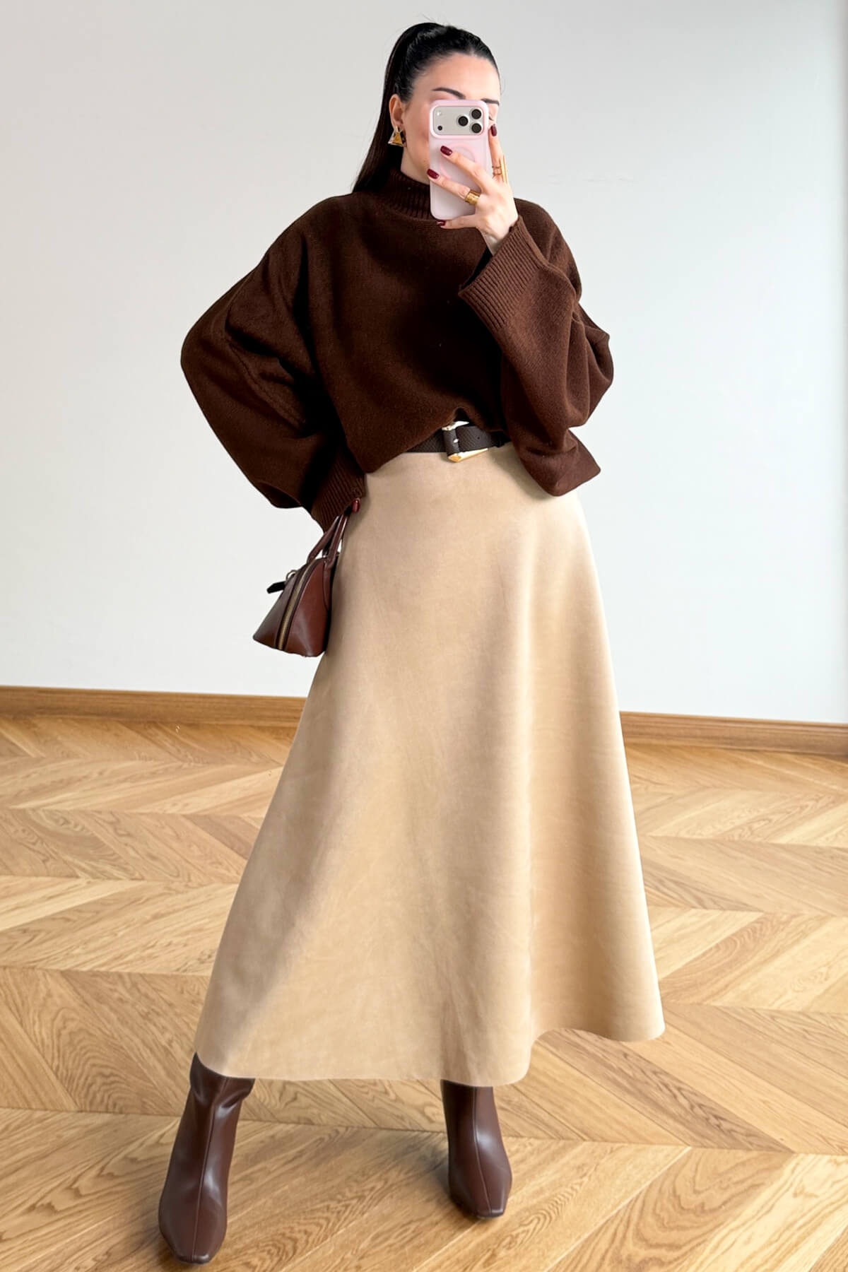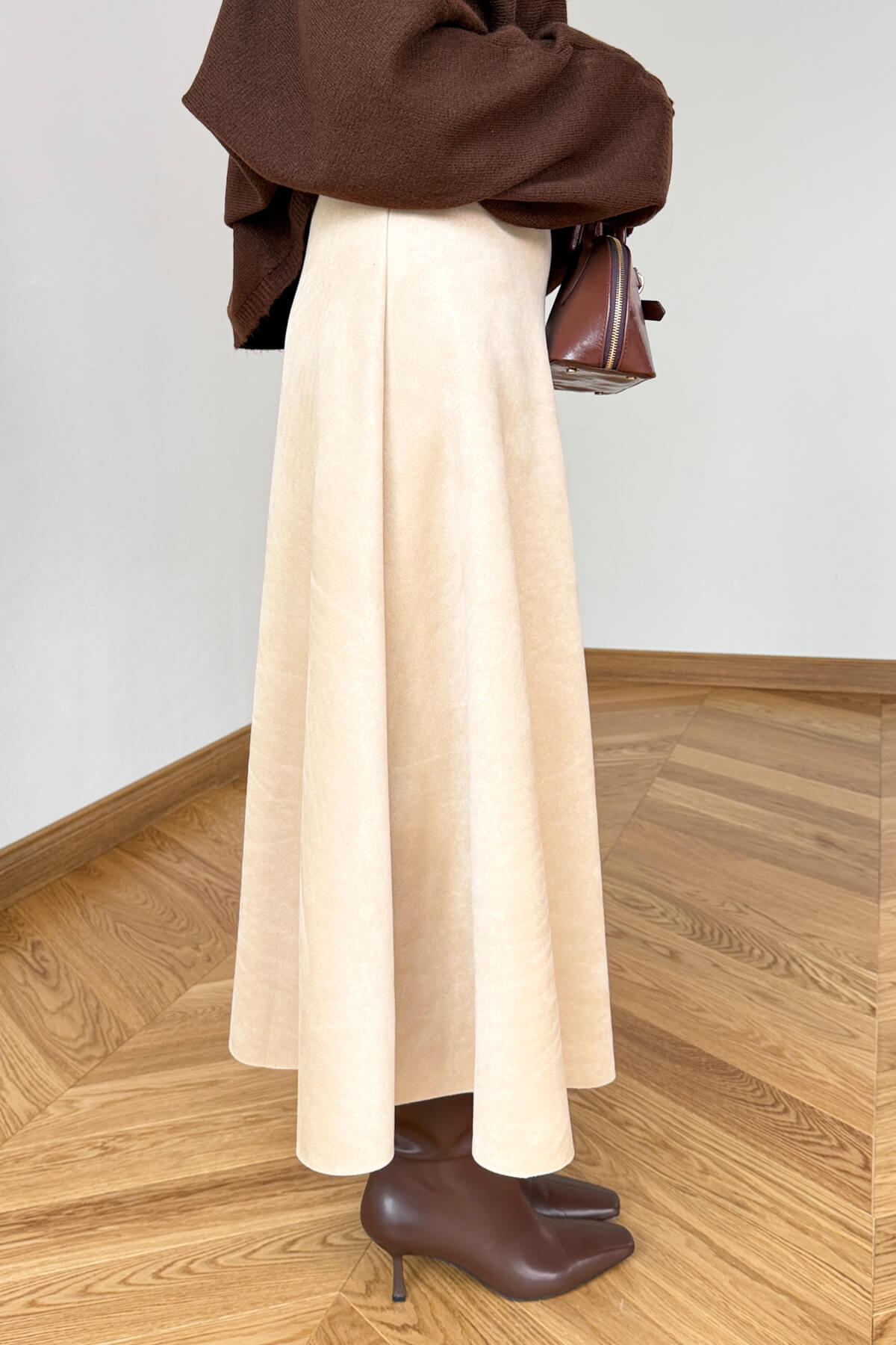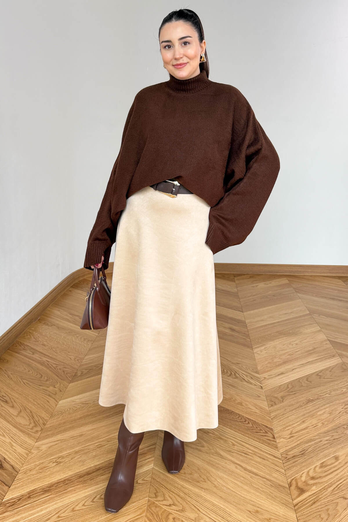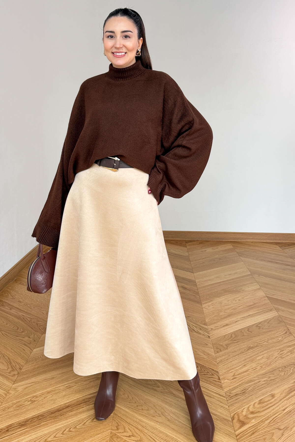 Açıklama: Süet dokunun zarafetini ve yumuşak tuşesini gardırobunuza taşıyan bu tasarım, zamansız şıklığın anahtarı. 95 cm uzunluğundaki ideal boyu ve belden aşağıya genişleyen çan formuyla her bedende kusursuz ve zarif bir duruş sergiler. Etek ucundaki özel dalgalı kesim detayı, sadeliğe modern ve romantik bir hareket katarak stilinizi bir adım öne taşır.