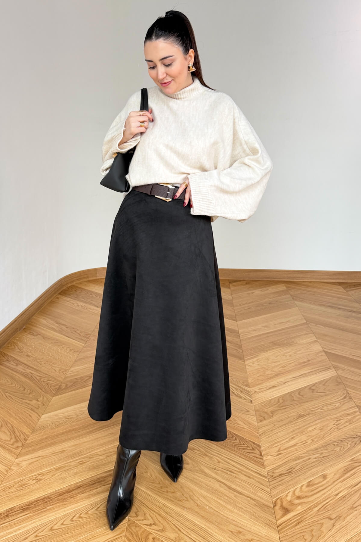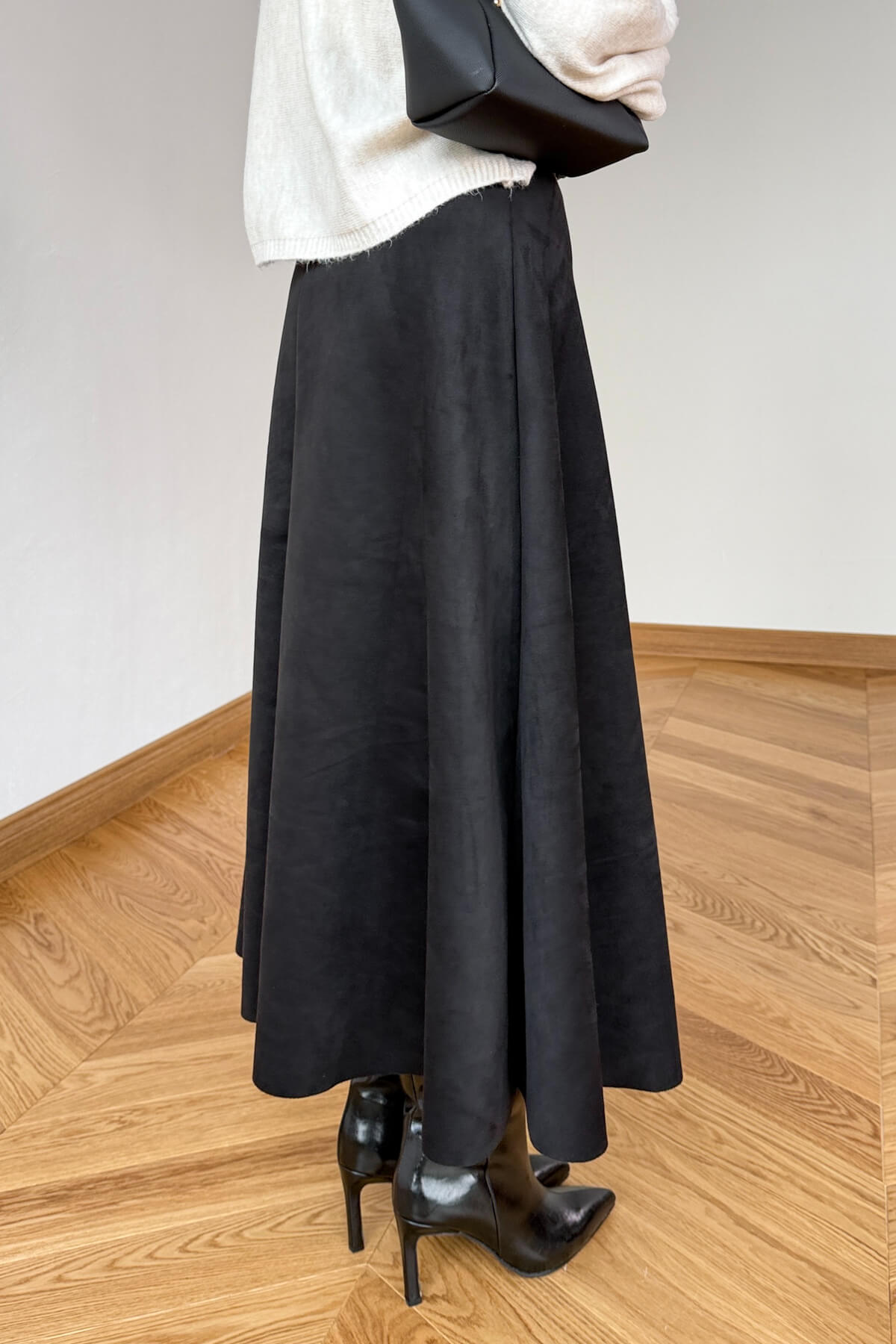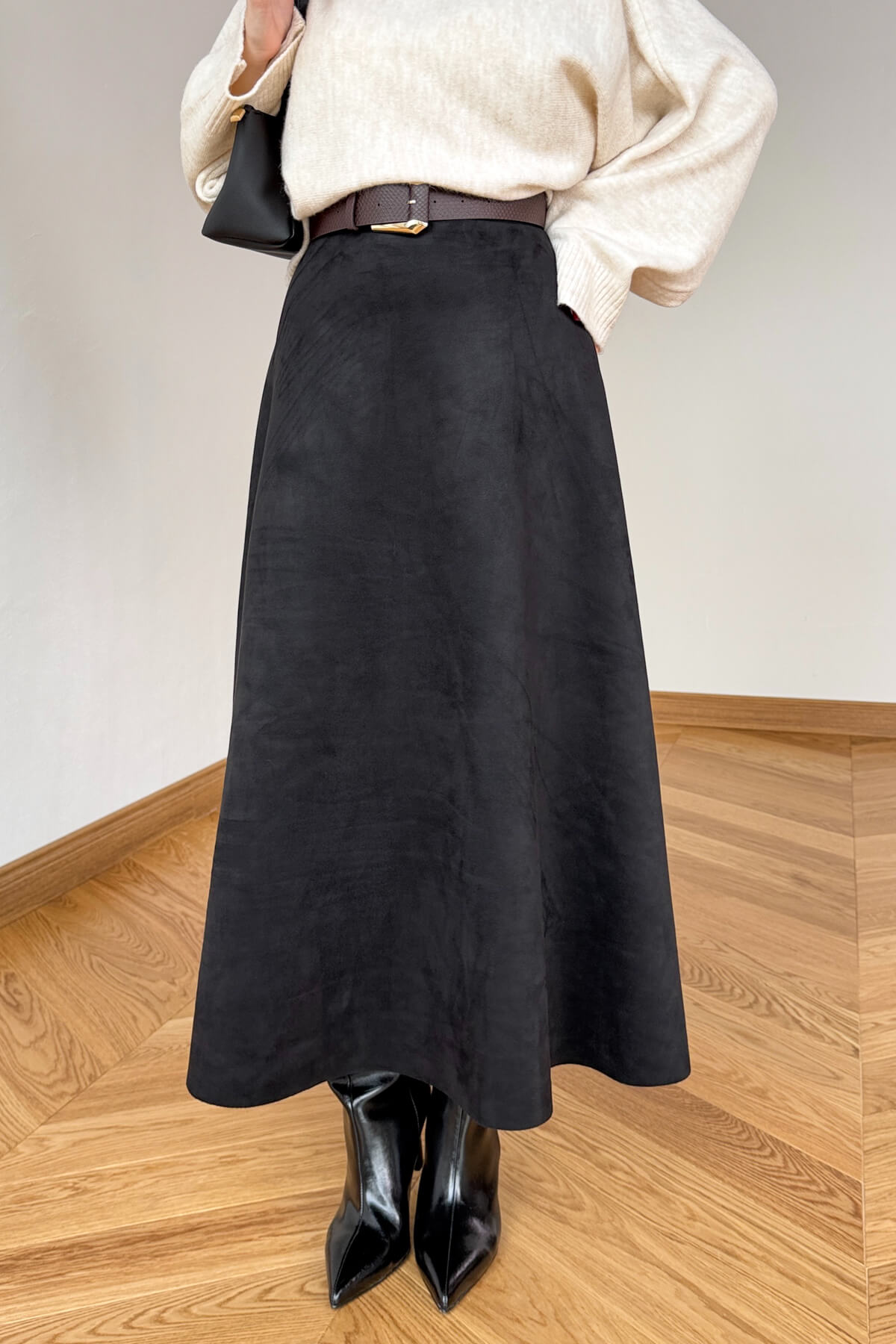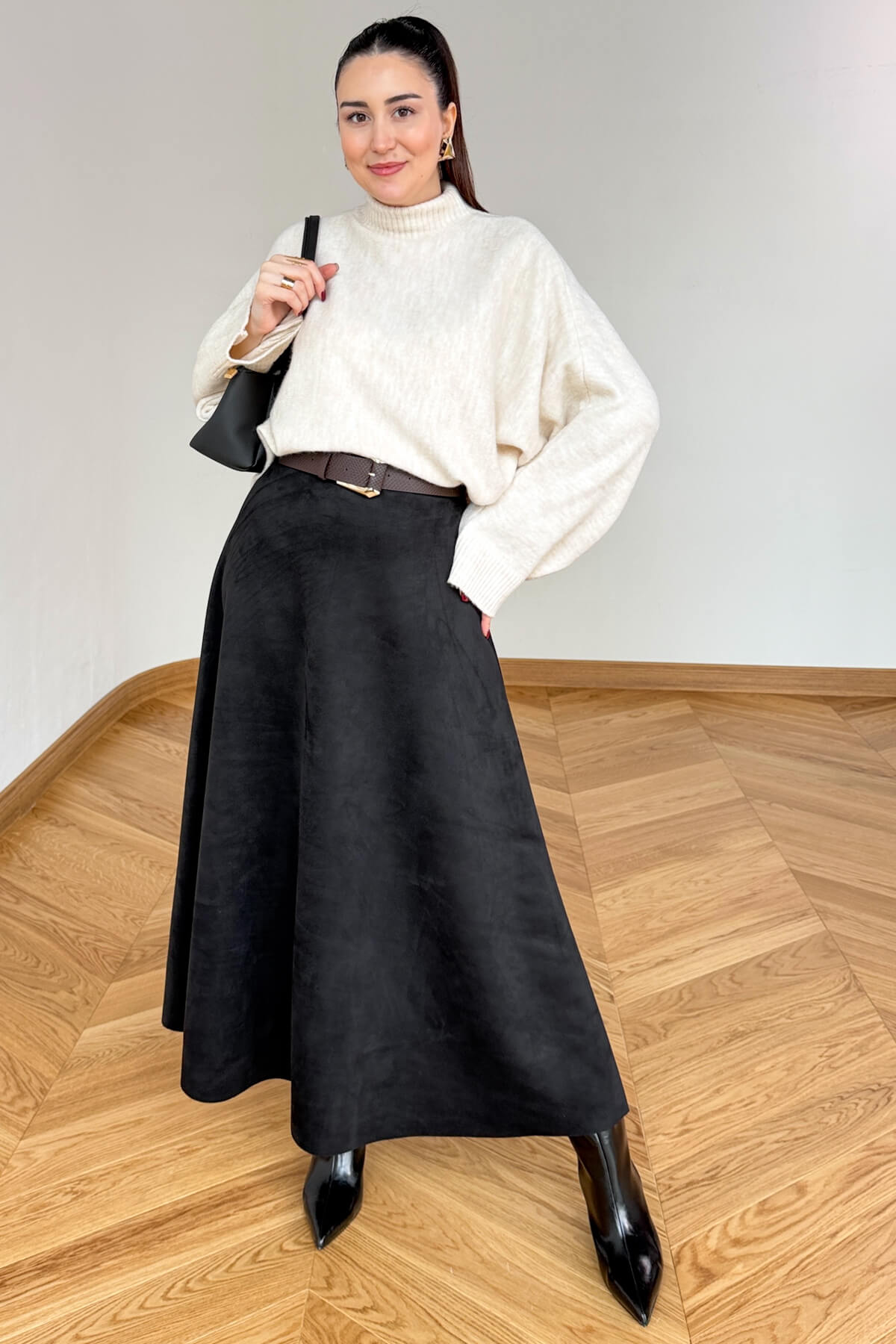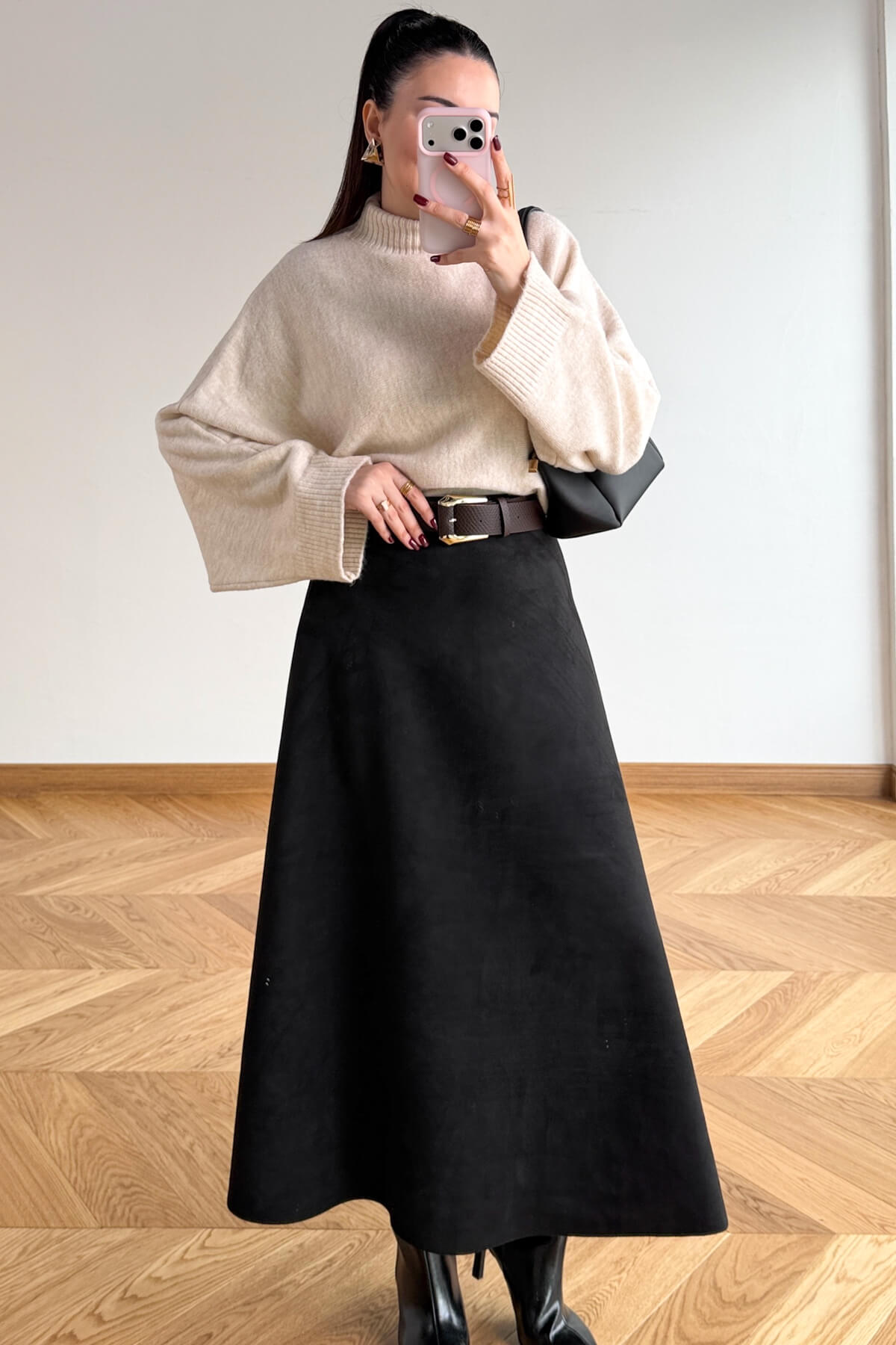 Açıklama: Süet dokunun zarafetini ve yumuşak tuşesini gardırobunuza taşıyan bu tasarım, zamansız şıklığın anahtarı. 95 cm uzunluğundaki ideal boyu ve belden aşağıya genişleyen çan formuyla her bedende kusursuz ve zarif bir duruş sergiler. Etek ucundaki özel dalgalı kesim detayı, sadeliğe modern ve romantik bir hareket katarak stilinizi bir adım öne taşır.