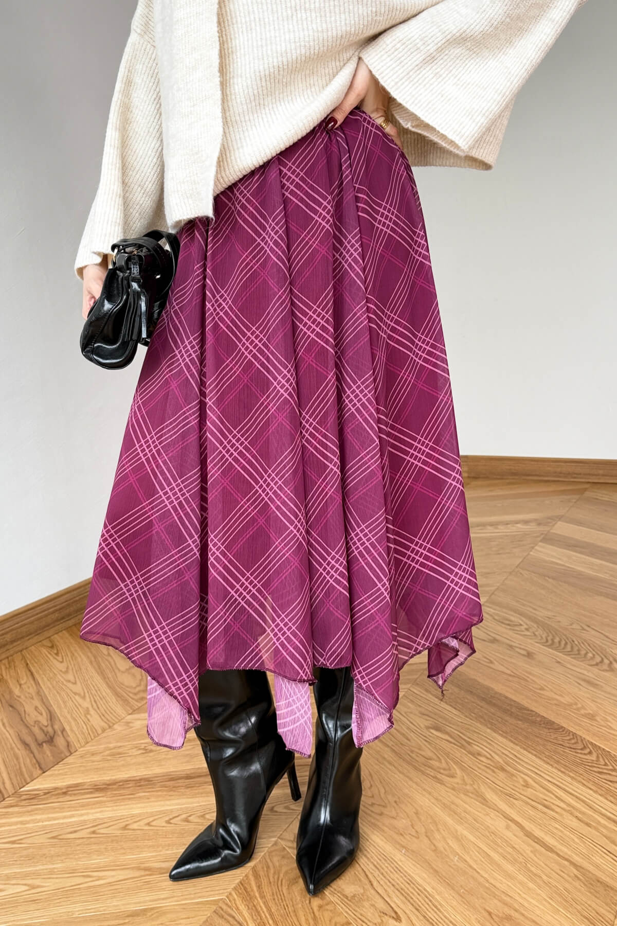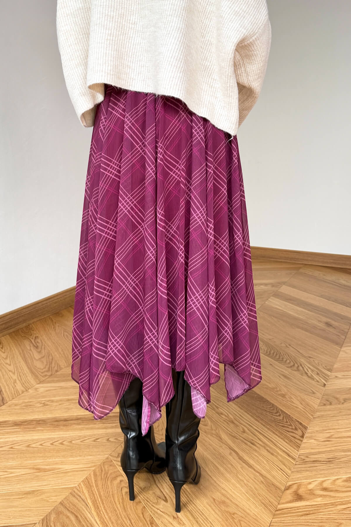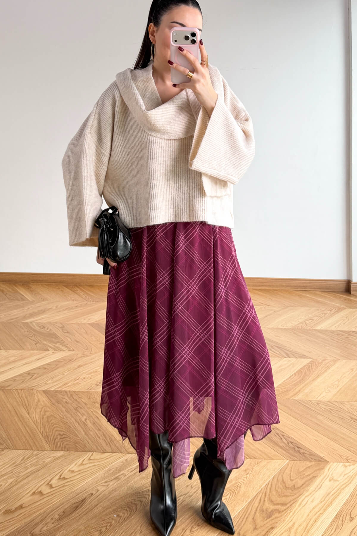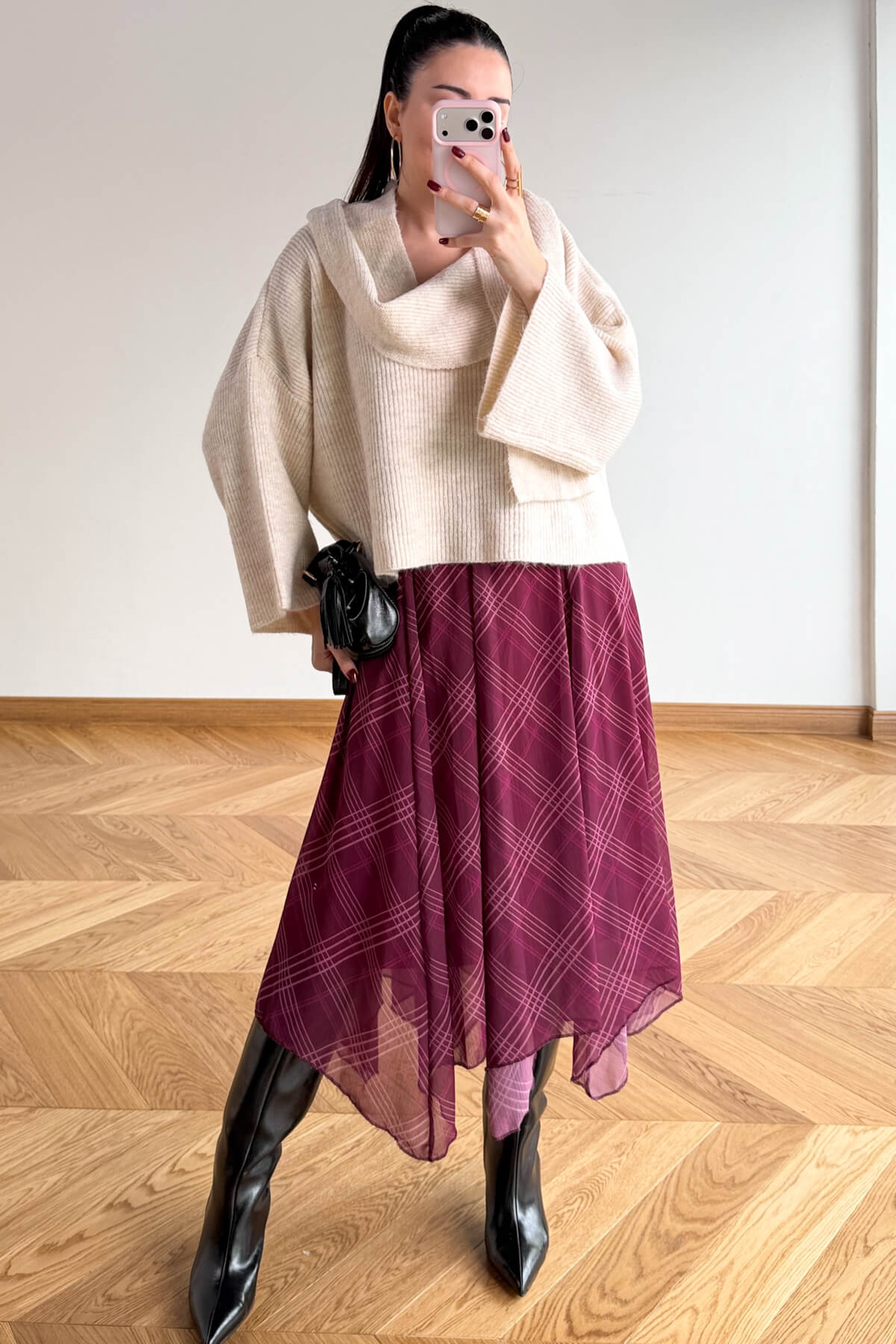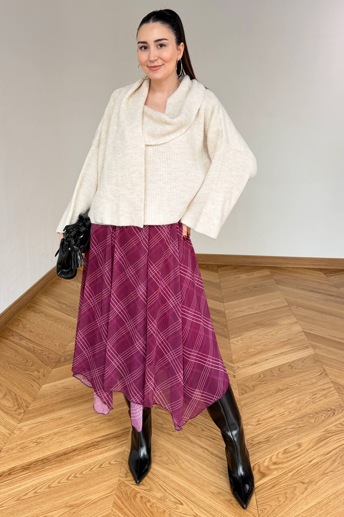 Geometrik çizgilerin modern tavrını, asimetrik kesimin özgür ruhuyla birleştiren bu etek, mevsim geçişlerinin favori parçası olmaya aday. Lacivert, mürdüm ve kahve tonlarının zengin uyumuyla tasarlanan model, 90 cm’lik ideal uzunluğu ve iç göstermeyen astarlı yapısı ile konforlu bir şıklık sunuyor. Uçuşan hafif kumaşı ve hareketli etek uçları sayesinde her adımda zarif ve akışkan bir silüet yaratıyor.