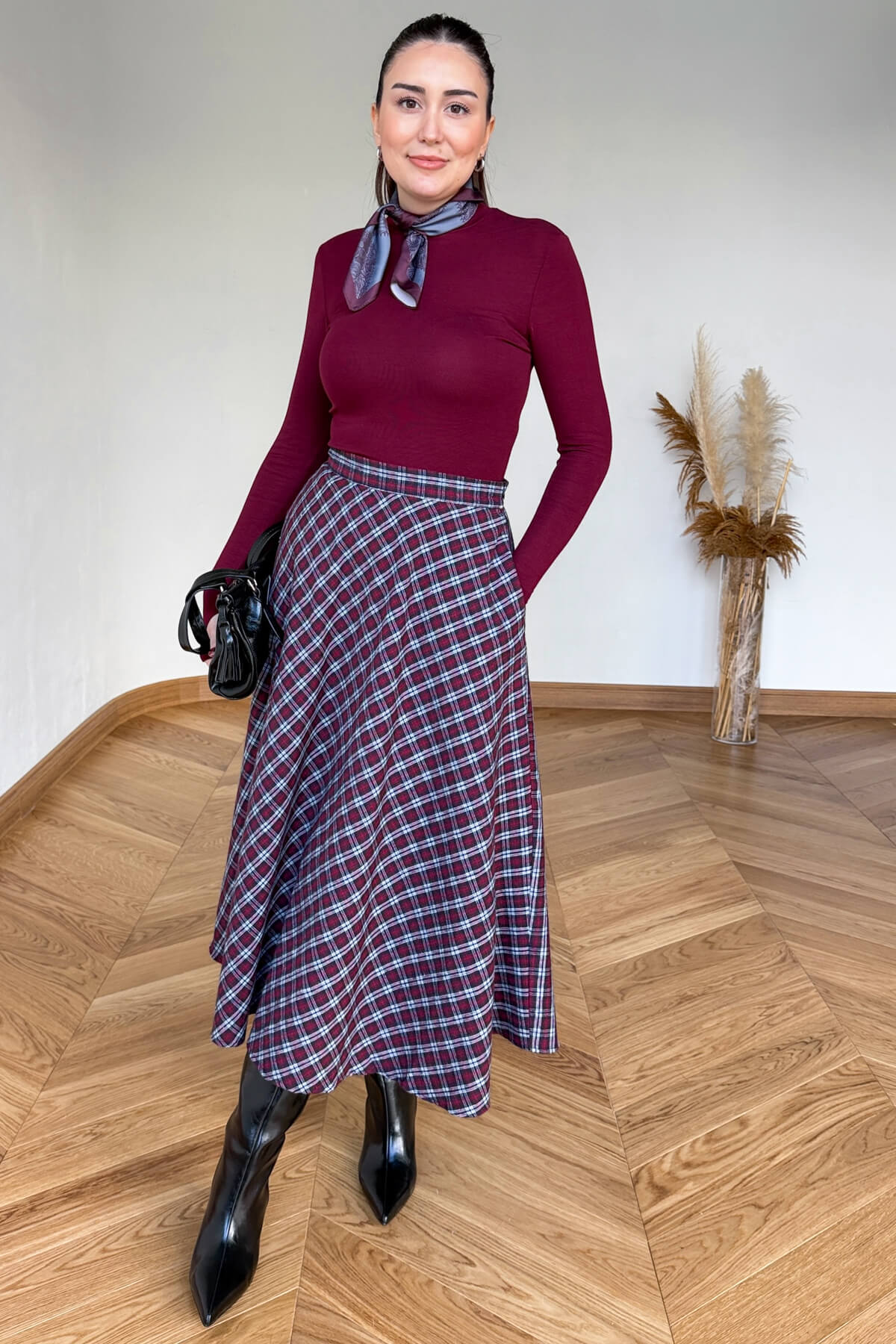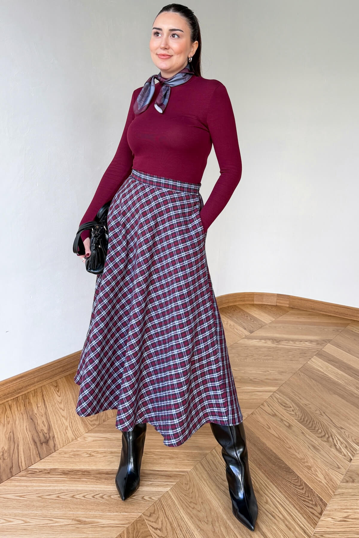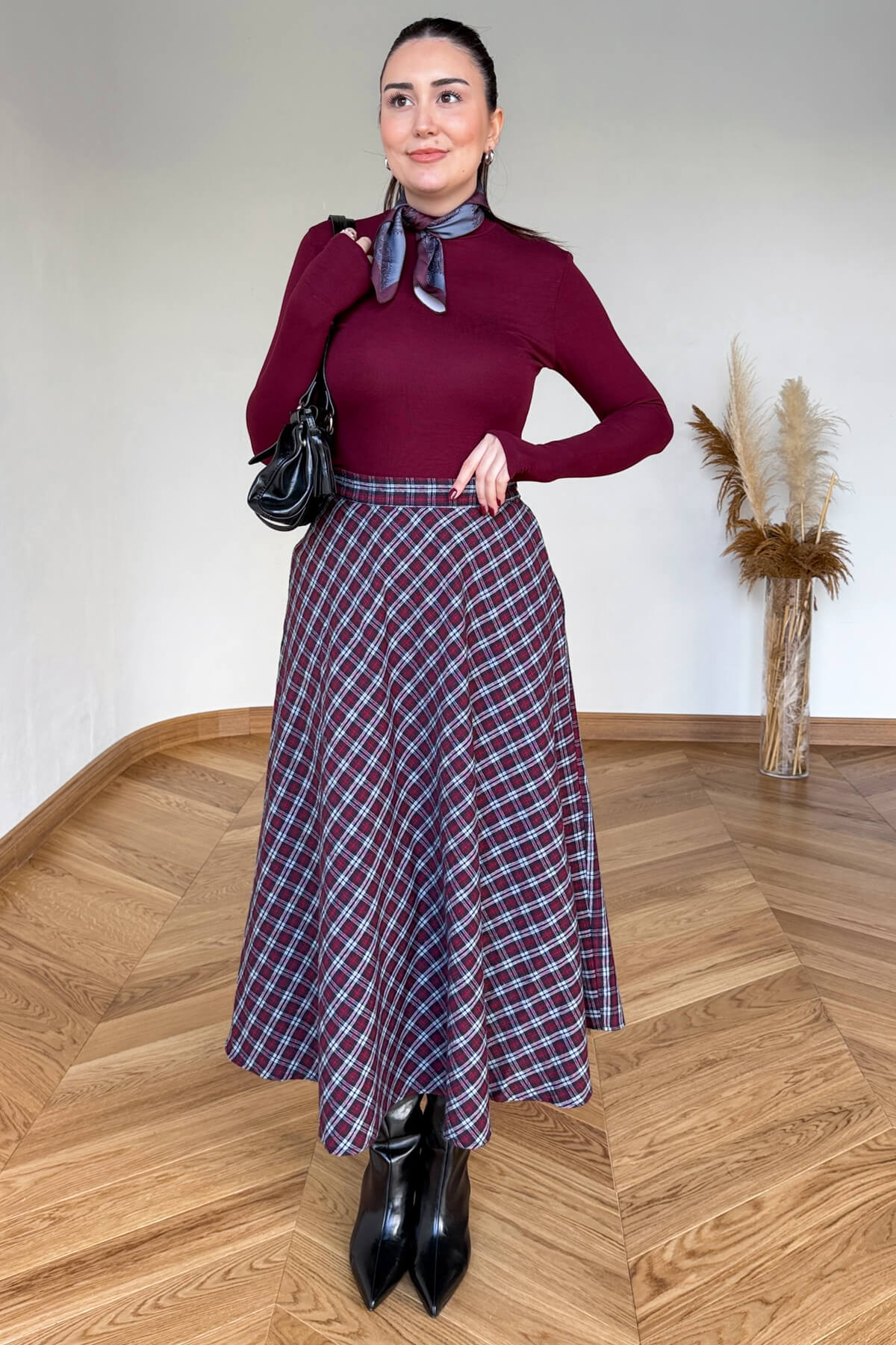 Ekose desenin nostaljik ve sofistike havasını günümüze taşıyan bu maksi etek, gardırobunuzun en karakteristik parçalarından biri olacak. 90 cm uzunluğundaki ideal boyu ve aşağıya doğru genişleyen A-form kesimi, her adımda zarif ve akışkan bir silüet oluşturur. Yandan fermuarlı tasarımı belinize kusursuzca otururken, yanlarda bulunan gizli cep detayları şıklığı konforla buluşturur. Tok duruşlu kumaşı sayesinde mevsim geçişlerinde ve soğuk havalarda stilinizden ödün vermeden kullanabilirsiniz.